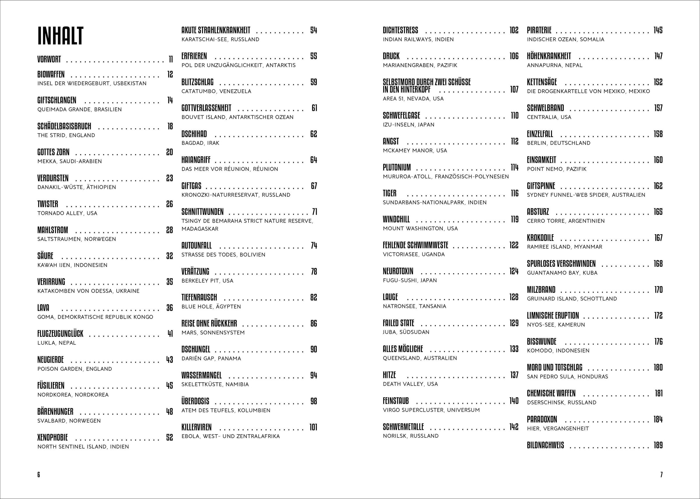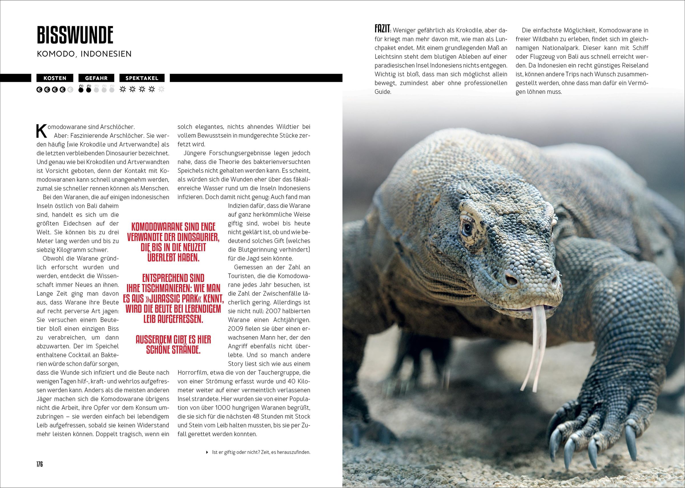 Dieser Atlas nimmt Sie mit auf eine Tour rund um die Welt, zu den gefährlichsten Orten, die Mensch und Natur geschaffen haben. Jenseits der ausgetretenen Pfade erwarten Sie Seen aus purer Säure, angriffslustige Eingeborene, haufenweise Giftschlangen, unsichtbare Giftgaswolken und viele andere Risiken, mit denen Reisende ihre Lebenserfahrung vergrößern und ihre Lebenserwartung verkleinern können.