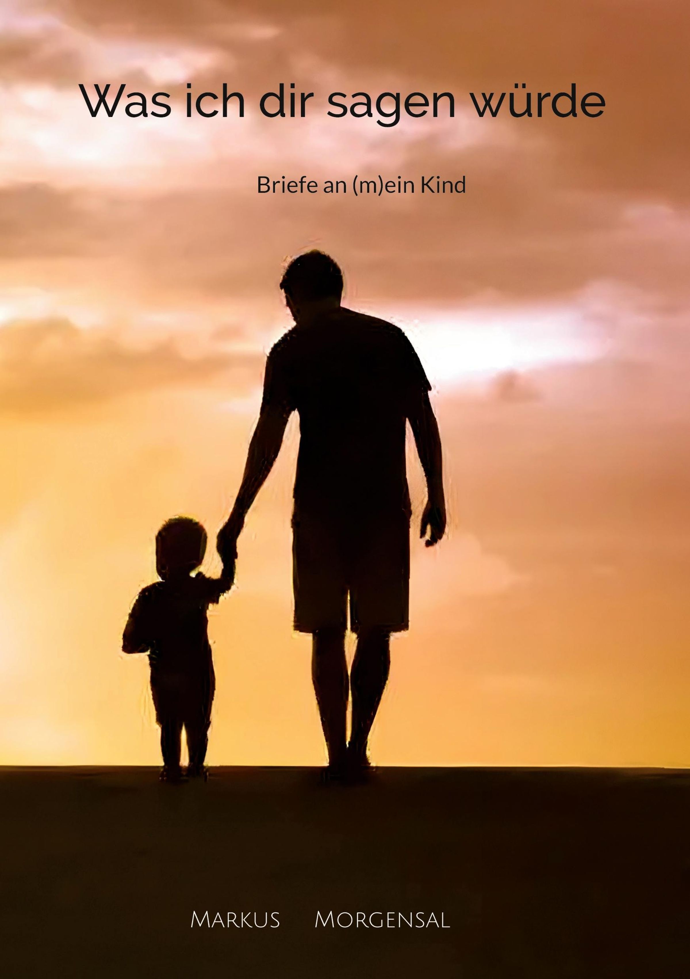 "Was ich dir sagen würde. Briefe an (m)ein Kind." Eine Silhouette von Vater und Kind bei Sonnenuntergang., Buch