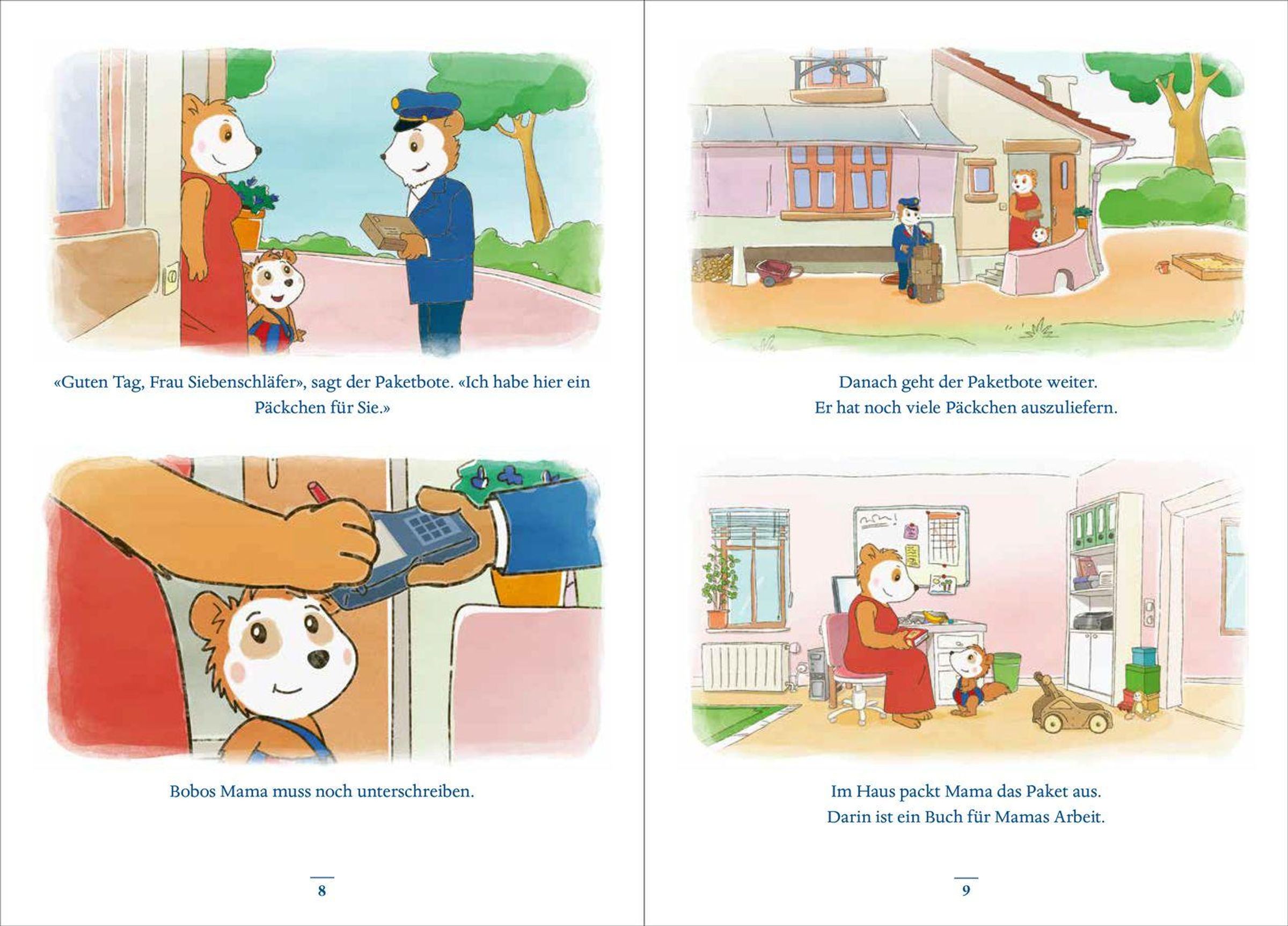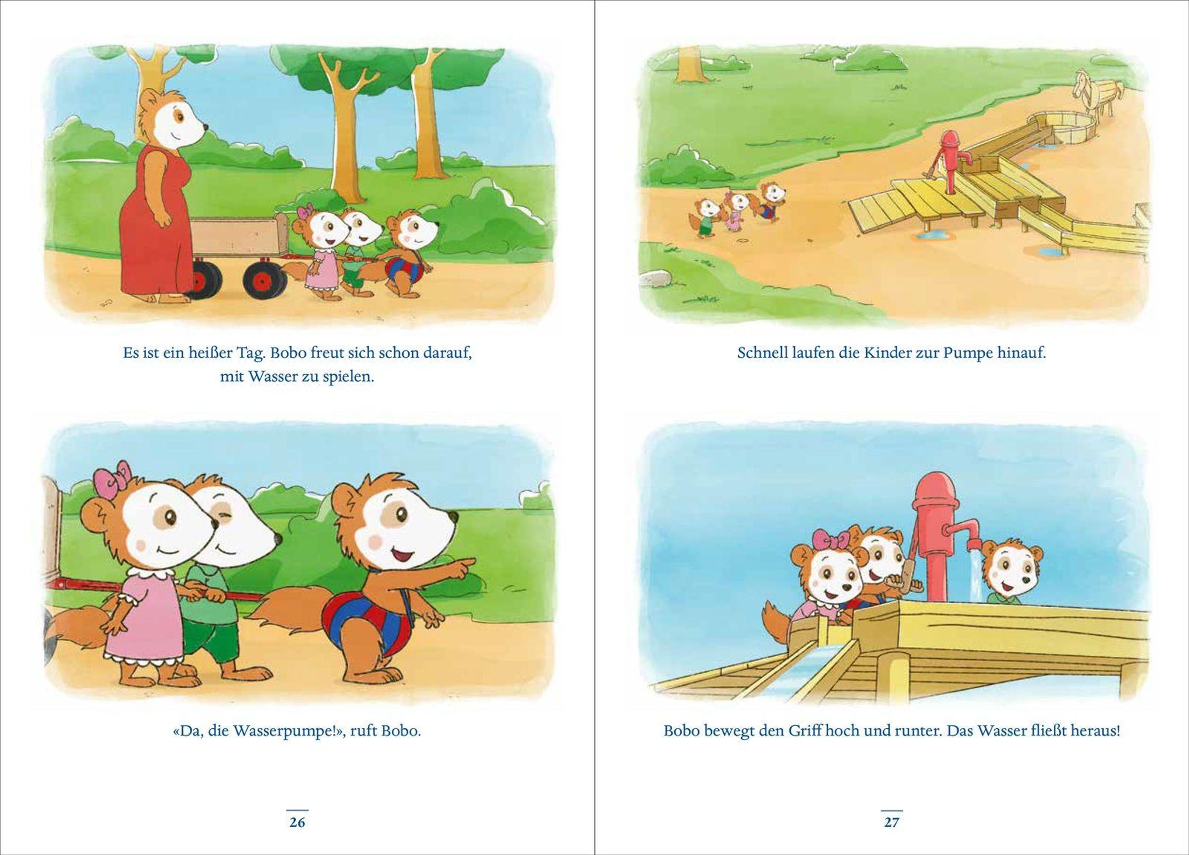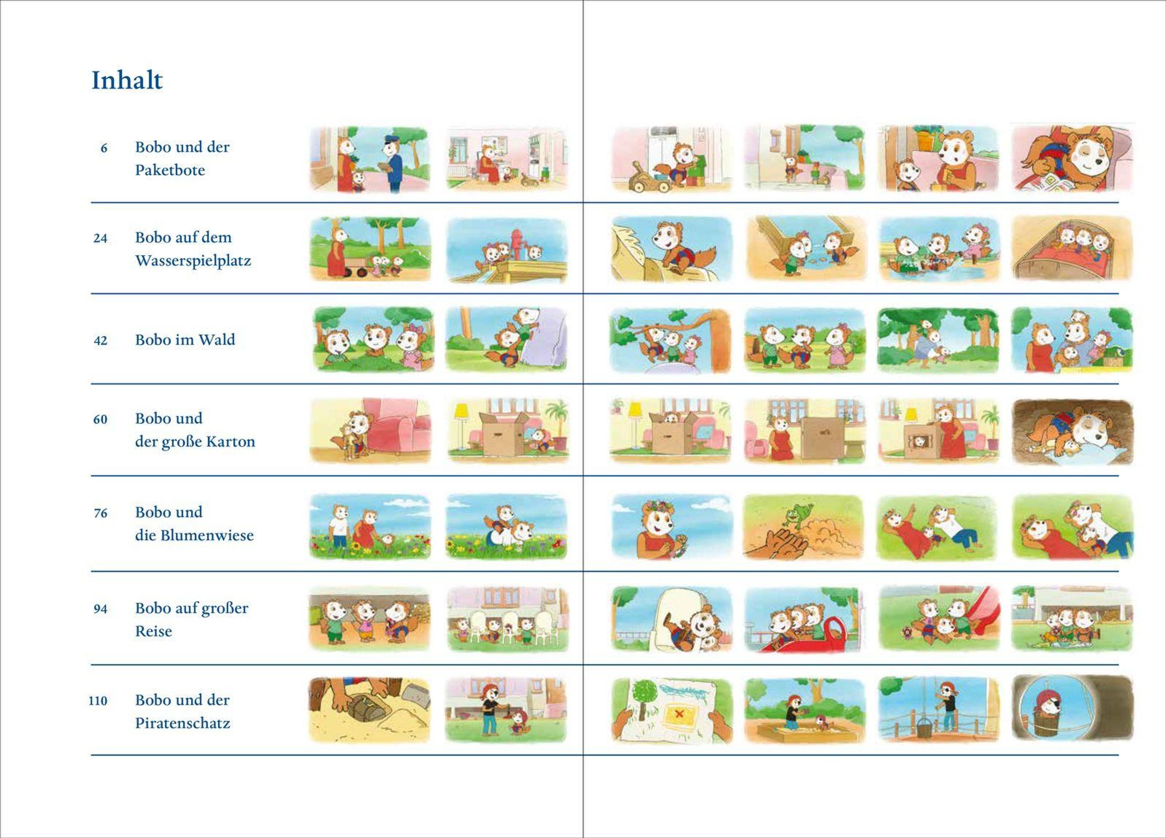 Mit Bobo machen alle kleinen Alltagsabenteuer Spaß, ob drinnen oder draußen! Bobo spielt mit Mama Paketbote und baut sich aus einem großen Pappkarton ein Haus. Er sucht im Garten nach einem Piratenschatz, sammelt im Wald Blaubeeren und spielt mit den anderen Kindern auf dem tollen Wasserspielplatz. Und am Ende jeder Geschichte schläft Bobo natürlich wie immer zufrieden ein.
