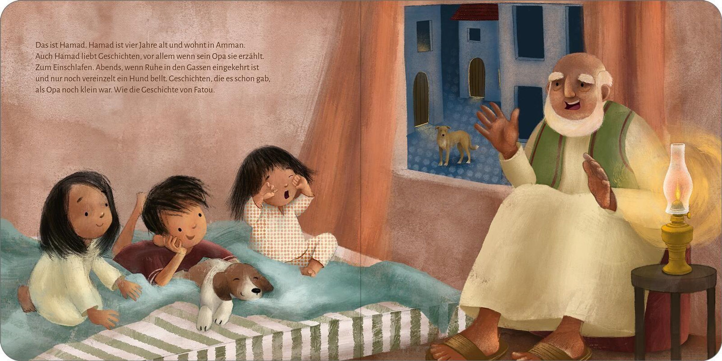 Pia ist zwei Jahre alt. Sie lebt in Deutschland und liebt Geschichten. Wie alle Kinder. Überall auf der Welt. Am schönsten findet sie es, wenn Papa ihr eine zum Einschlafen vorliest. EIne wahre Geschichte soll es sein, aber auch eine Geschichte von weit weg. So wie die Geschichte von Hamad ...
