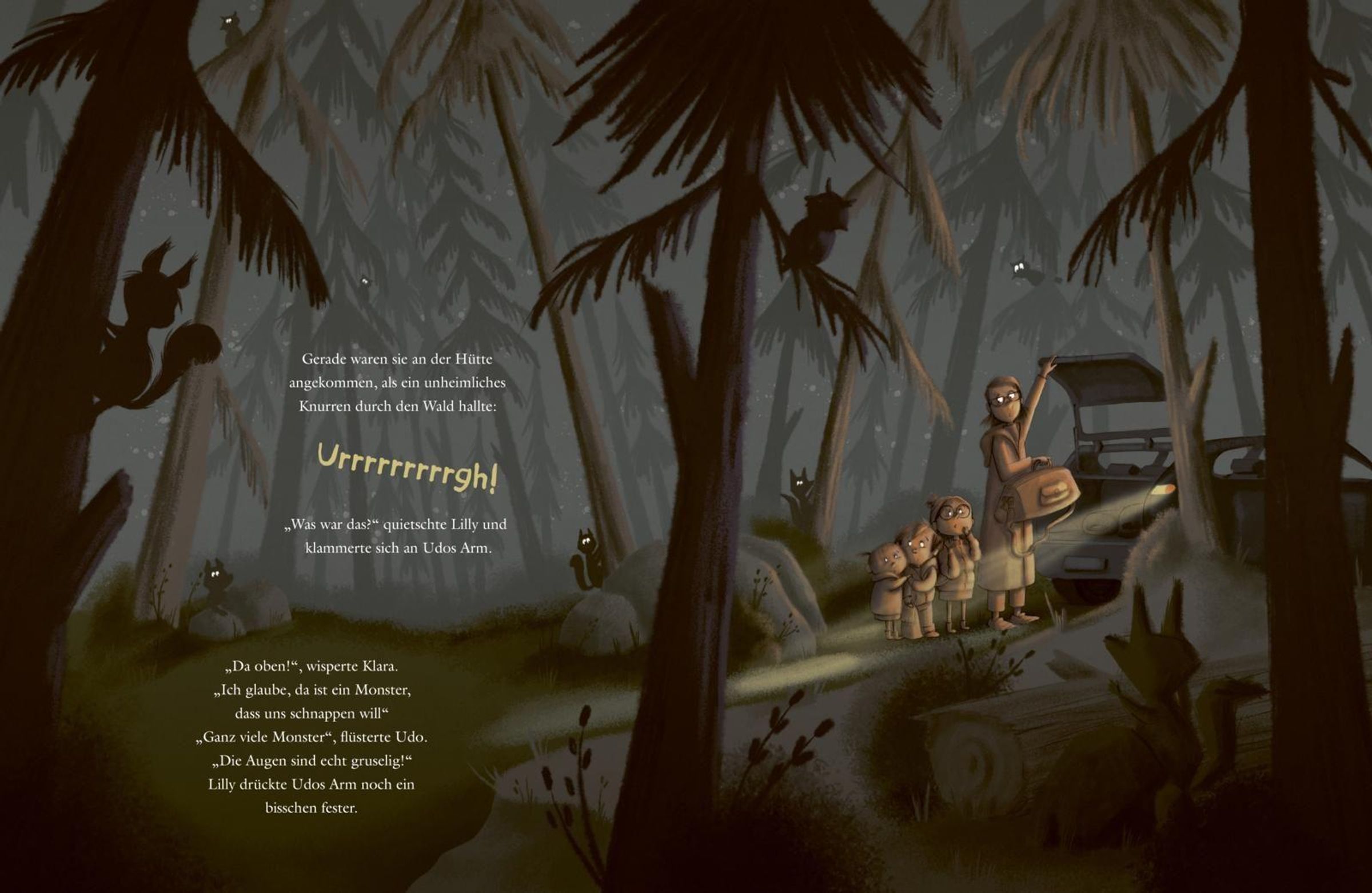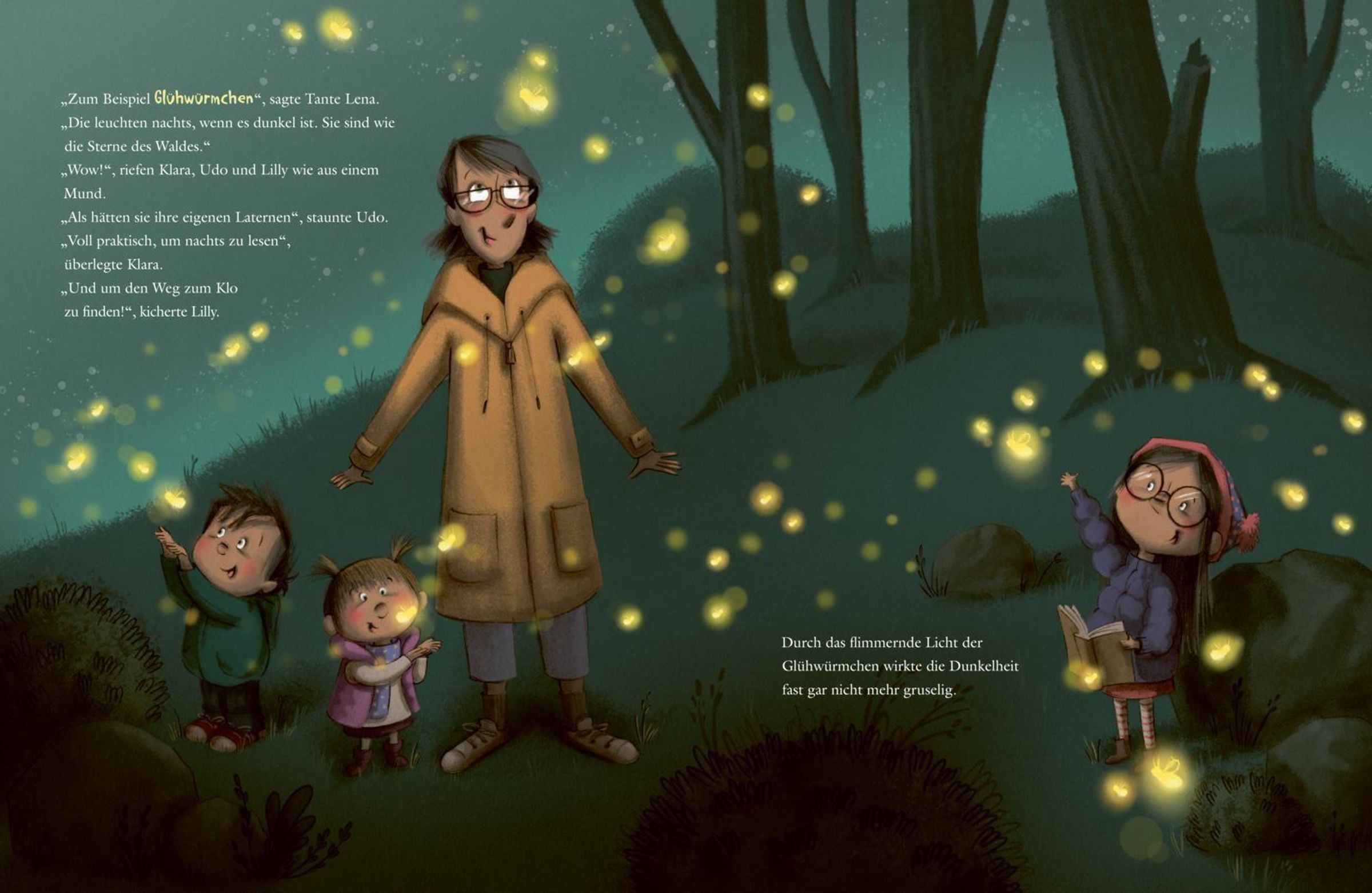 Illustration: Drei Kinder und ein Erwachsener im Wald mit Leuchten., Buch