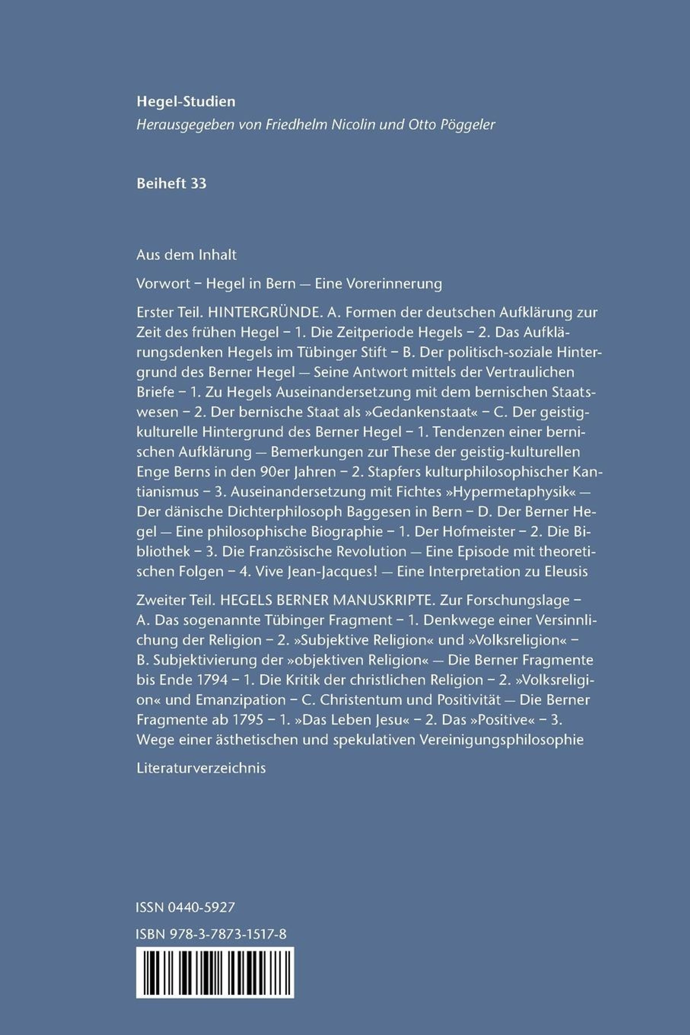 Vorwort ¿ Hegel in Bern ¿ Eine Vorerinnerung Erster Teil. HINTERGRÜNDE. A. Formen der deutschen Aufklärung zur Zeit des frühen Hegel ¿ 1. Die Zeitperiode Hegels ¿ 2. Das Aufklärungsdenken Hegels im Tübinger Stift ¿ B. Der politisch-soziale Hintergrund des Berner Hegel ¿ Seine Antwort mittels der Vertraulichen Briefe ¿ 1. Zu Hegels Auseinandersetzung mit dem bernischen Staatswesen ¿ 2. Der bernische Staat als >>Gedankenstaat<< ¿ C. Der geistig-kulturelle Hintergrund des Berner Hegel ¿ 1. Tendenzen einer bernischen Aufklärung ¿ Bemerkungen zur These der geistig-kulturellen Enge Berns in den 90er Jahren ¿ 2. Stapfers kulturphilosophischer Kantianismus ¿ 3. Auseinandersetzung mit Fichtes >>Hypermetaphysik<< ¿ Der dänische Dichterphilosoph Baggesen in Bern ¿ D. Der Berner Hegel ¿ Eine philosophische Biographie ¿ 1. Der Hofmeister ¿ 2. Die Bibliothek ¿ 3. Die Französische Revolution ¿ Eine Episode mit theoretischen Folgen ¿ 4. Vive Jean-Jacques! ¿ Eine Interpretation zu Eleusis Zweiter Teil. HEGELS BERNER MANUSKRIPTE. Zur Forschungslage ¿ A. Das sogenannte Tübinger Fragment ¿ 1. Denkwege einer Versinnlichung der Religion ¿ 2. >>Subjektive Religion<< und >>Volksreligion<< ¿ B. Subjektivierung der >>objektiven Religion<< ¿ Die Berner Fragmente bis Ende 1794 ¿ 1. Die Kritik der christlichen Religion ¿ 2. >>Volksreligion<< und Emanzipation ¿ C. Christentum und Positivität ¿ Die Berner Fragmente ab 1795 ¿ 1. >>Das Leben Jesu<< ¿ 2. Das >>Positive<< ¿ 3. Wege einer ästhetischen und spekulativen Vereinigungsphilosophie Literaturverzeichnis
