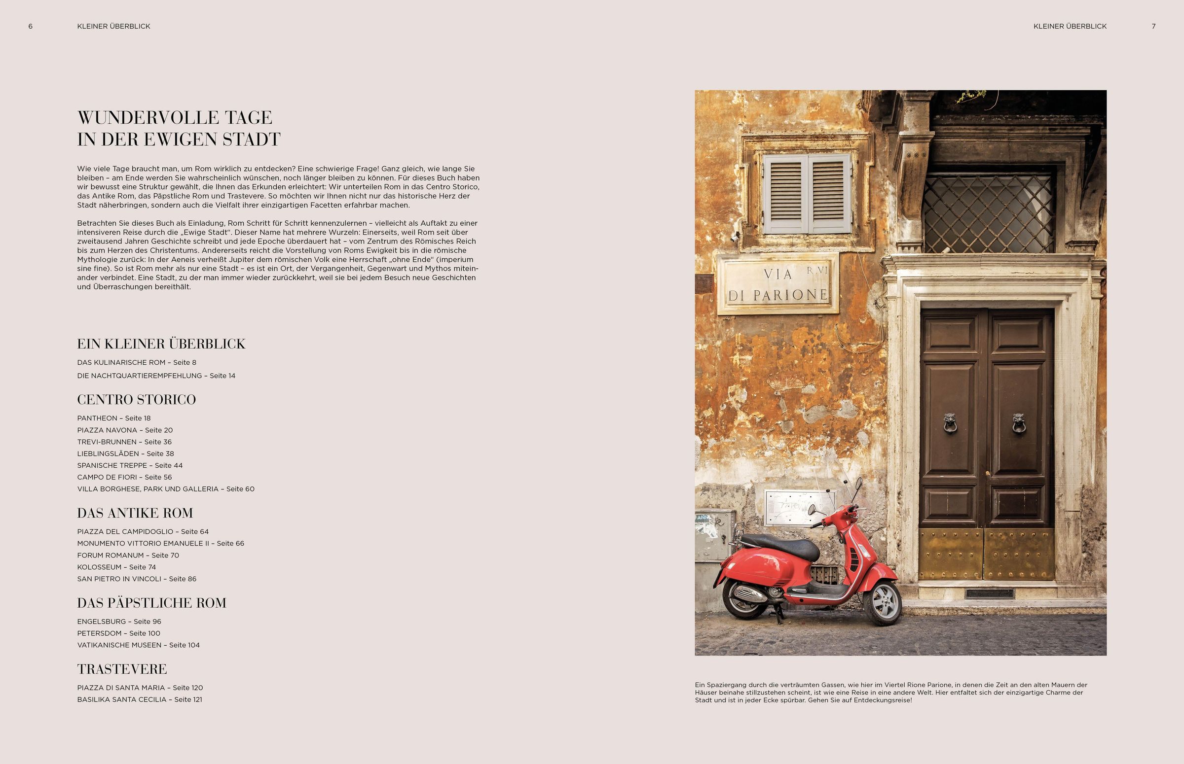 Für dieses Buch haben wir bewusst eine Struktur gewählt, die Ihnen das Erkunden erleichtert: Wir unterteilen Rom in das Centro Storico, das Antike Rom, das Päpstliche Rom und Trastevere. So möchten wir Ihnen nicht nur das historische Herz der Stadt näherbringen, sondern auch die Vielfalt ihrer einzigartigen Facetten erfahrbar machen. Die von uns ausgewählten Orte, Restaurants und besonderen Erlebnisse verbindet eines: ein einzigartiges Flair - damit Sie "Einfach perfekt reisen".