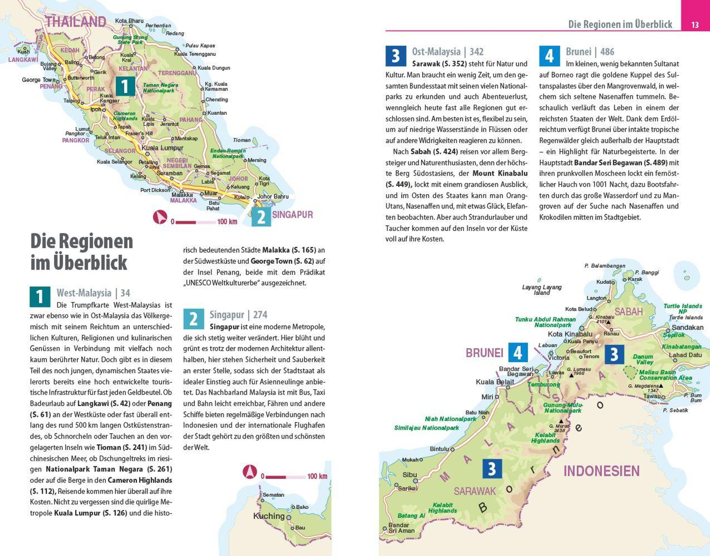 Übersichtsseiten mit den bedeutendsten Regionen im Überblick: Die Westküste Malaysias von Nord nach Süd, Singapur, Ost-Malaysia und Brunei