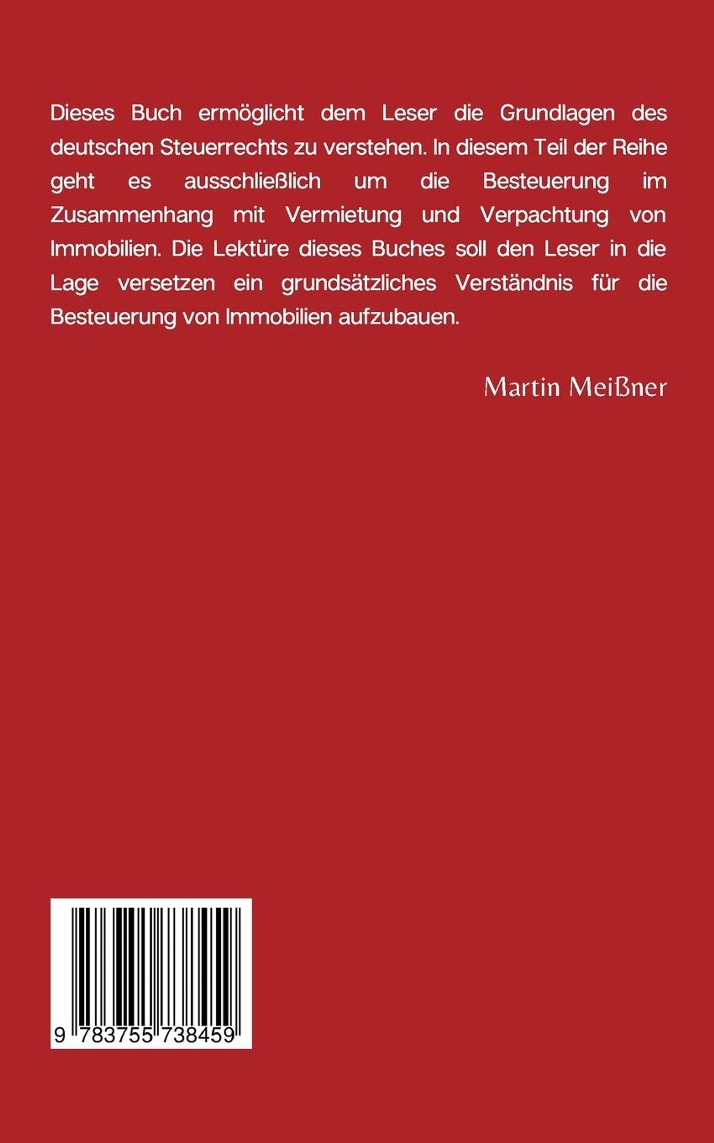 Dieses Buch ermöglicht dem Leser die Grundlagen des deutschen Steuerrechts zu verstehen. In diesem Teil der Reihe geht es um das gesamte Thema der Besteuerung von Immobilien. Die Lektüre dieses Buches soll den Leser in die Lage versetzen seine ein grundlegendes Verständnis für die Besteuerung von Immobilien aufbauen. Es werden systematisch die relevanten Steuerarten beleuchtet, die verschiedenen Rechtsformen betrachtet und Tipps zur steuerlichen Optimierung gegeben.