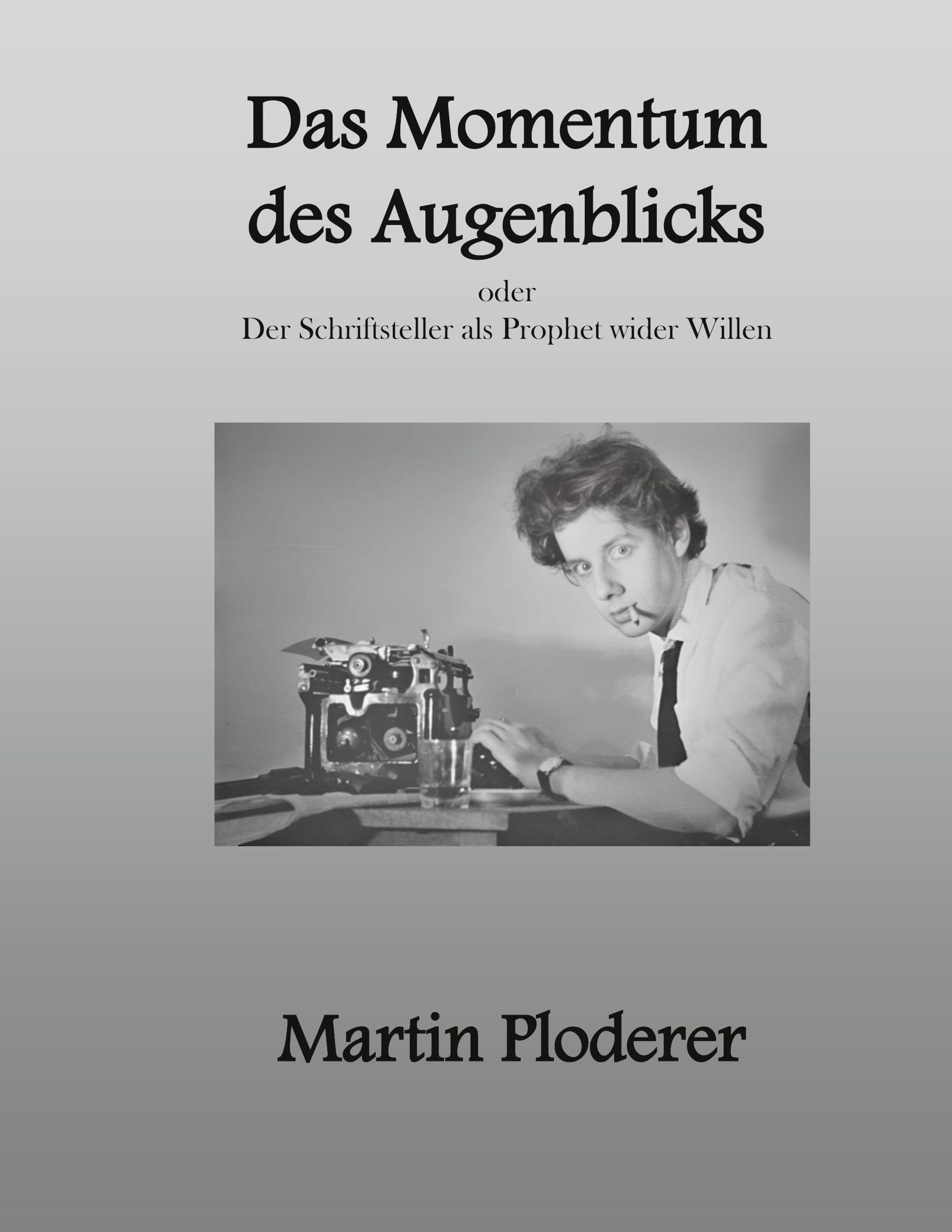 Text: „Das Momentum des Augenblicks oder Der Schriftsteller als Prophet wider Willen, Martin Ploderer.“ Schwarz-Weiß-Foto zeigt einen Mann mit Schreibmaschine., Buch