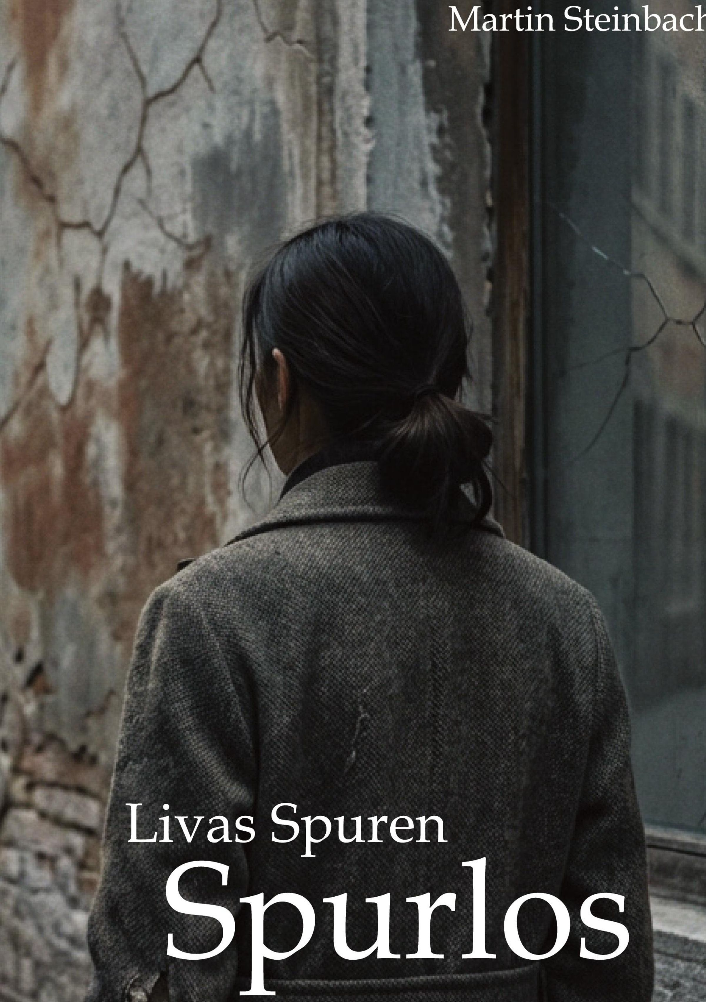 "Livas Spuren, Spurlos, Martin Steinbach." Eine Frau steht vor einer bröckelnden Wand, der Blick abgewandt., Buch