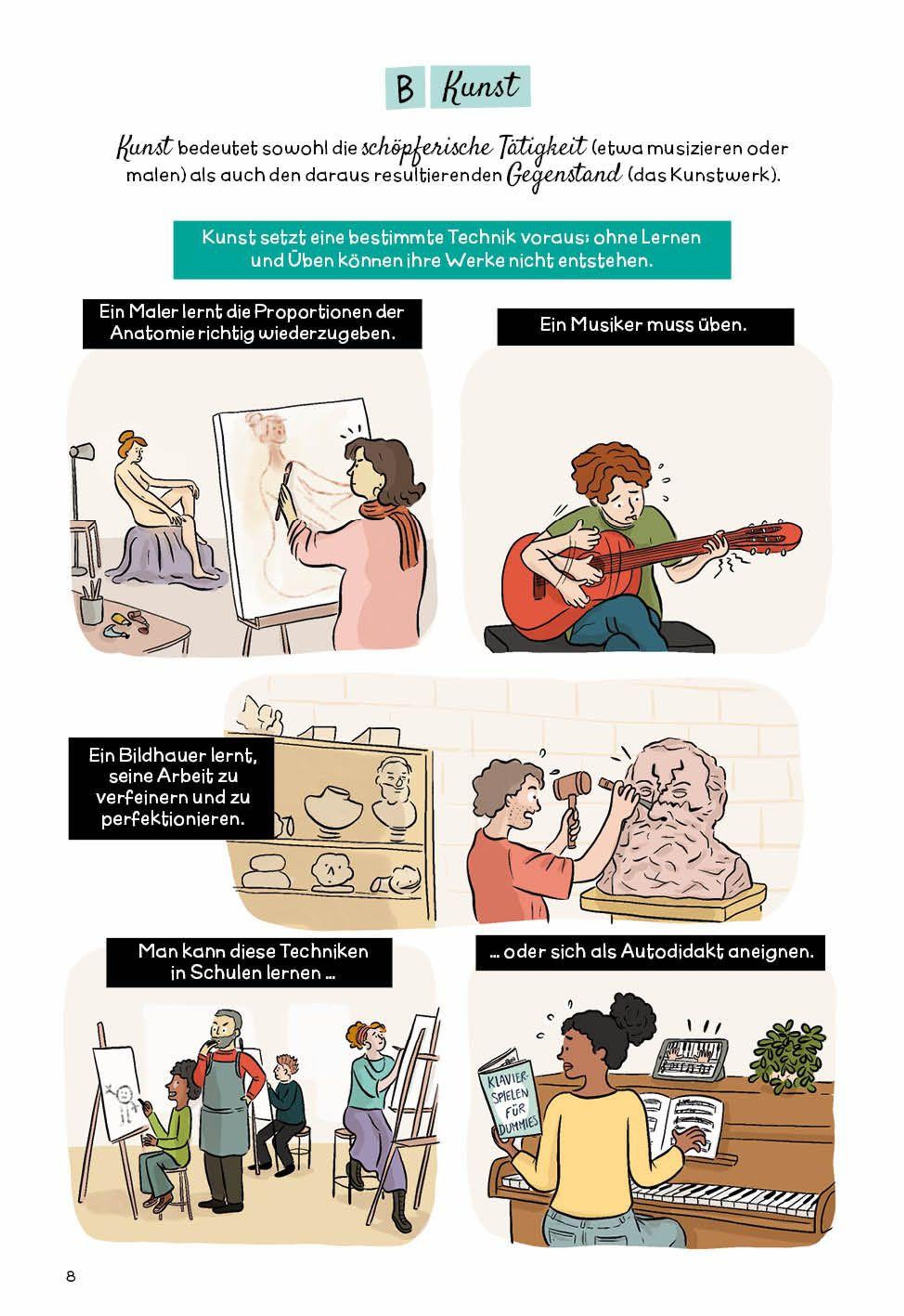 Kunst kommt von ko¿nnen, aber nicht alles, was gekonnt gemacht ist, ist deshalb wirklich Kunst. Dazu muss noch etwas anderes kommen, etwas, das die Menschen mehr oder anders bewegt als ein bloß technisches Kunststu¿ck. Das kann sein, dass ein Kunstwerk ein Beitrag zum Gedächtnis der Menschheit ist, das man ehrfu¿rchtig im Museum bewahrt; es kann auch darauf beruhen, dass ein Kunstwerk etwas ist, das einer ganzen Gesellschaft gefällt und sie so vereinigt; oder im Gegenteil etwas, das etwas darstellt, das fu¿r Konservative ein Skandal ist und mit diesem Skandal die Gesellschaft dazu bringt, sich mit etwas Neuem auseinander- zusetzen, sich zu verändern. Was Kunst jedoch nicht ist, ist einfach eine Imitation der Wirklichkeit. Viele Philosophen seit der Antike haben sich mit Kunst befasst, und haben mit ihrer philosophischen A¿sthetik immer wieder deutlich gemacht, was menschliche Kultur und damit das Menschsein selbst ausmacht.