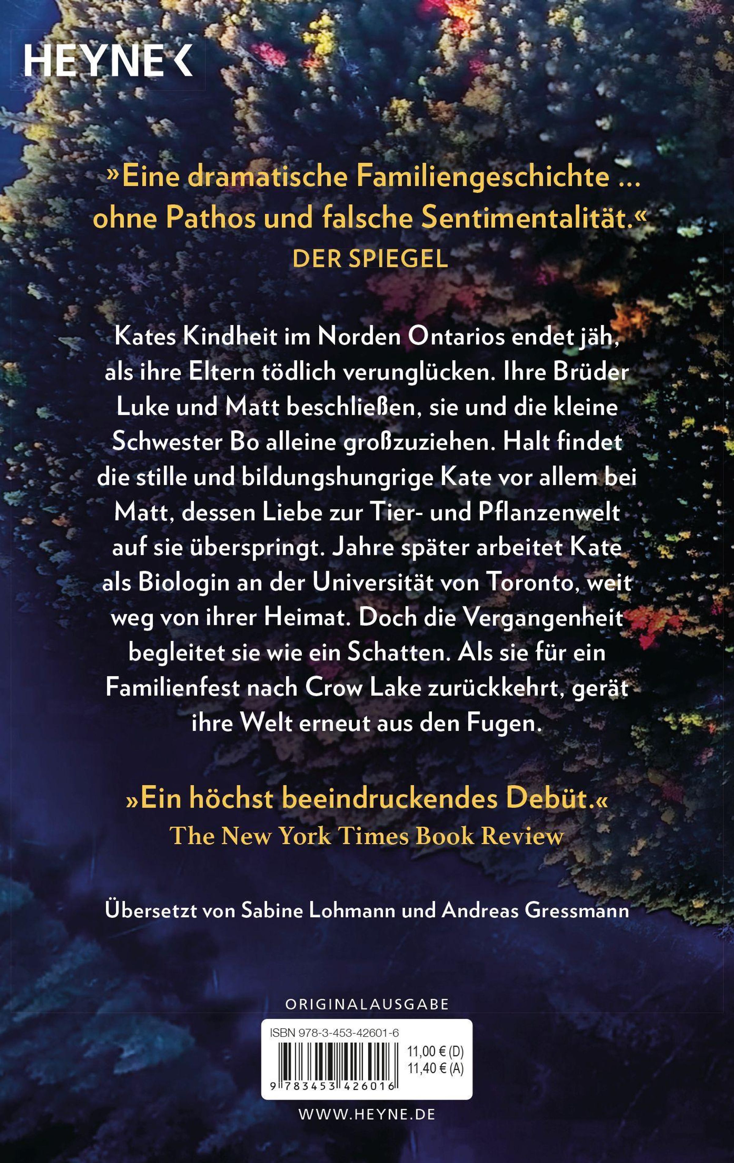 Kates Kindheit im Norden Ontarios endet jäh, als ihre Eltern tödlich verunglücken. Ihre beiden Brüder Luke und Matt beschließen, sie und die kleine Schwester Bo alleine großzuziehen. Halt findet die verschlossene und bildungshungrige Kate vor allem bei Matt, dessen Liebe zur Tier- und Pflanzenwelt auf sie überspringt. Jahre später arbeitet Kate erfolgreich als Biologin an der Universität von Toronto, weit weg von ihrer Heimat. Doch die Geschehnisse von damals schweben immer noch wie ein Schatten über ihr. Als sie für ein Familienfest nach Crow Lake zurückkehrt, gerät ihre Welt erneut aus den Fugen.