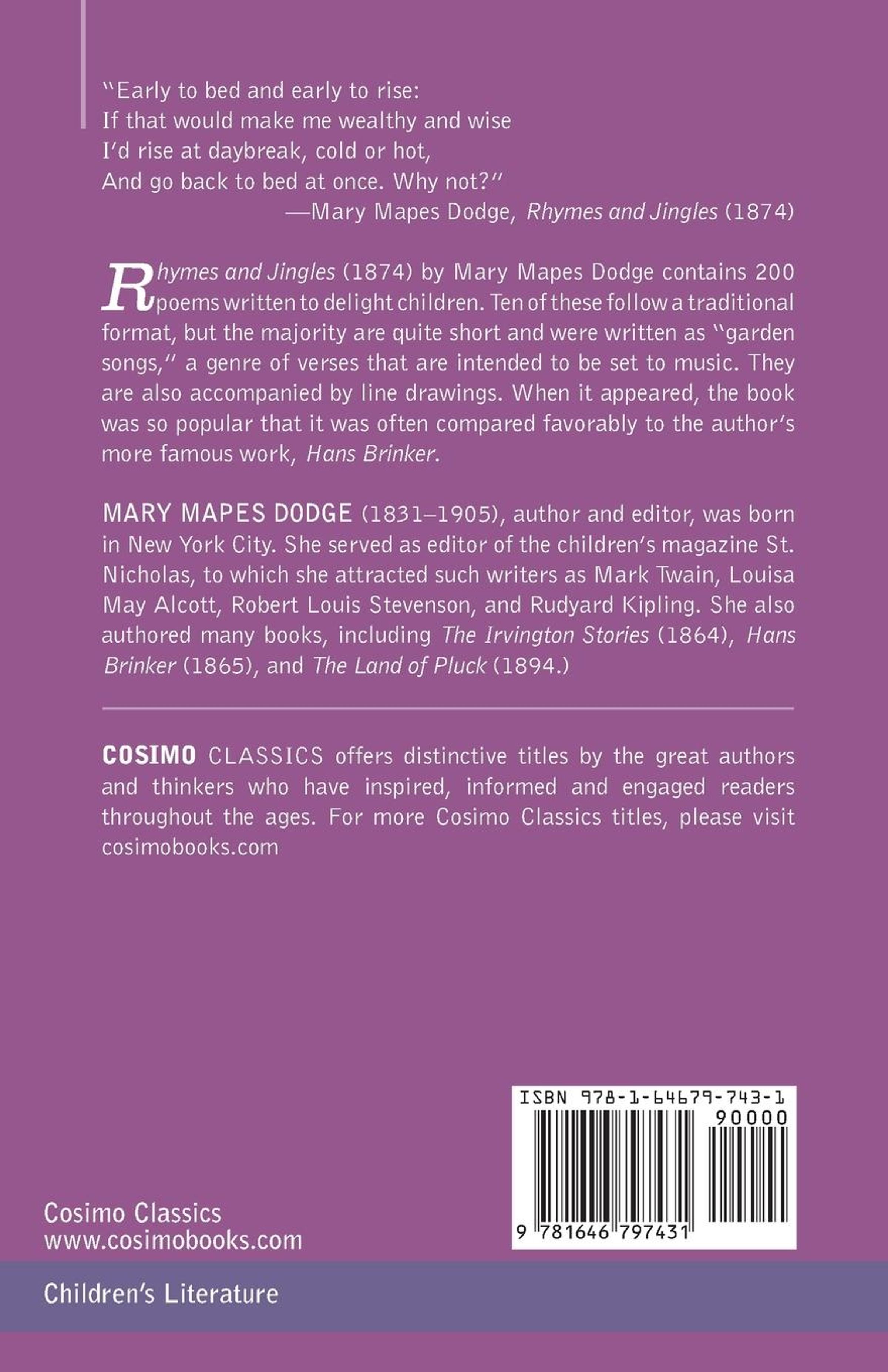 "Early to bed and early to rise: If that would make me wealthy and wise I'd rise at daybreak, cold or hot, And go back to bed at once. Why not?" -Mary Mapes Dodge, Rhymes and Jingles (1874) Rhymes and Jingles (1874) by Mary Mapes Dodge contains 200 poems written to delight children. Ten of these follow a traditional format, but the majority are quite short and were written as "garden songs," a genre of verses that are intended to be set to music. They are also accompanied by line drawings. When it appeared, the book was so popular that it was often compared favorably to the author's more famous work, Hans Brinker.