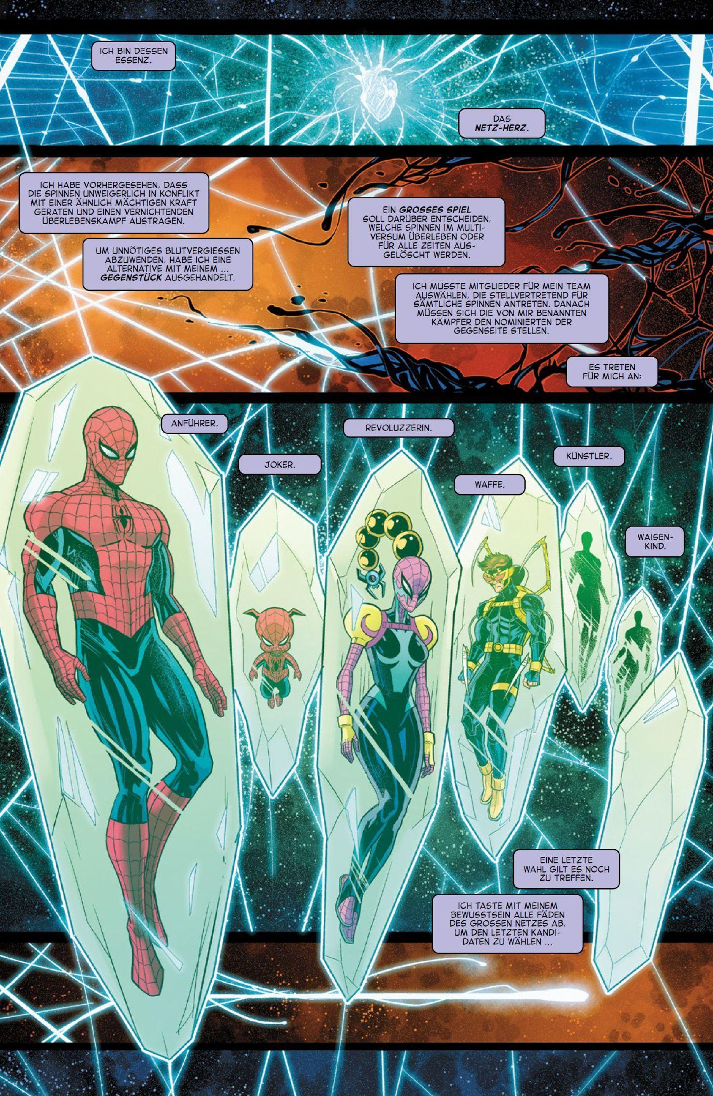 Das Netz-Herz hinter dem Spider-Verse verbindet zwischen Raum und Zeit alle Helden und Heldinnen mit Spinnenkräften. Die Schwarmintelligenz des Venomverse wiederum all jene, die einen Symbionten tragen. Doch nun ist das Multiversum nicht mehr groß genug für beide! Also rekrutieren die beiden jeweils fünf Champions für einen Wettstreit, an dessen Ende nur einer von ihnen weiterexistieren soll. Grenzenlose Spidey- und Symbionten-Action von Kyle Higgins (Batman Eternal), Mat Groom (What If...? Galactus), Luciano Vecchio (Uncanny X-Men), Jim Towe (Spider-Man / Deadpool), Greg Pak (Planet Hulk) und anderen.