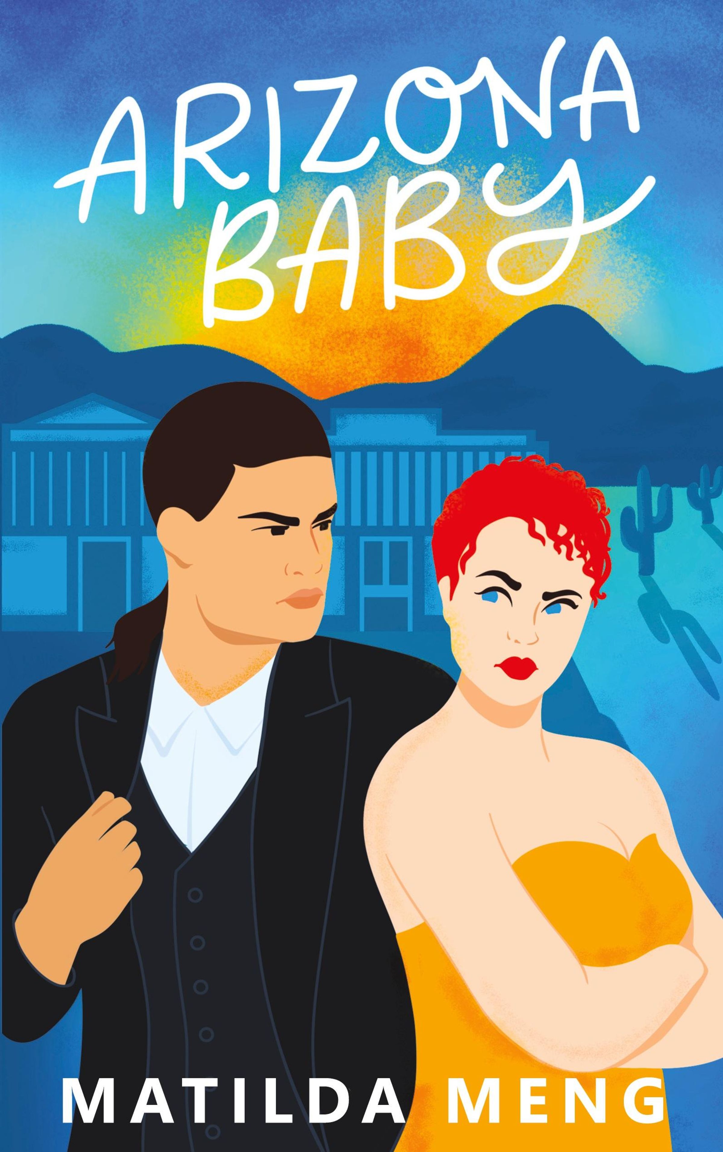 Titel: "ARIZONA BABY". Name: "MATILDA MENG". Illustration: Paar vor Wüstenkulisse, Mann im Anzug, Frau im gelben Kleid., Buch