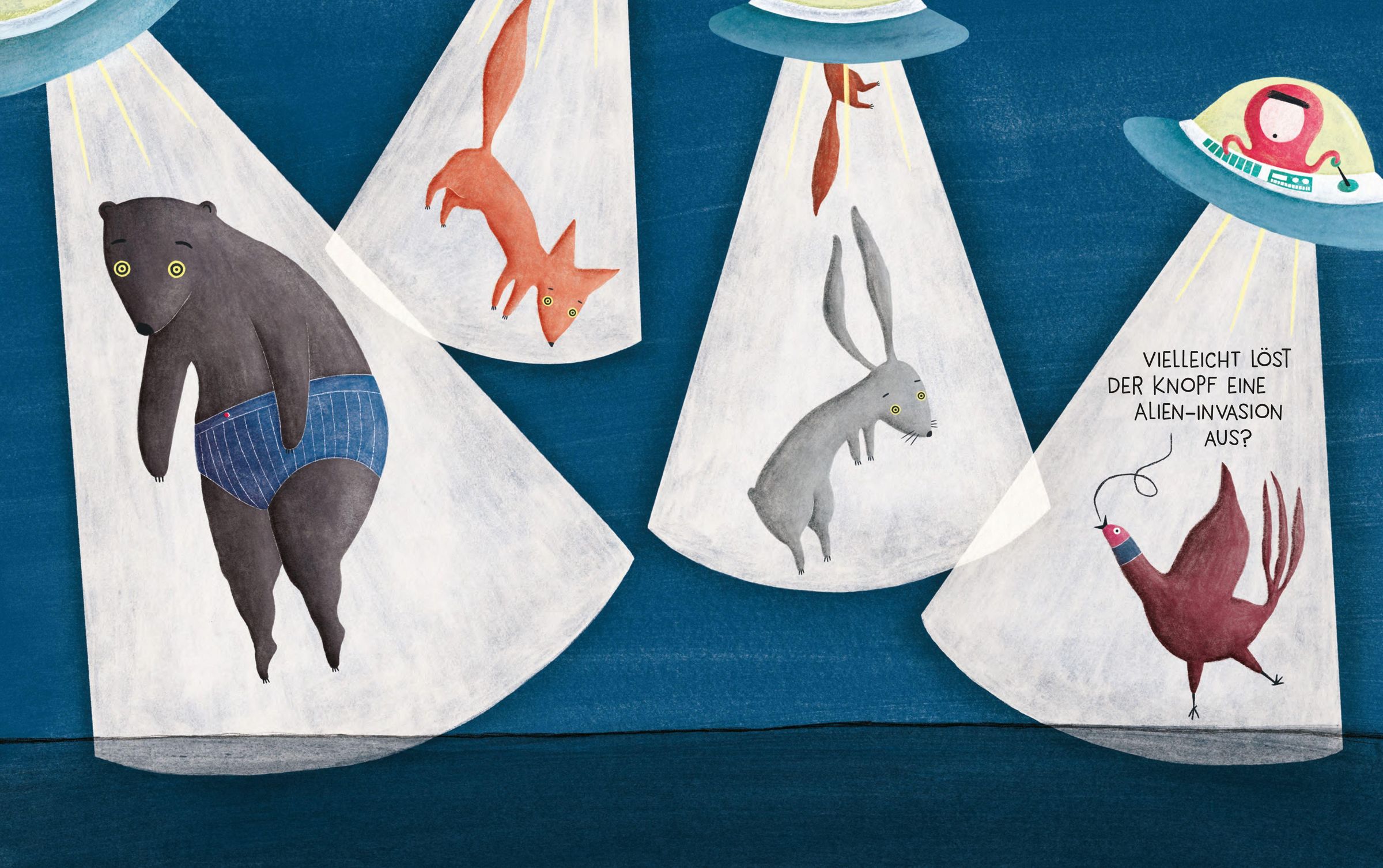 Fuchs, Eichhörnchen, Hase, Bär, Eule und Fasan rätseln: Was ist das bloß für ein Knopf? Was kann er wohl bewirken? Wird etwas Lustiges geschehen, wenn man ihn drückt? Oder eine große Katastrophe? Die Freunde tauschen wilde Theorien aus, diskutieren, ob es eine gute Idee wäre, ihn zu betätigen, oder völliger Wahnsinn. Die Skeptiker unter ihnen gewinnen, sie beschließen, dass niemand den Knopf drücken darf. Am Ende geschieht es aber doch - durch ein kleines Tier, das die ganze Aufregung äußerst unterhaltsam findet.