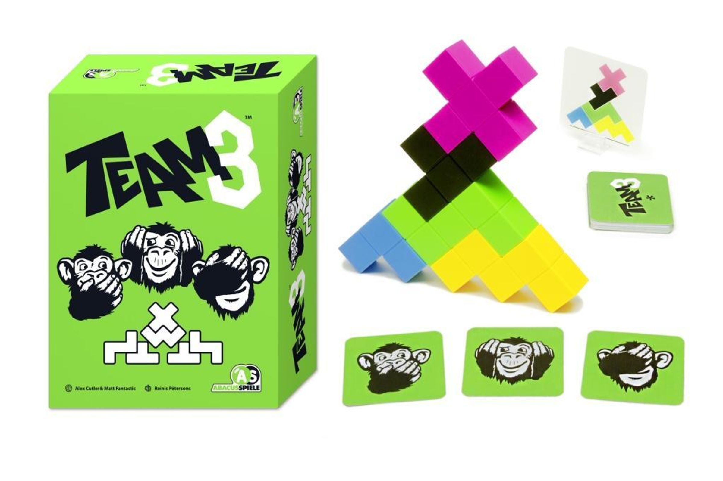 "Nichts sagen, nichts hören, nichts sehen." (frei nach einem japanischen Sprichwort) In TEAM3 muss jeweils ein Team aus 3 Spielern zusammen ein Gebäude bauen. Doch wie soll das funktionieren, wenn: der Architekt, der den Bauplan kennt, nichts sagen darf; der Bauleiter, der beschreiben soll, was gemacht werden muss, nur einen wild gestikulierenden Architekten sieht und der Bauarbeiter, der das Gebäude schließlich bauen soll, gar nichts sehen kann? Die Antwort: Mit Teamwork, Chaos und jede Menge Spaß!