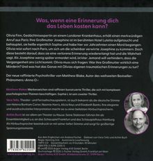 Olivia Finn, Gedächtnisexpertin an einem Londoner Krankenhaus, erhält einen merkwürdigen Anruf aus Paris: Ihre Großmutter Josephine ist im berühmten Hotel Lutetia aufgetaucht und behauptet, sie heiße eigentlich Sophie und habe hier vor Jahrzehnten einen Mord begangen. Olivia reist sofort nach Paris, um sich um die scheinbar verwirrte Josephine zu kümmern. Doch diese besteht darauf, dass sie eine verlorene Erinnerung wiedererlangt hat und die Wahrheit sagt. Als Josephine wenig später ermordet wird, ist klar: Jemand möchte verhindern, dass die Vergangenheit ans Licht kommen. Olivia muss sich fragen: War ihre Großmutter wirklich eine Mörderin? Und was hat das Ganze mit Olivias eigenen traumatischen Erinnerungen zu tun?