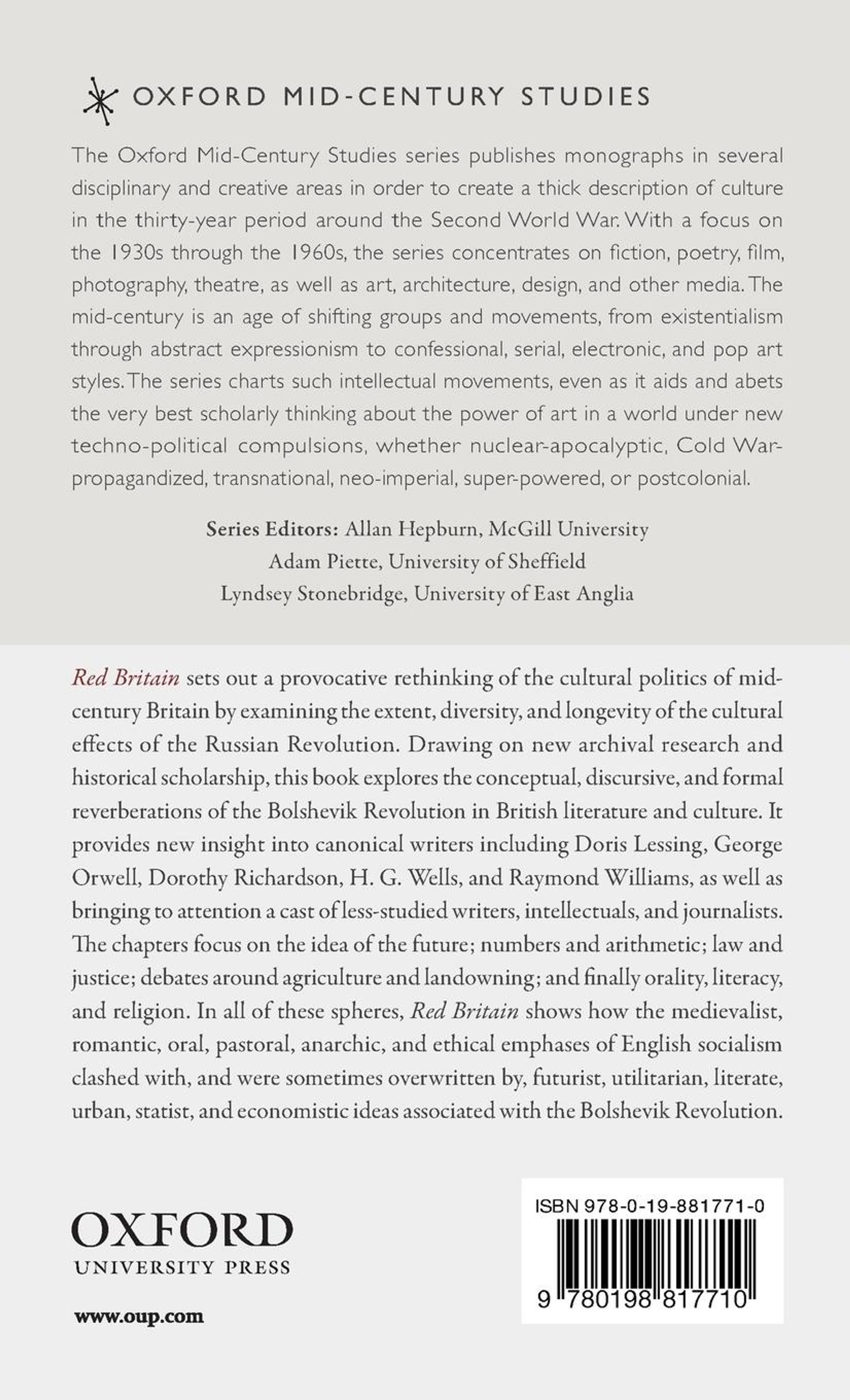Red Britain sets out a provocative rethinking of the cultural politics of mid-century Britain by drawing attention to the extent, diversity, and longevity of the cultural effects of the Russian Revolution. Drawing on new archival research and historical scholarship, this book explores the conceptual, discursive, and formal reverberations of the Bolshevik Revolution in British literature and culture. It provides new insight into canonical writers including Doris Lessing, George Orwell, Dorothy Richardson, H. G Wells, and Raymond Williams, as well bringing to attention a cast of less-studied writers, intellectuals, journalists, and visitors to the Soviet Union. Red Britain shows that the cultural resonances of the Russian Revolution are more far-reaching and various than has previously been acknowledged. Each of the five chapters takes as its subject one particular problem or debate, and investigates the ways in which it was politicised as a result of the Russian Revolution and the subsequent development of the Soviet state. The chapters focus on the idea of the future; numbers and arithmetic; law and justice; debates around agriculture and landowning; and finally orality, literacy, and religion. In all of these spheres, Red Britain shows how the medievalist, romantic, oral, pastoral, anarchic, and ethical emphases of English socialism clashed with, and were sometimes overwritten by, futurist, utilitarian, literate, urban, statist, and economistic ideas associated with the Bolshevik Revolution.