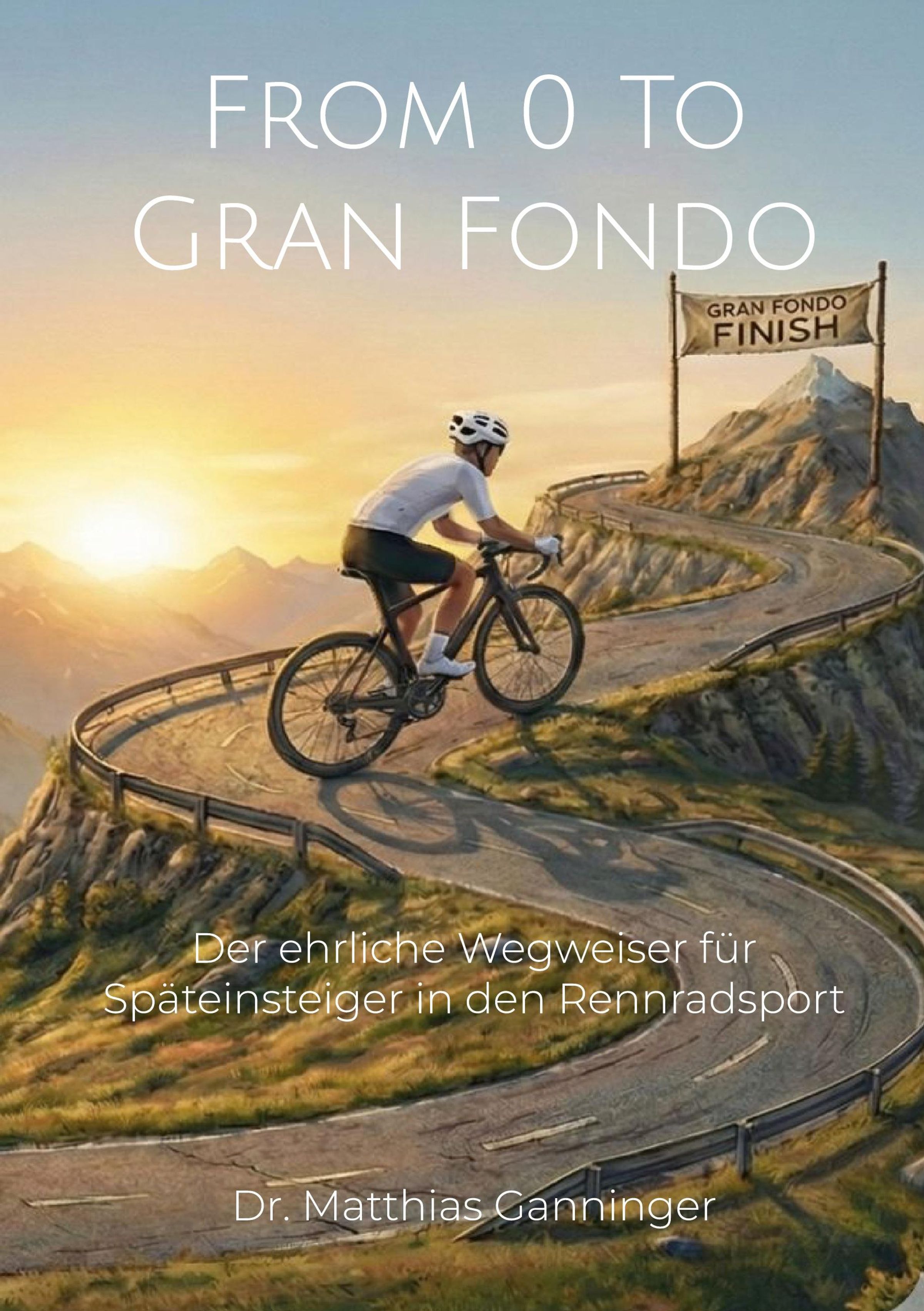 Text: "From 0 to Gran Fondo", "Gran Fondo Finish", "Wegweiser für Späteinsteiger in den Rennradsport", "Dr. Matthias Ganninger". Ein Radfahrer erklimmt eine kurvige Bergstraße bei Sonnenuntergang., Buch