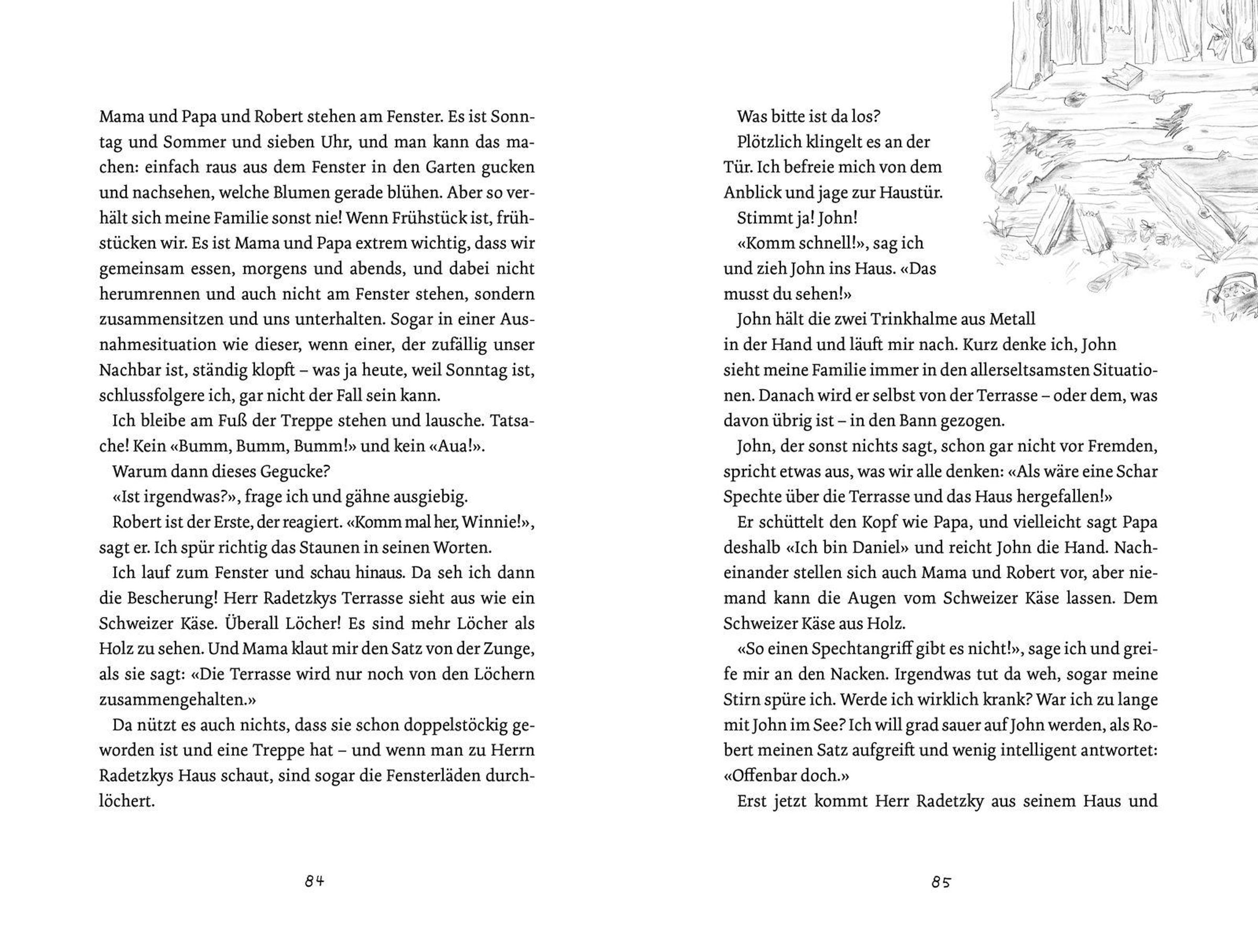 Gerade erst ist Winnies Familie in das kleine Kaff gezogen. Dieses Jahr werden sie in den großen Ferien zuhause bleiben - Mama hat einen neuen Job, und Papa will endlich in Ruhe sein Buch schreiben. Winnie freut sich auf chillige Ferien im Garten. Wenn da nicht der Nachbar, Herr Radetzky, wäre. Der hämmert, sägt und klopft ohne Unterlass an seiner Terrasse. Da hilft kein gutes Zureden! Doch dann lernt Winnie John kennen, und auf einmal ist es gar nicht mehr so schlimm, dass sie nicht weggefahren sind. Mit John schwimmt sie im See und erkundet den nahegelegenen Wald. Aber auch im Wald und am See klopft und hämmert es! Hier ist es zwar ein Specht, aber der ist fast noch merkwürdiger als Herr Radetzky - sogar so merkwürdig, dass er nachts in Winnies Träumen auftaucht! Und dann spitzen sich die Ereignisse zu, und es geschehen Dinge, die eigentlich nicht sein können ...