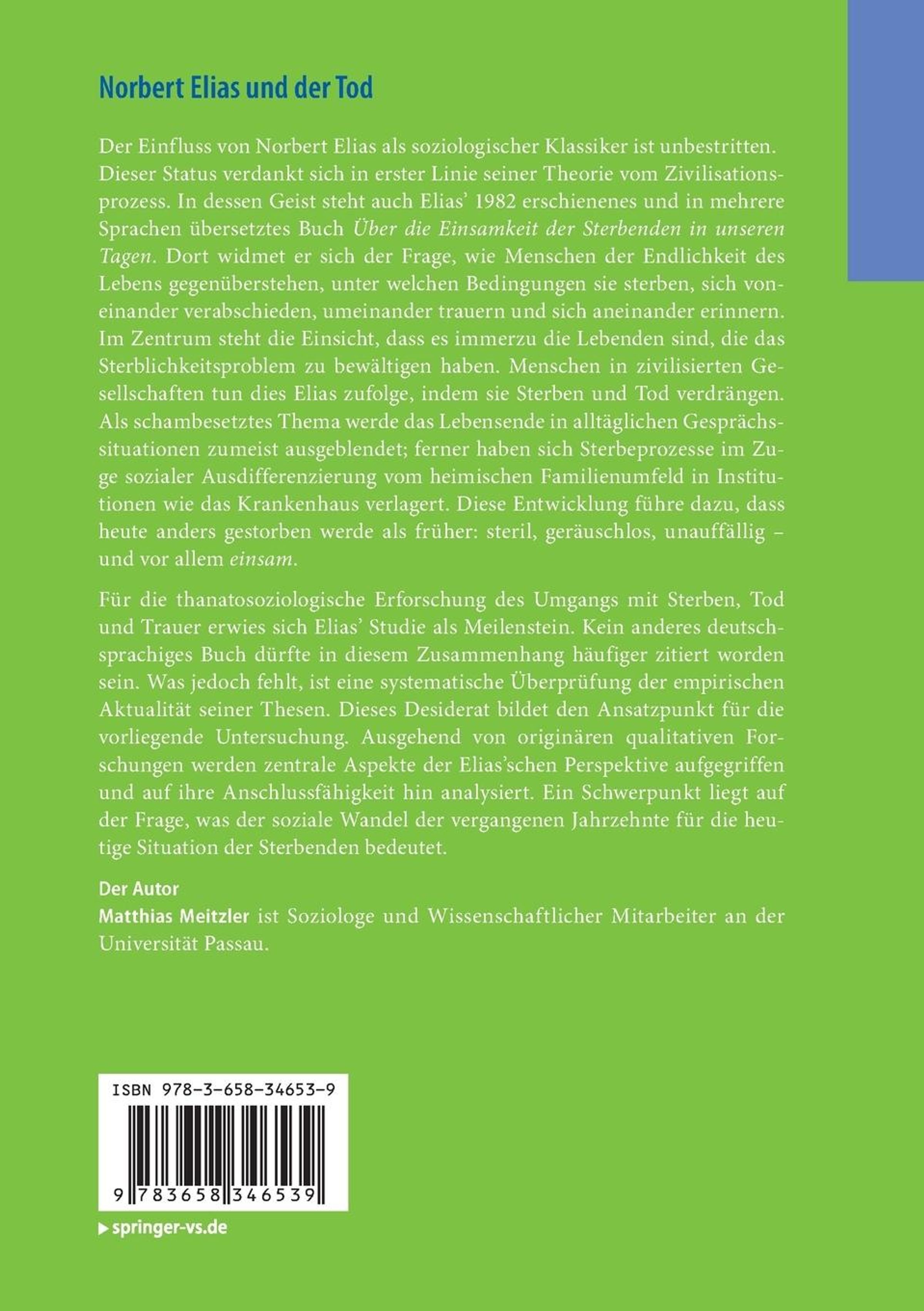 Für die thanatosoziologische Erforschung des Umgangs mit Sterben, Tod und Trauer erwies sich Elias Studie als Meilenstein. Kein anderes deutschsprachiges Buch dürfte in diesem Zusammenhang häufiger zitiert worden sein. Was jedoch fehlt, ist eine systematische Überprüfung der empirischen Aktualität seiner Thesen. Dieses Desiderat bildet den Ansatzpunkt für die vorliegende Untersuchung. Ausgehend von originären qualitativen Forschungen werden zentrale Aspekte der Eliasschen Perspektive aufgegriffen und auf ihre Anschlussfähigkeit hin analysiert. Ein Schwerpunkt liegt auf der Frage, was der soziale Wandel der vergangenen Jahrzehnte für die heutige Situation der Sterbenden bedeutet.