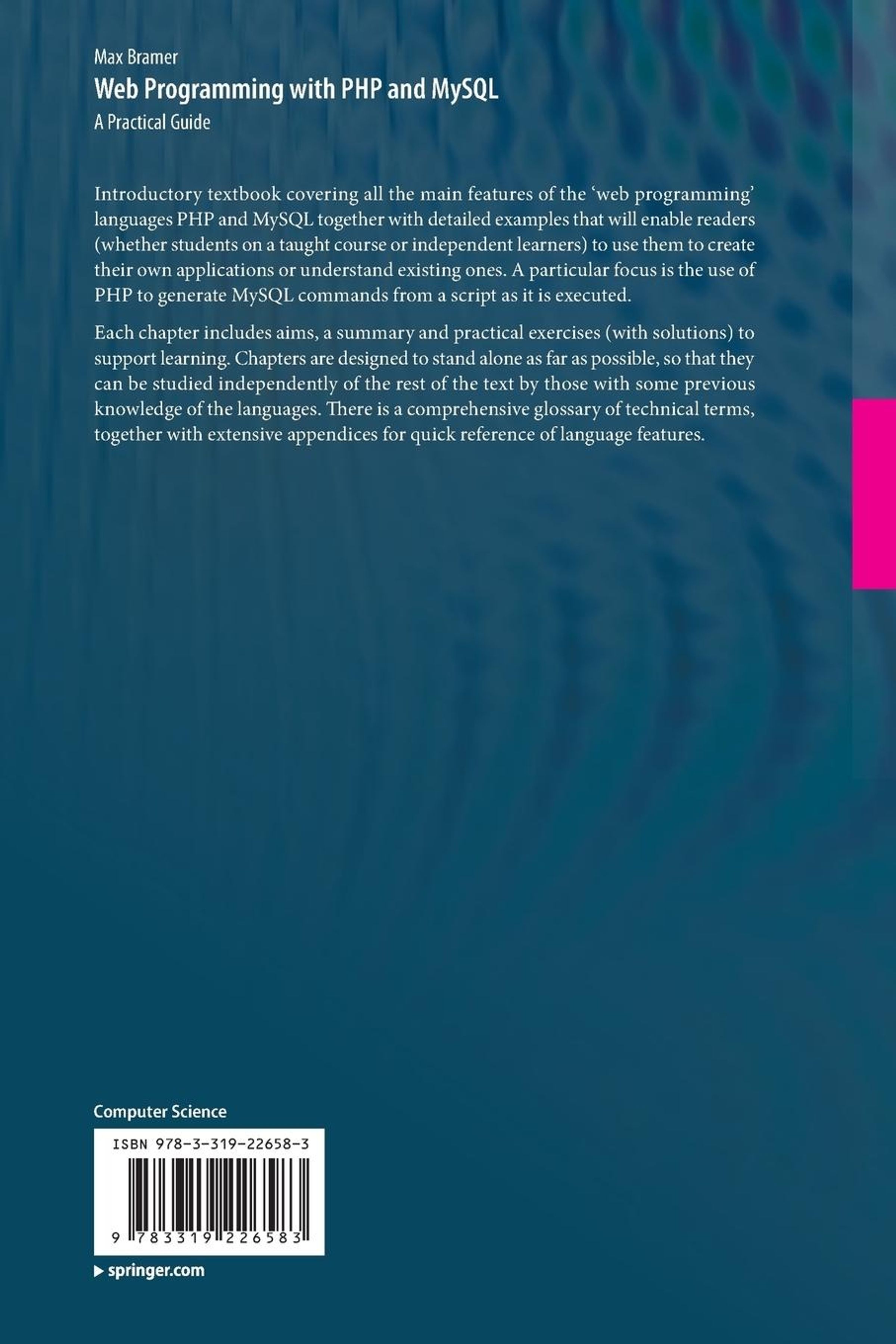 Introductory textbook covering all the main features of the 'web programming' languages PHP and MySQL together with detailed examples that will enable readers (whether students on a taught course or independent learners) to use them to create their own applications or understand existing ones. A particular focus is the use of PHP to generate MySQL commands from a script as it is executed.