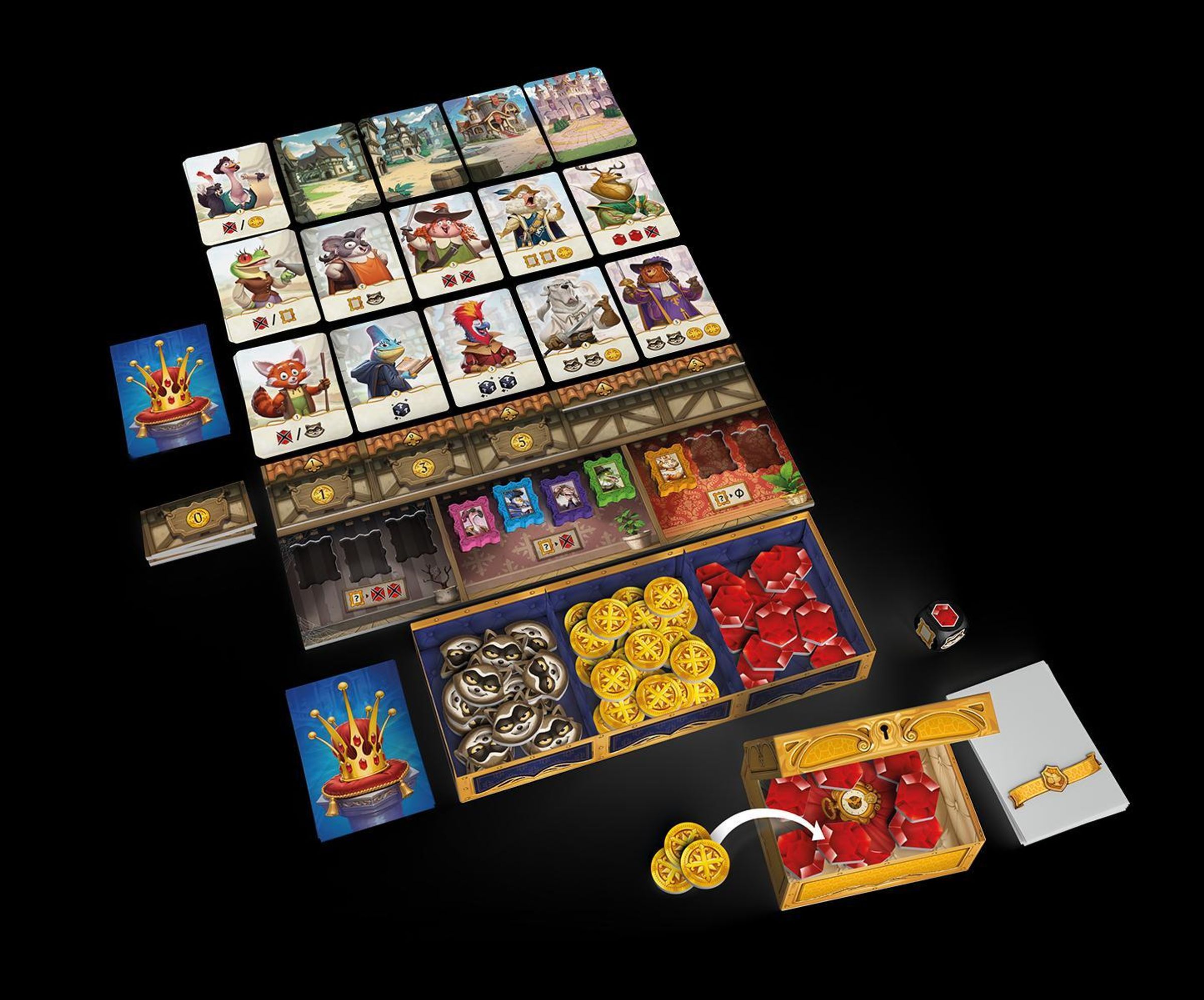 Das Familienspiel Für die Krone ist ein Spiel um Tricksereien, Verrat und gutes Timing. Über vier Runden heuert ihr Untertanen an, indem ihr die neuen Untertanen in die Kartenhülle eurer Familie steckt und einen gemeinsamen Stapel bildet. Deckt die Karten vom gemeinsamen Stapel auf und nutzt die Effekte eurer Untertanen. Doch nehmt euch vor Ereignissen und Untertanen der anderen in Acht. Maskierte Diebe, Einfluss, Magie ... Nutze alle Mittel, damit die anderen ihre Rubine verlieren und du am Ende dieses Wettstreits die Krone erlangst!