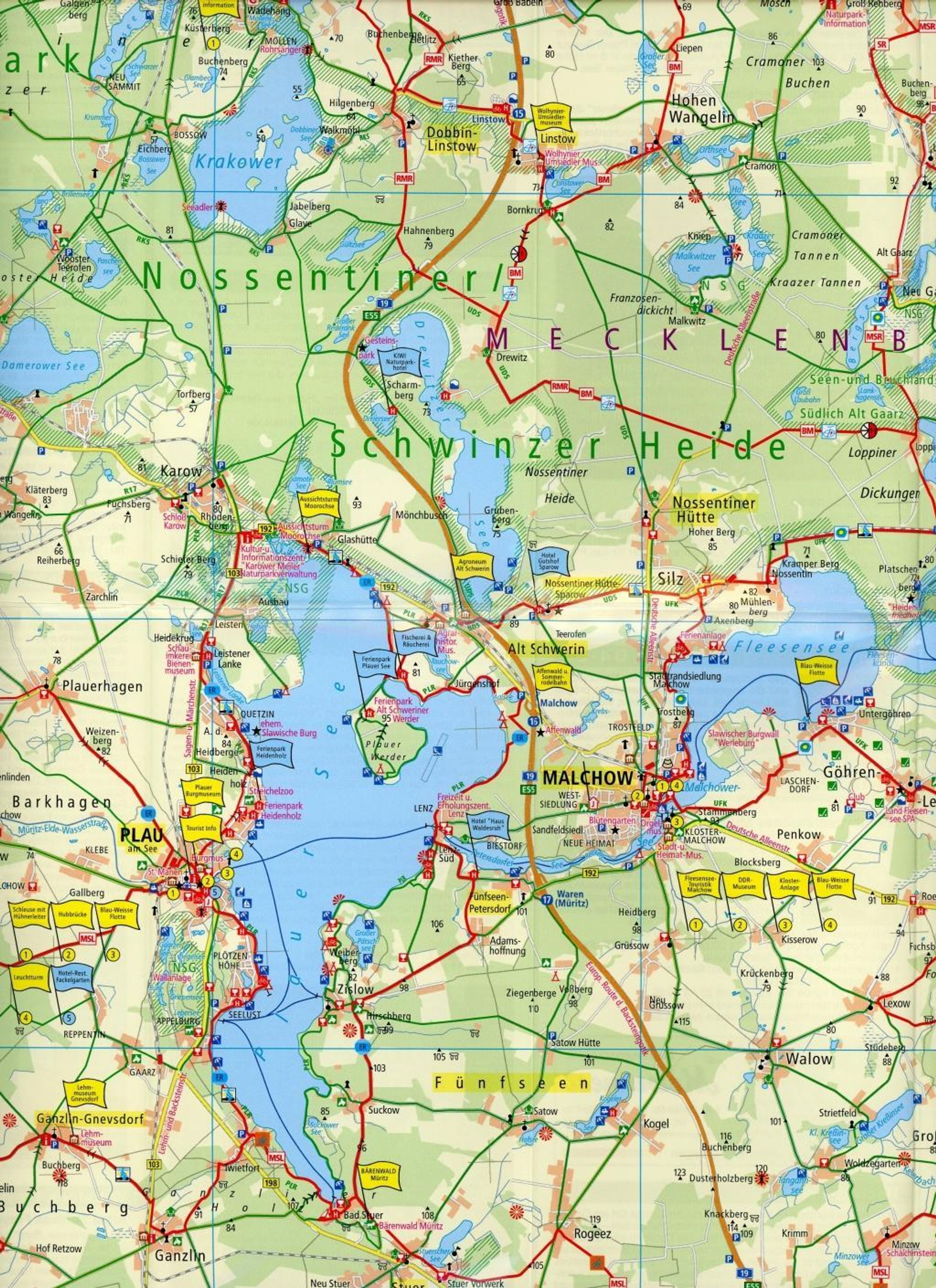 Zahlreiche Radwege führen durch das landschaftlich reizvolle und für Radler ideale, flache Gebiet der Müritzer Seenplatte. Die Radwege bieten entlang der Ufer Blicke auf die Seen oder führen durch die Landschaft, die oftmals als Naturpark ausgewiesen ist. Einladungen zu Pausen und Zwischenstopps bieten nicht nur die Badestellen, sondern auch interessante Orte wie Fürstenberg / Havel, die Inselstadt Malchow, Plau oder die Orte der Kleinseenplatte. Mitmachen, Ausprobieren, Staunen kann man im Müritzeum, sich gruseln im Museum für Magie und Hexenverfolgung und einfach nur abschalten in der herrlichen Umgebung.