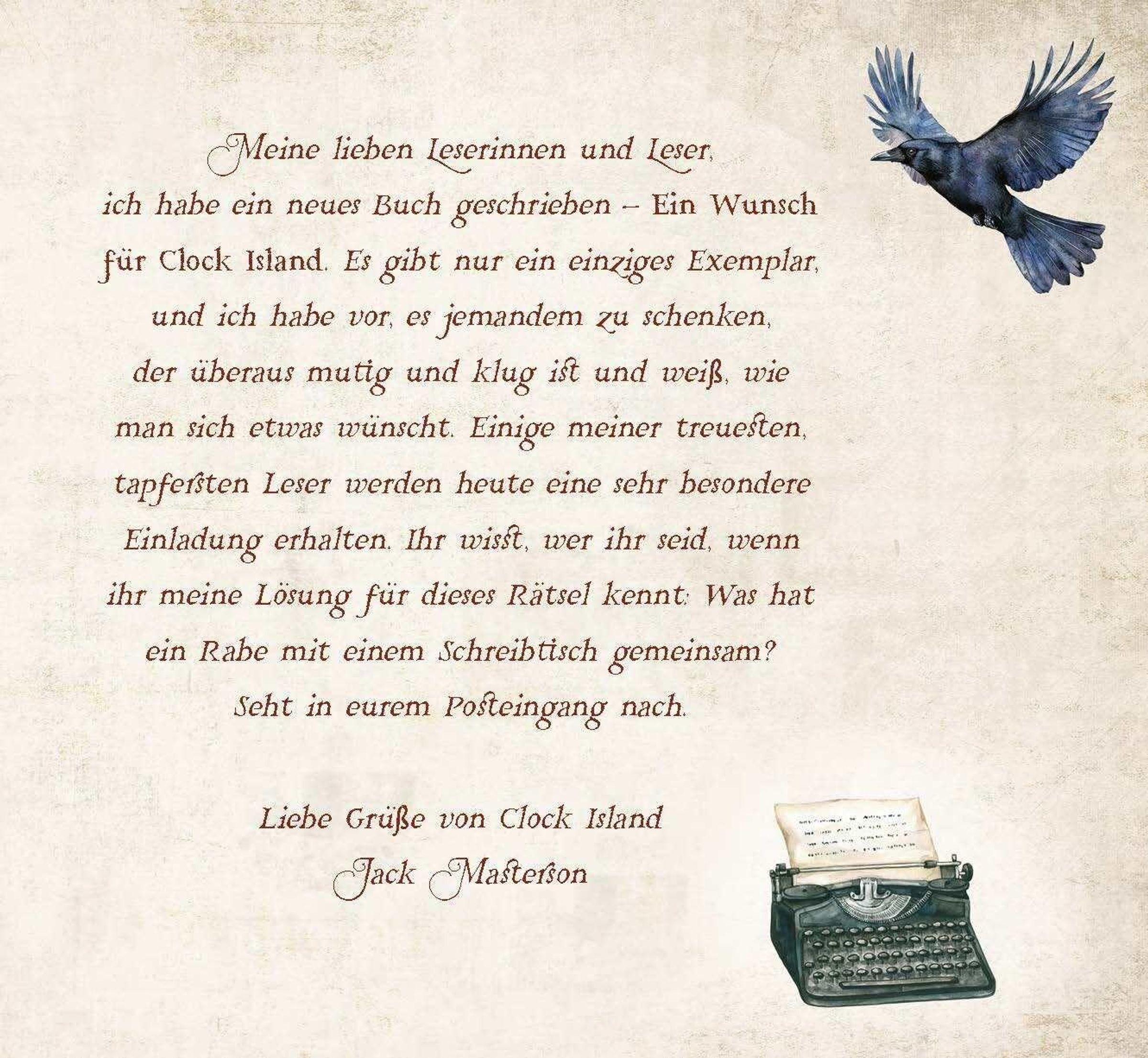 In einer von Einsamkeit geprägten Kindheit fand Lucy Hart Trost in Büchern, insbesondere in der 'Clock Island'-Reihe von Bestsellerautor Jack Masterson. Jetzt ist sie Mitte zwanzig und kann ihre Liebe zum Lesen mit ihren Schülern teilen, vor allem mit dem Waisenjungen Christopher. Lucy würde alles dafür tun, Christopher zu adoptieren, doch um ihm ein richtiges Zuhause zu geben, fehlen ihr die nötigen finanziellen Mittel. Als Jack Masterson einen Wettbewerb ausschreibt - mit dem einzigen Exemplar seines neuesten Romans als Preis - schöpft Lucy neue Hoffnung. Vor Ort erwarten sie nicht nur zahlreiche Rätsel, sondern auch gerissene Gegner und der ablenkend gut aussehende Illustrator Hugo Reese. Um zu gewinnen, muss sich Lucy ihren Ängsten stellen. Und der Autor selbst hat ein Geheimnis, das den Ausgang des Wettbewerbs stark beeinflusst ...