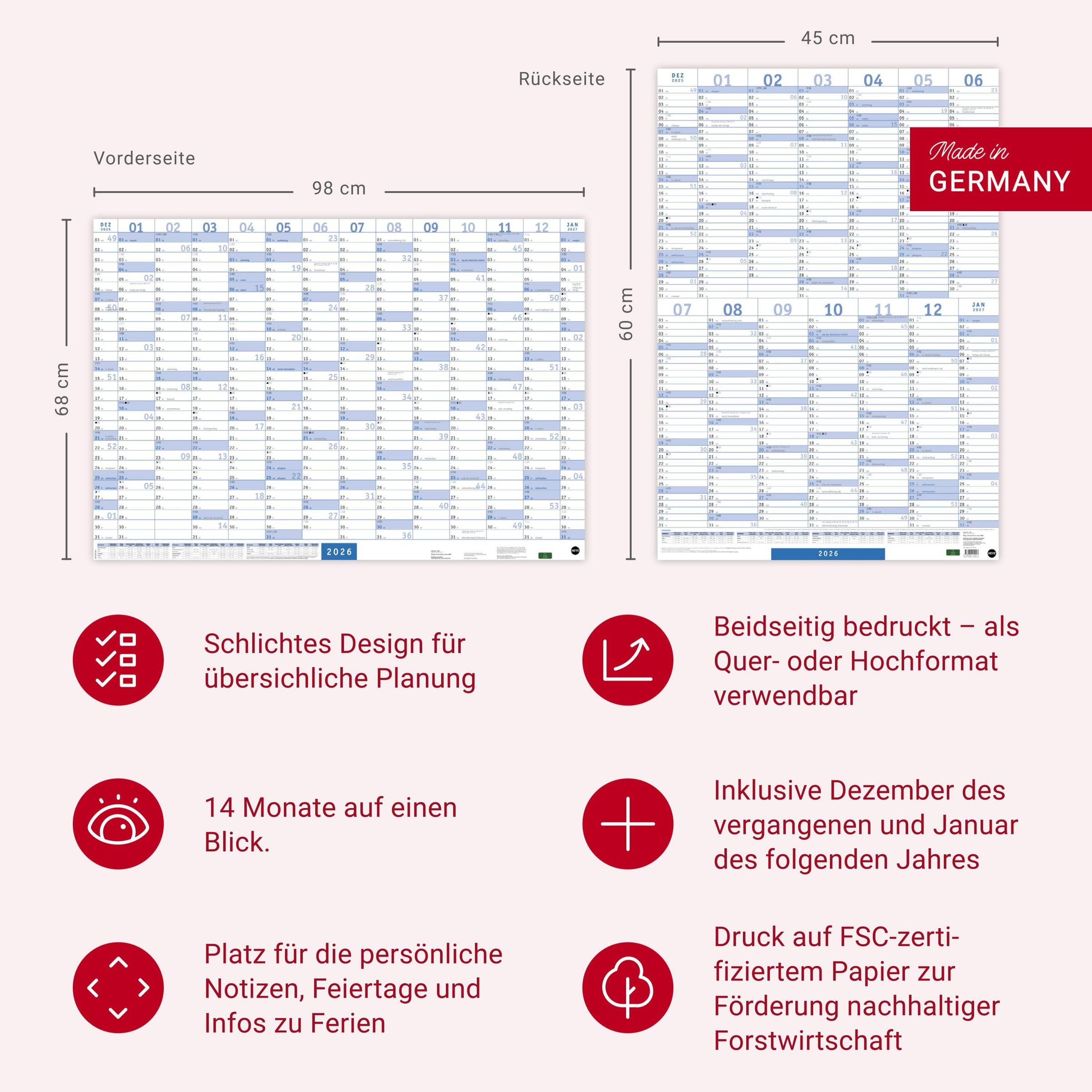 - Großer Jahresplaner in blau. Wandkalender 2026 zum Eintragen. XXL Büro-Kalender mit Ferienterminen und Feiertagen. 68 x 98 cm