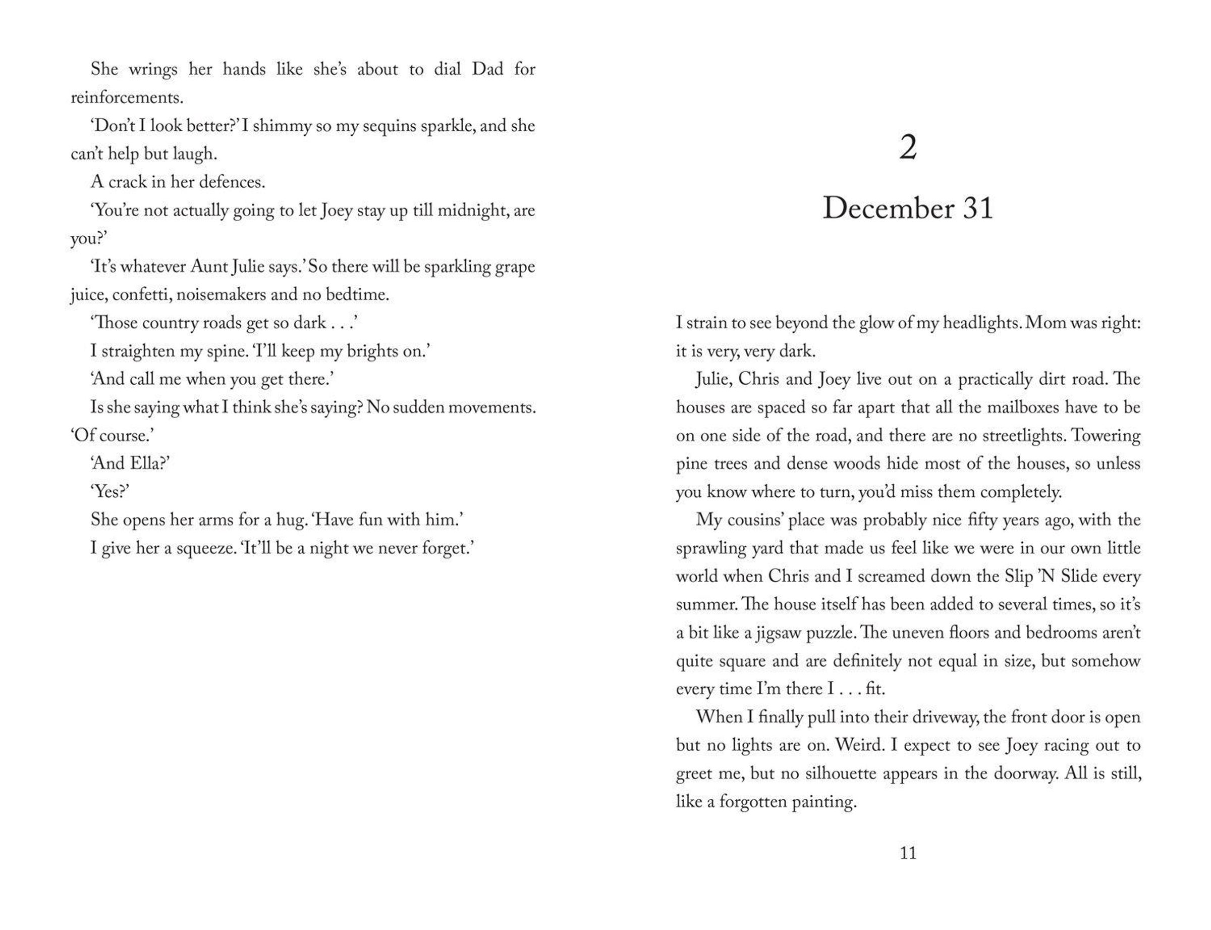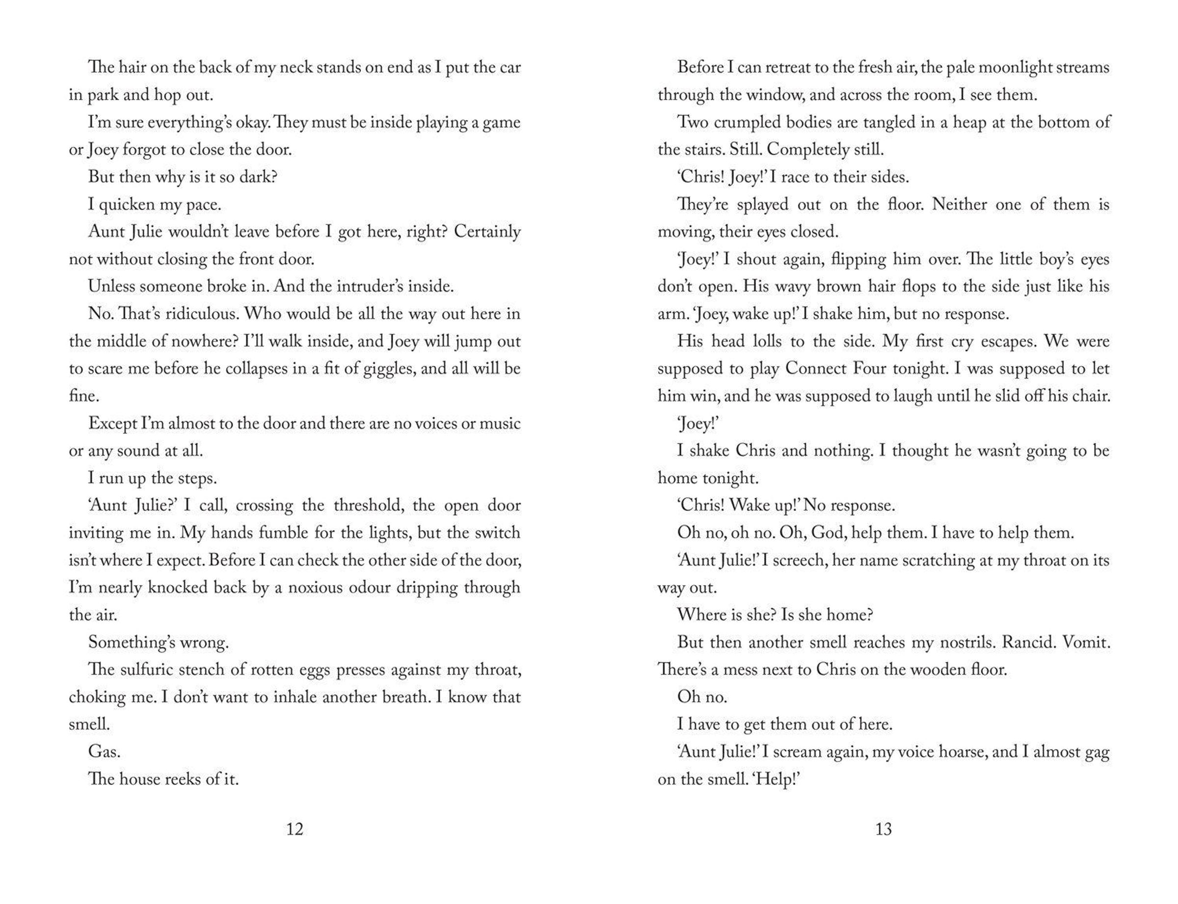 But when nobody answers the door, she knows something isn't right. Breaking in, she finds her cousins unconscious on the floor. And Aunt Julie is dead. Ella is barely able to rescue them from the house before she collapses into the snow.
