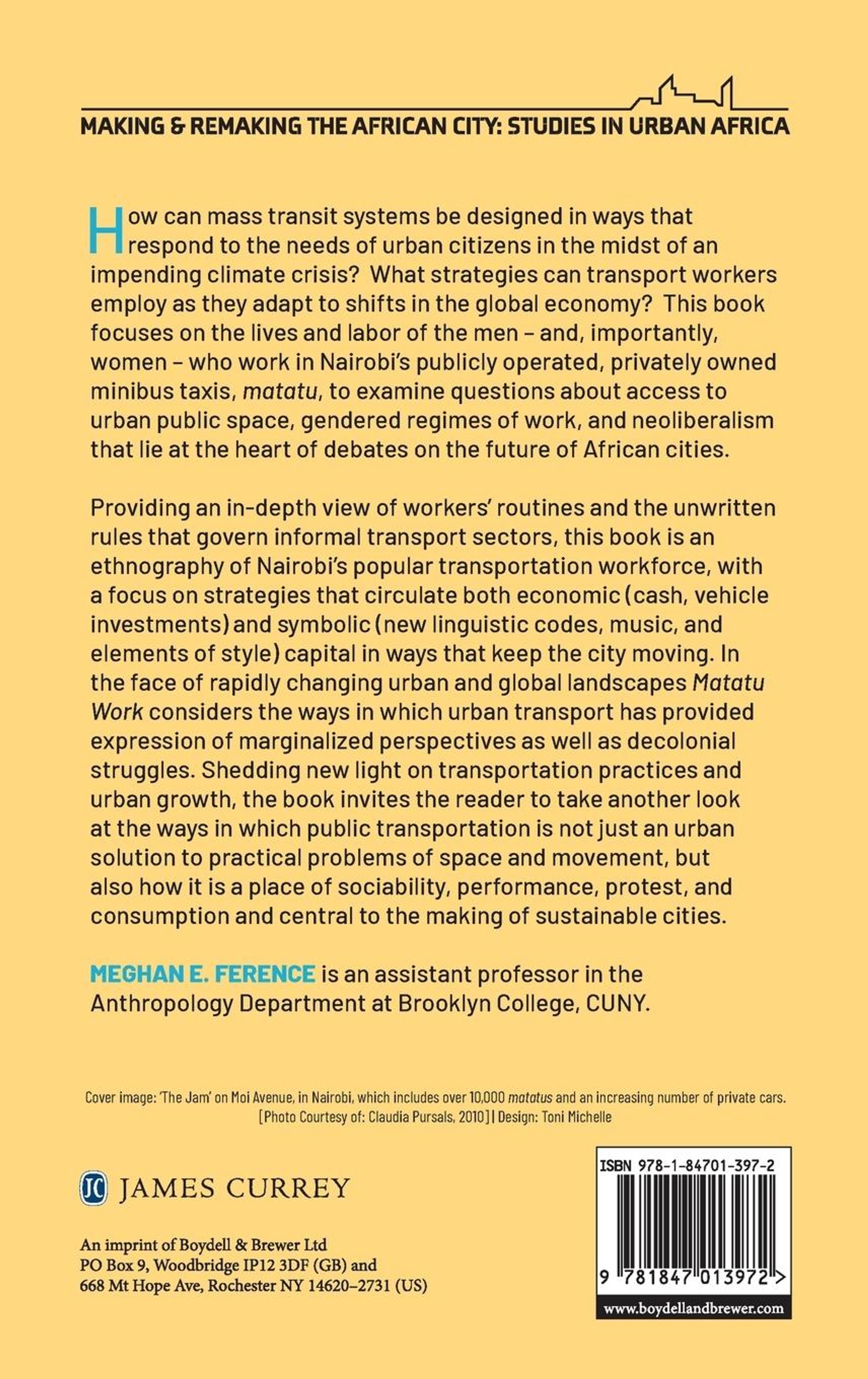 How can mass transit systems be designed in ways that respond to the needs of urban citizens in the midst of an impending climate crisis? What strategies can transport workers employ as they adapt to shifts in the global economy? This book focuses on the lives and labour of the men - and, importantly, women - who work in Nairobi's publicly operated, privately owned minibus taxis, matatu, to examine questions about access to urban public space, gendered regimes of work, and neoliberalism that lie at the heart of debates on the future of African cities.