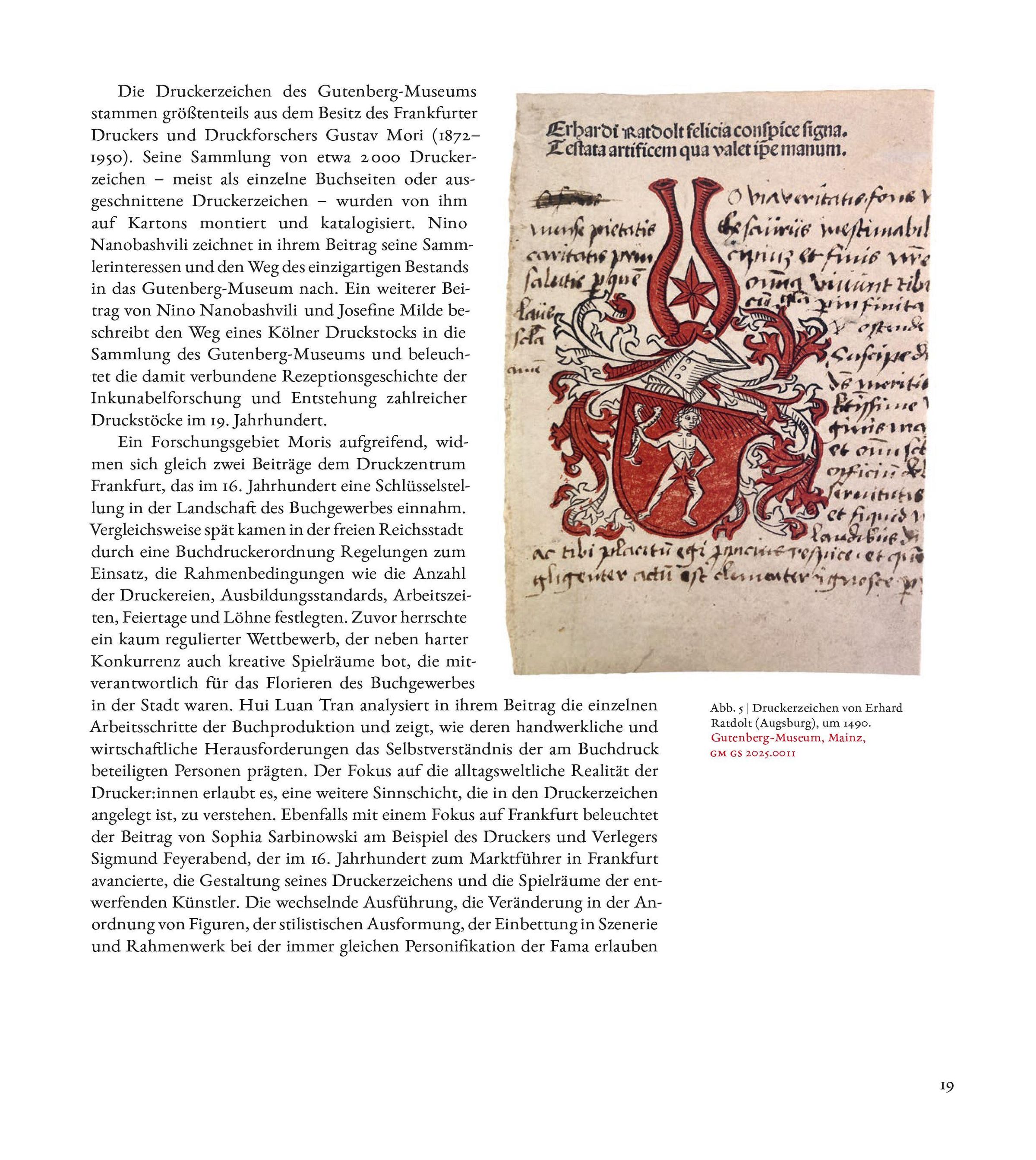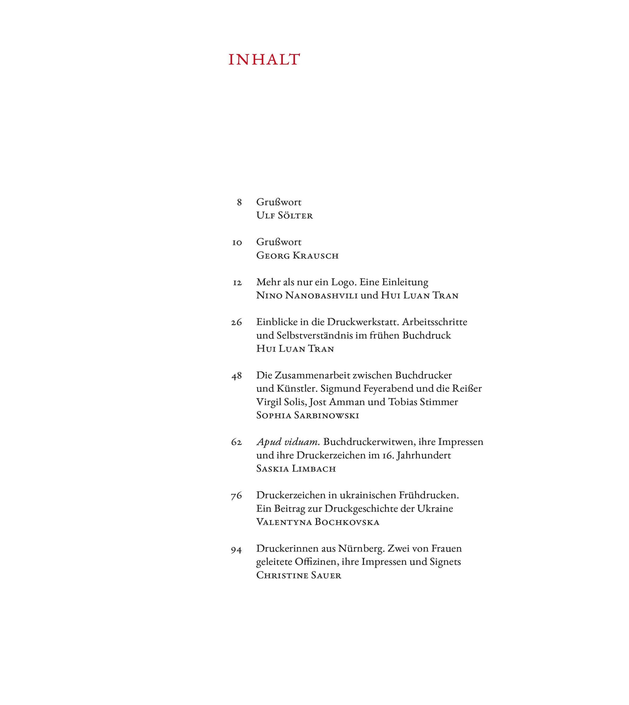 To mark the 625^th^ anniversary of Gutenberg's birth, the Gutenberg Museum Mainz is dedicating a first exhibition to the pictorial genre of printer's marks. The accompanying volume opens up the world of printers and publishers from the beginnings of book printing to the present day, and includes texts on processes in the printing workshop, the printer's job, and specific case studies.