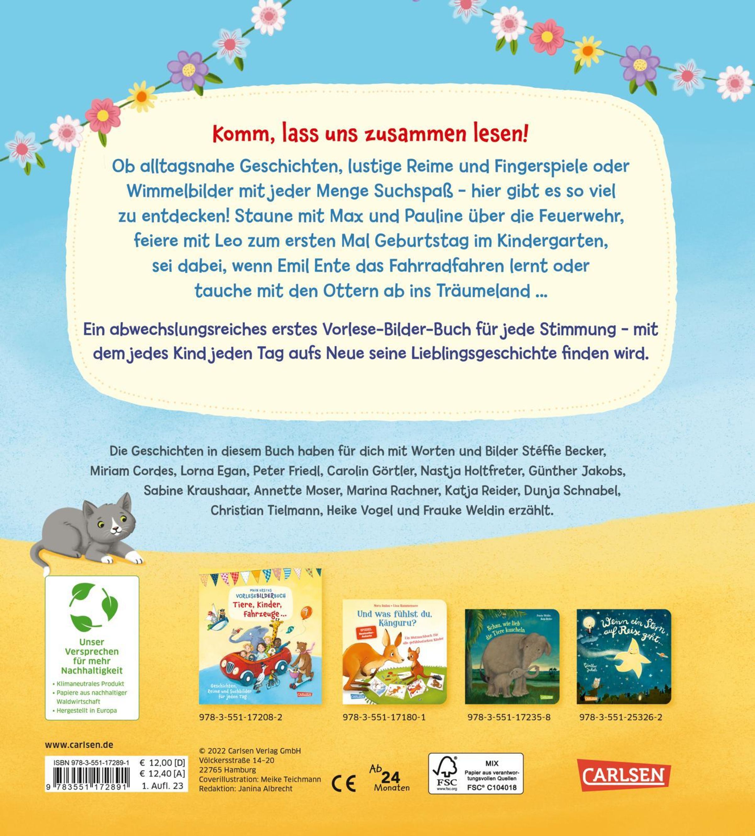 Ob alltagsnahe Vorlesetexte, lustige Reime und Fingerspiele oder Wimmelbilder mit vielen Details - in diesem besonderen Pappbilderbuch gibt es auf jeder Doppelseite Geschichten zu entdecken, die von großen und kleinen Abenteuern aus dem Kinderalltag erzählen. Wie zum Beispiel von Feline, die im Garten ihres Opas so laut sein darf, wie sie will oder von Emil Ente, der das Fahrradfahren lernt.