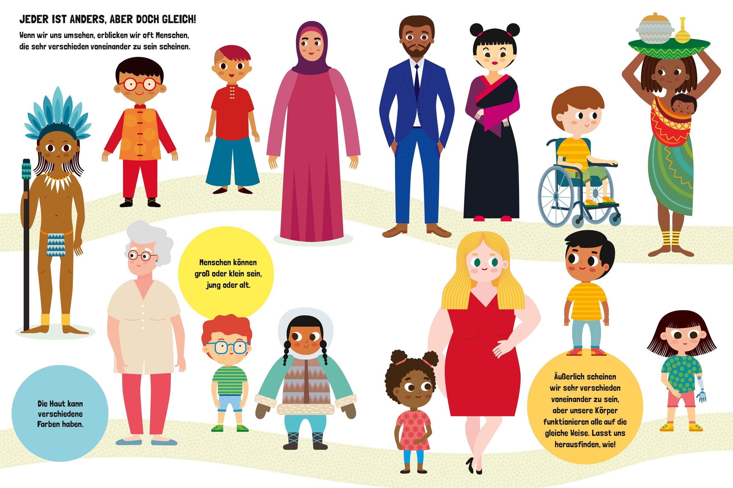 Der menschliche Körper entfacht bei kleinen Kindern eine unendliche Neugier. Komplexe anatomische Strukturen im Detail zu erklären, ist zwar schwierig, doch dieses ansprechende große Pappbilderbuch ist den Kindern bei der Erweiterung ihres Bewusstseins und ihrer Sprache rund um den eigenen Körper behilflich. Es betont die Bedeutung von Inklusivität und zeigt, dass wir trotz unterschiedlicher Erscheinung - Hautfarbe, Haarstruktur und Fähigkeiten - im Wesentlichen alle gleich sind. Mittels einfacher Sprache und bunten Illustrationen macht dieses Buch komplexe Themen leicht zugänglich und unterhaltsam. Es unterstützt Kinder, dass sie lernen, ihre Körperteile zu benennen, und fördert dabei die Neugier auf sich selbst und andere.