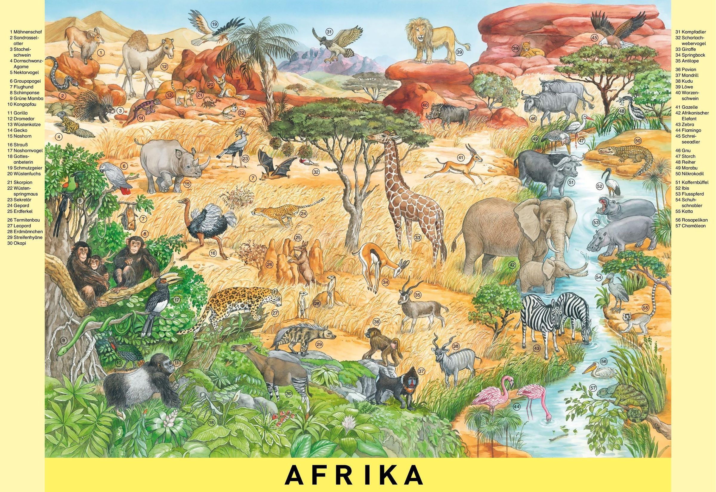 „Mein großes Wimmelbuch - Tiere der Welt“, Illustration mit zahlreichen Tieren in lebendiger Dschungelszene., Buch