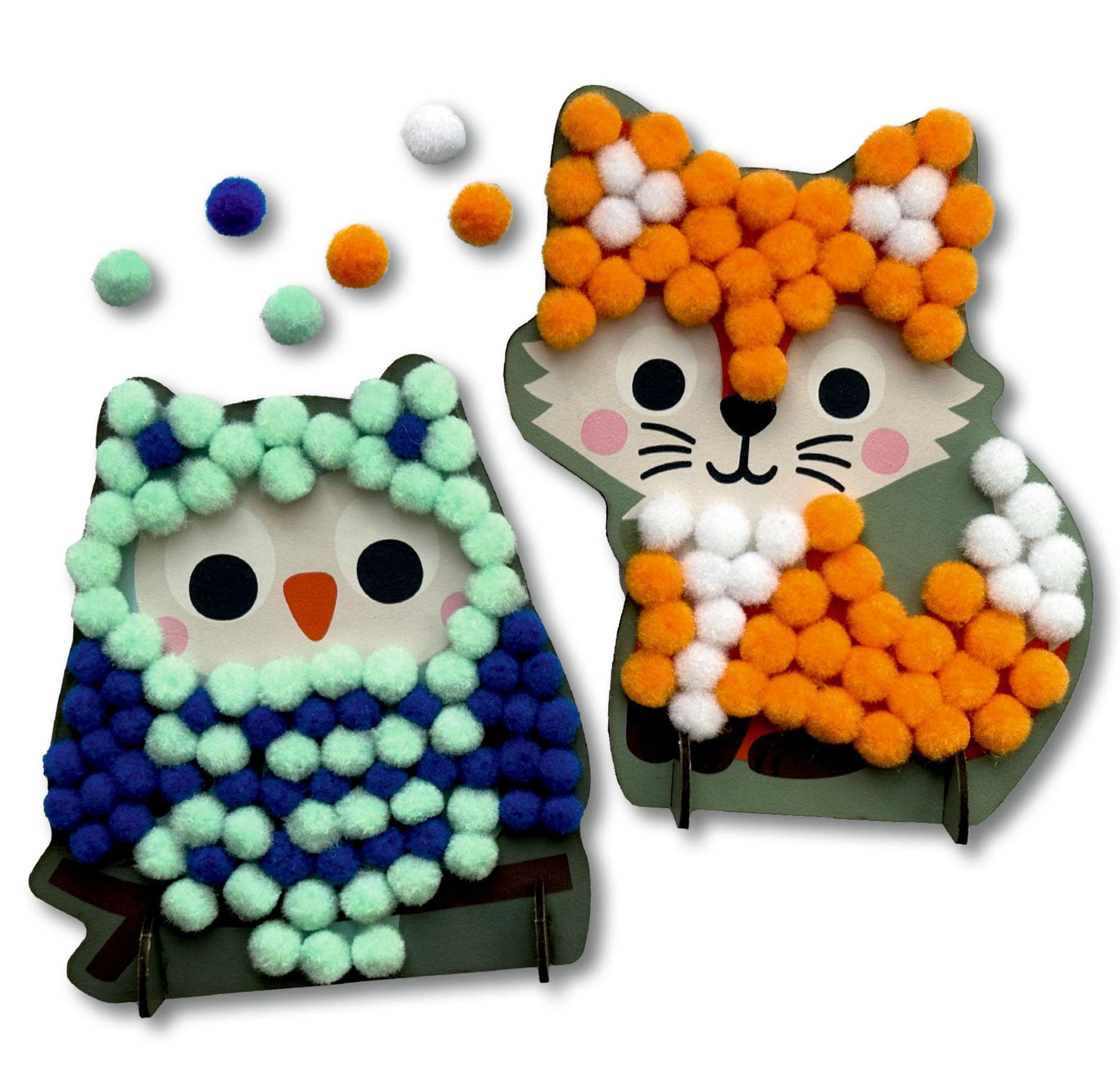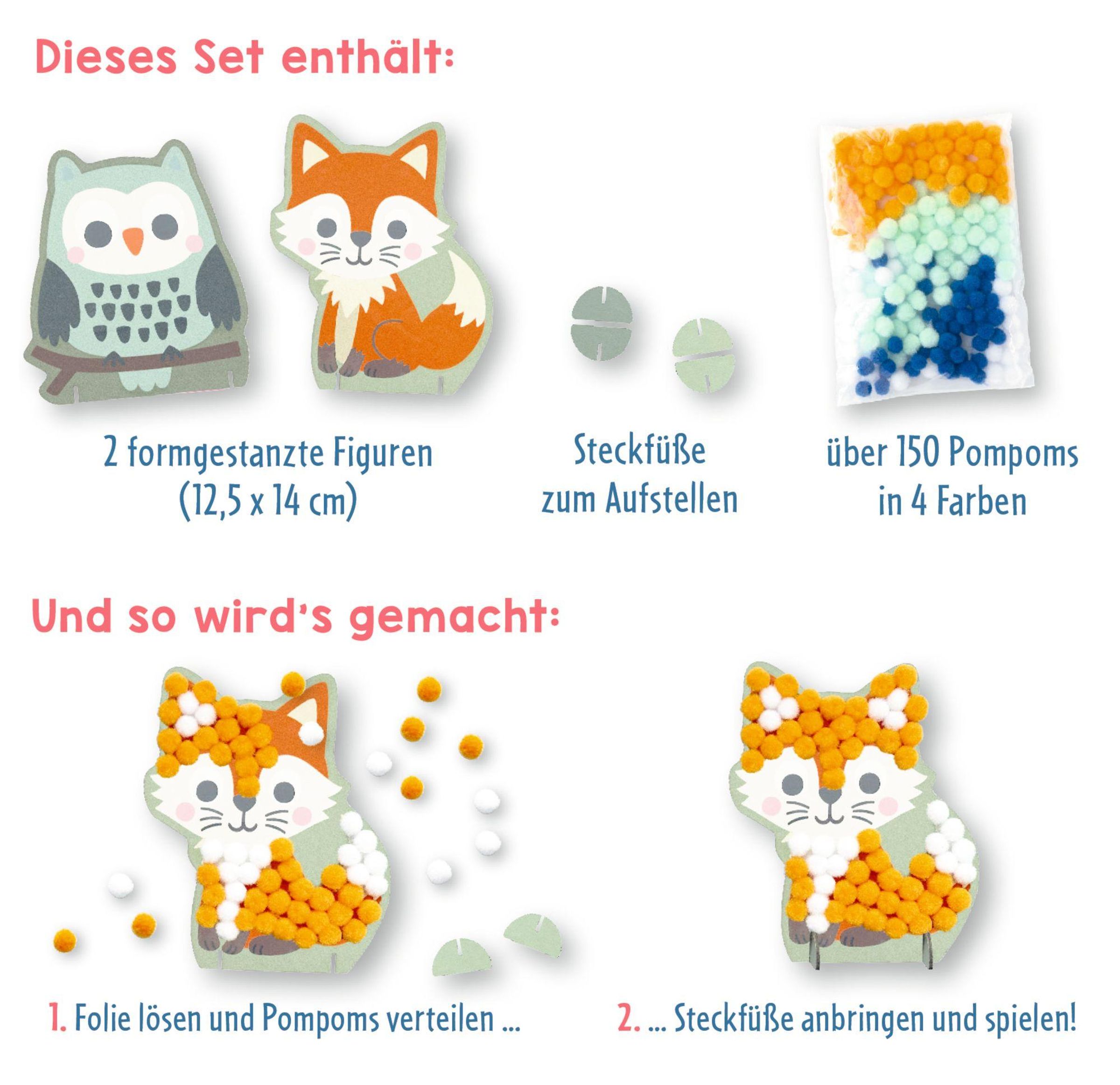 Bastelset mit zwei formgestanzten Tierfiguren Über 150 Pompoms zum einfachen Aufkleben Selbstklebende Flächen für ein leichtes Gelingen Basteln und Spielen für Kinder ab 3 Jahren Dieses liebevoll gestaltete Bastelset fördert spielerisch Kreativität und Feinmotorik. Über 150 bunte und selbstklebende Pompoms sorgen für einen lustigen Zeitvertreib: Beim Bekleben entstehen dank zweier kindgerechter, formgestanzter Vorlagen farbenfrohe Tierfiguren, die anschließend zum Spielen einladen. Ein kreatives Erlebnis, das Gestalten, Spaß und Feinmotorik verbindet - ein tolles Mitbringsel für Kinder ab 3 Jahren.