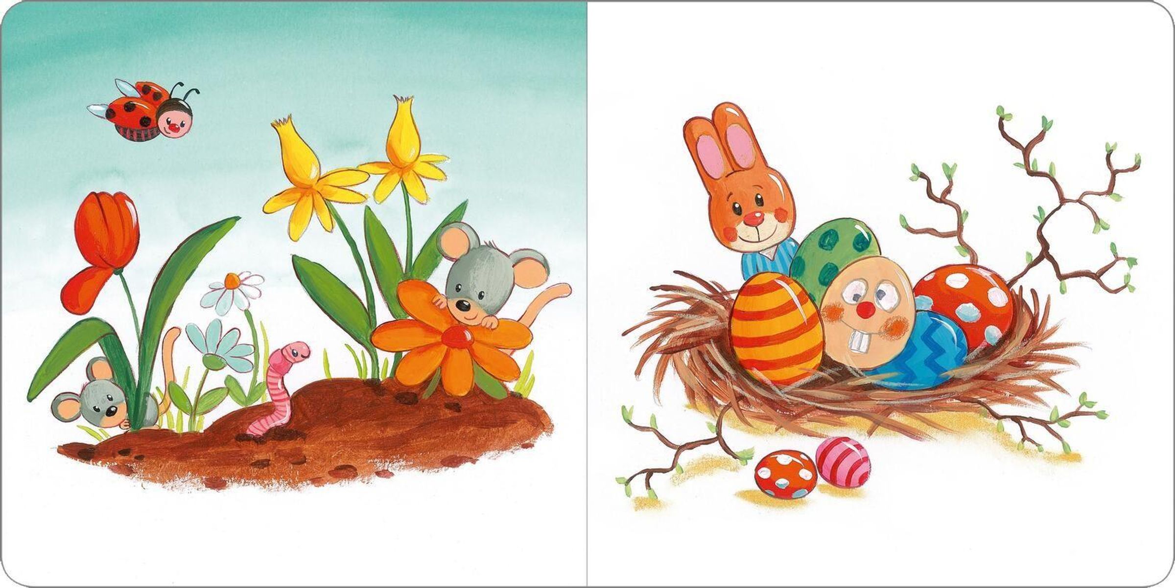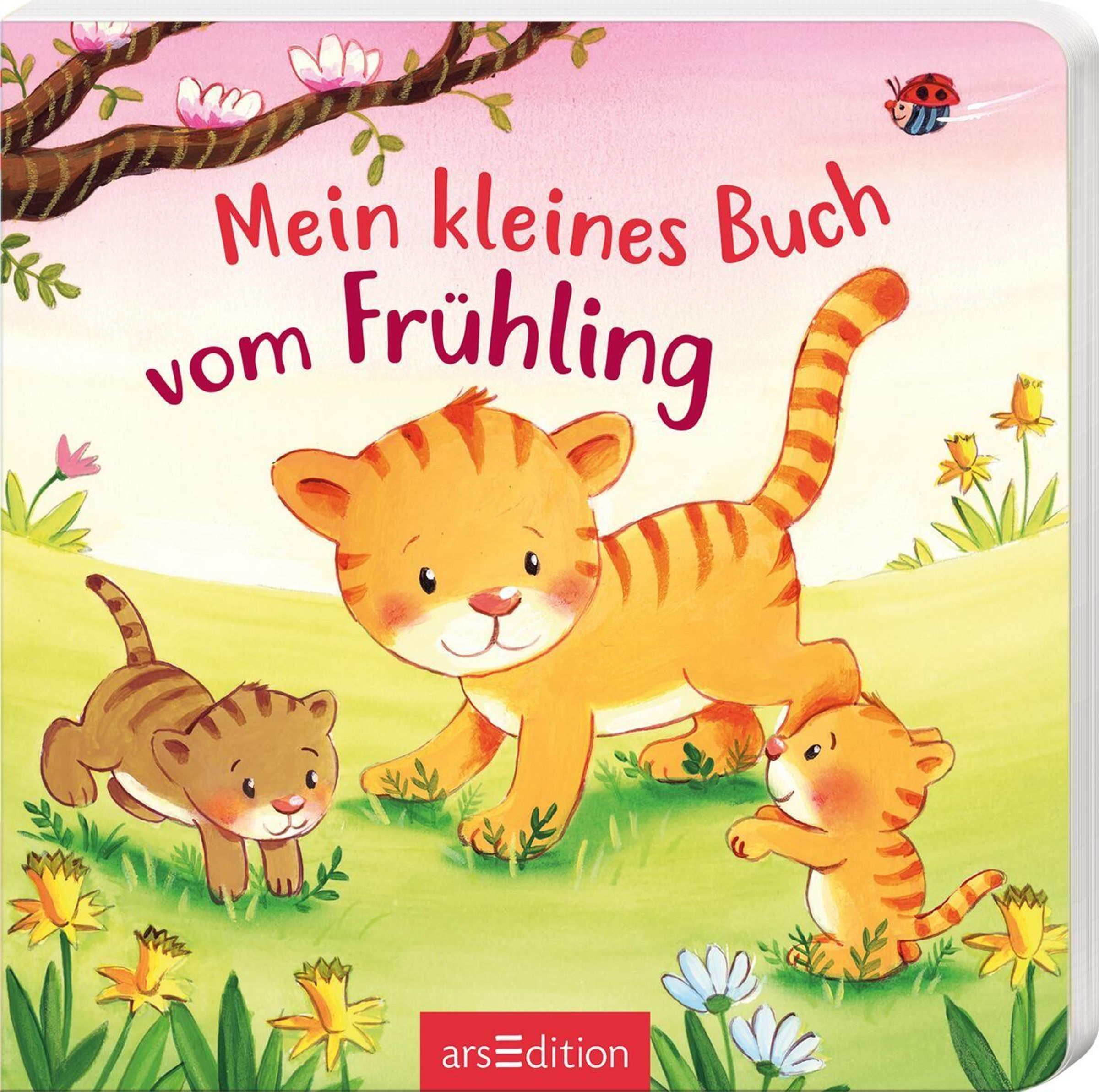 "Mein kleines Buch vom Frühling" in fröhlichen Farben. Illustration: drei spielende Tigerjunge auf blühender Blumenwiese., Buch