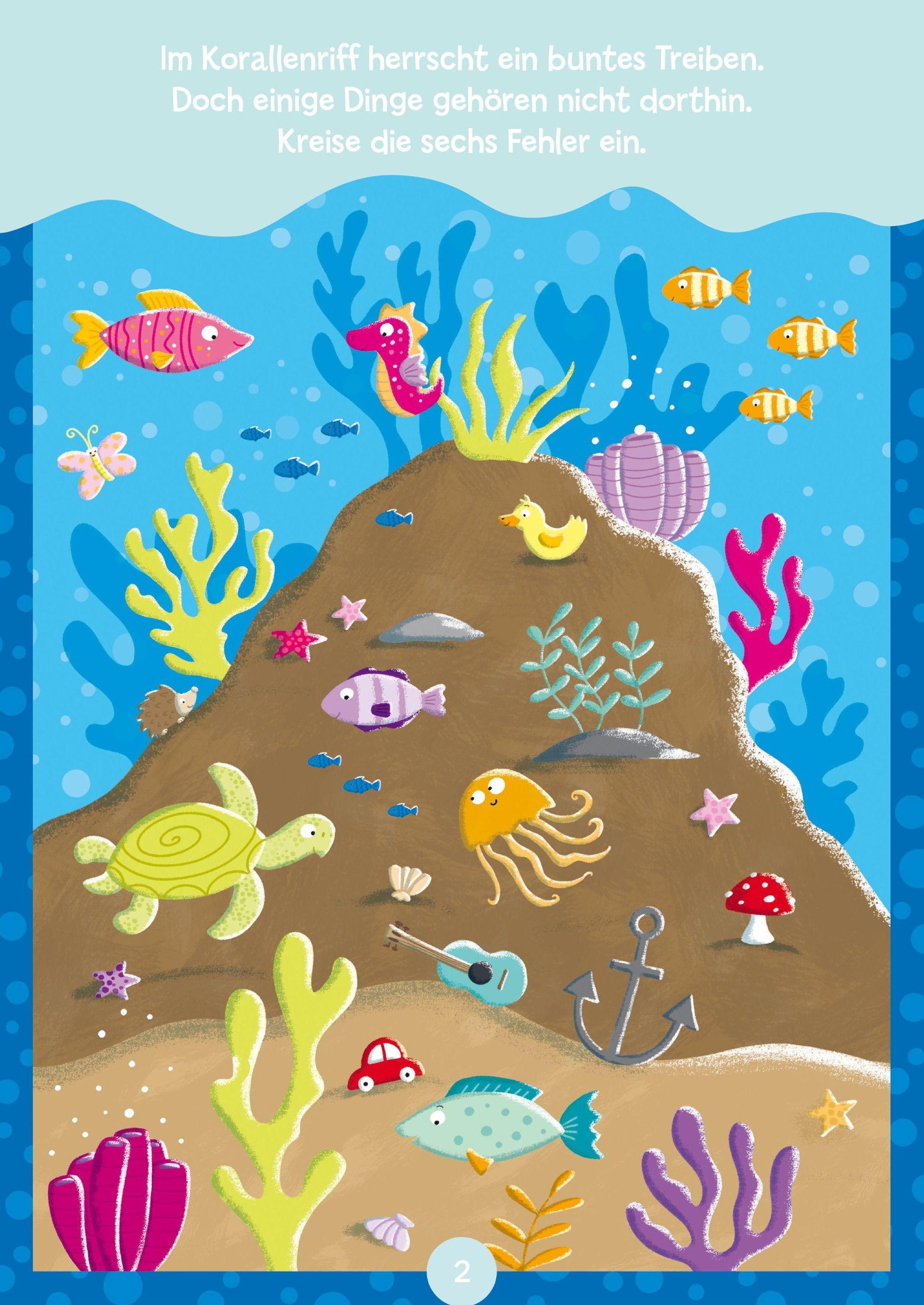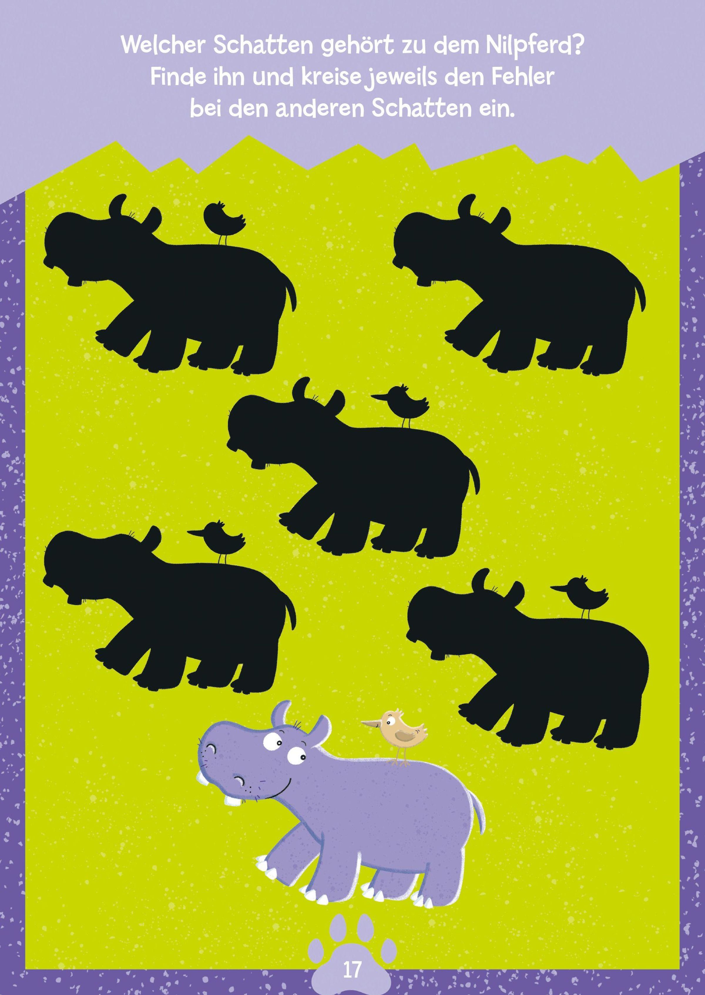 Bunt, spannend und voller Abenteuer - jetzt wird gerätselt, gemalt und gezählt! Der Rästelblock bietet 96 farbig illustrierte Seiten voller abwechslungsreicher Aufgaben. Ob Tiger, Haie, Seepferdchen oder Krokodile - kleine Tierfans entdecken eine fantasievolle Rätselwelt, die Spaß macht und zum Mitmachen einlädt. Die Kinder helfen dem Krokodil, den Weg zu seinen Eiern zu finden, entdecken Unterschiede zwischen bunten Bildern, zählen exotische Tiere oder suchen Paare von schillernden Zierfischen im Korallenriff. Neben klassischen Knobeleien wie Labyrinthen und "Finde den Fehler" laden Mal- und Nachspurübungen auch zur kreativen Beschäftigung ein. Der Block ist ideal für Kinder ab 4 Jahren: Alle Aufgaben sind klar erklärt, abwechslungsreich gestaltet und steigern sich von leicht bis knifflig. So bleibt die Freude am Rätseln lange erhalten. Ganz nebenbei werden Konzentration, Geduld, Beobachtungsgabe und logisches Denken gefördert. Ob zuhause, unterwegs oder als Geschenk: Mit diesem Rätselmix tauchen Kinder ein in eine bunte Welt voller wilder Tiere und magischer Unterwasserabenteuer!