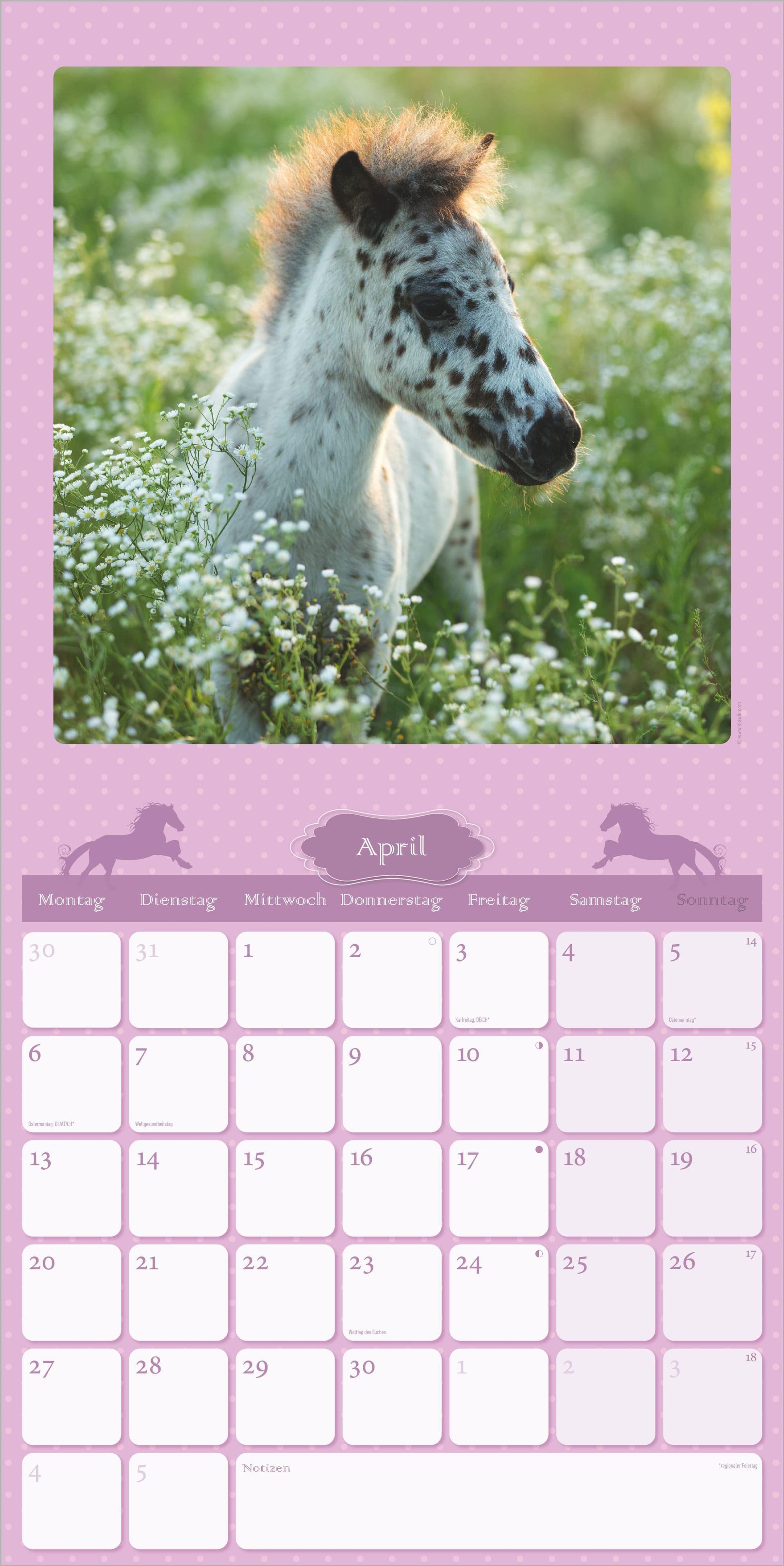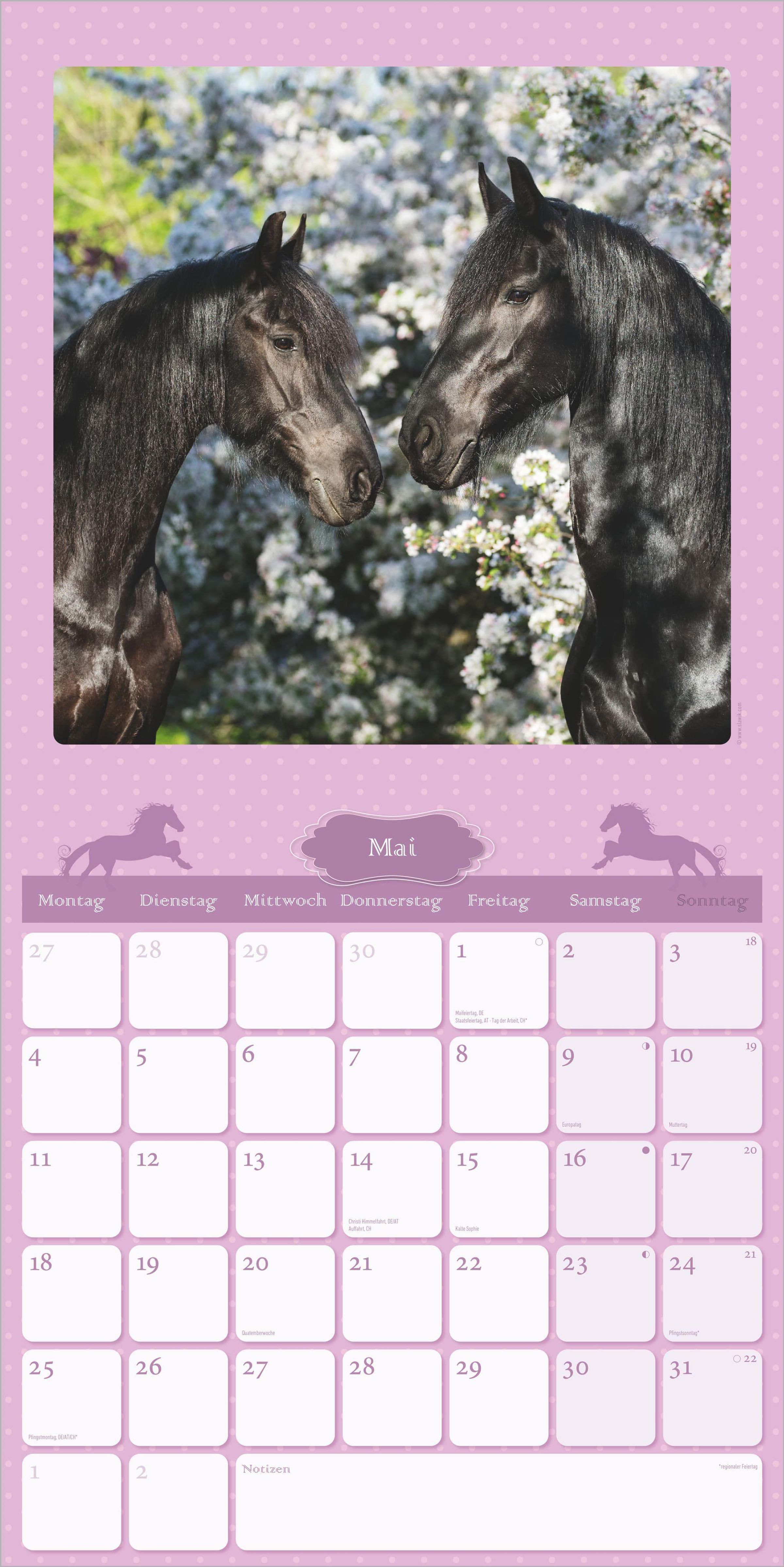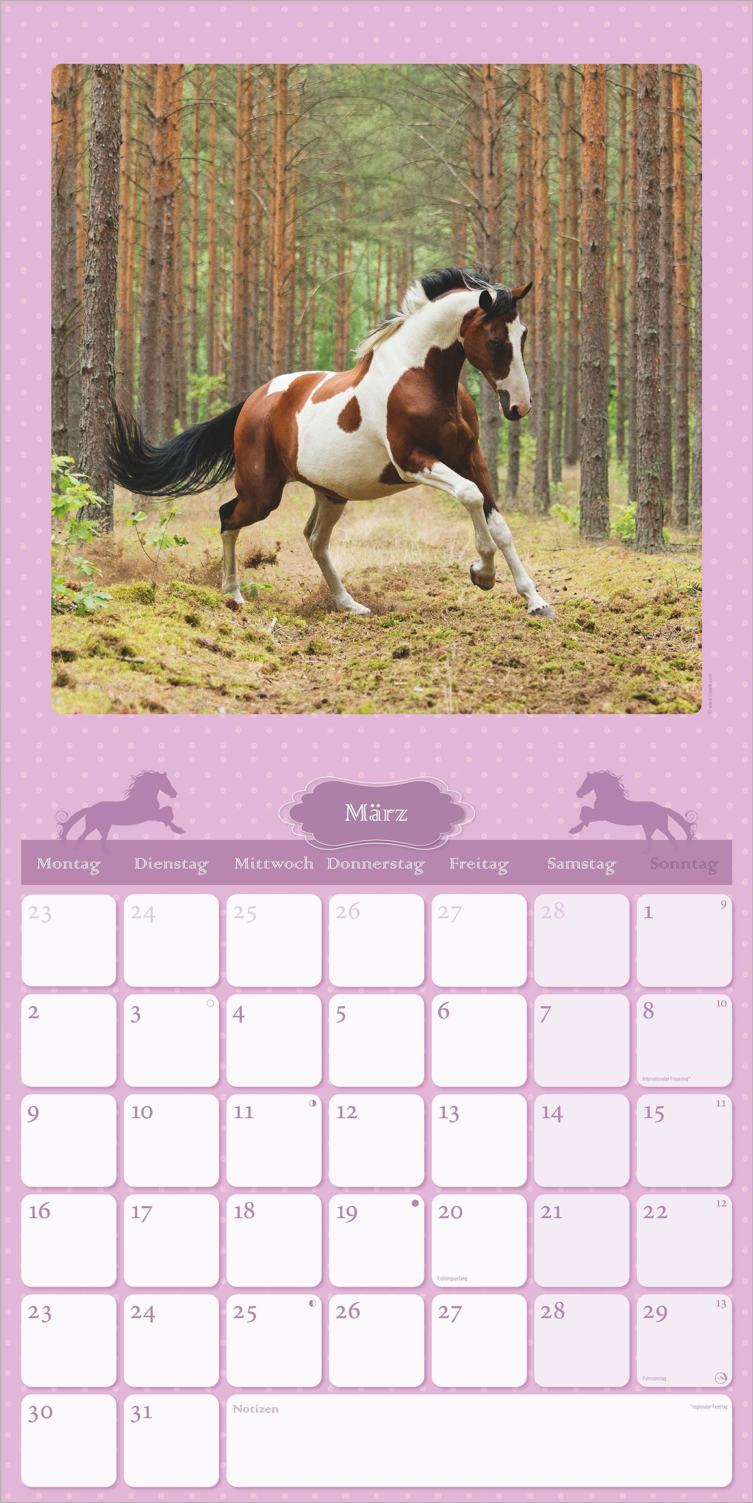 Im praktischen Format von 30 x 30 cm (aufgeklappt 30 x 60 cm) kommen die detailreichen Bilder perfekt zur Geltung. Das übersichtliche, 6-sprachige Kalendarium bietet viel Platz für persönliche Notizen, enthält Feiertage für zahlreiche Länder sowie Ferientermine für Deutschland, Österreich und die Schweiz. Eine Monatsübersicht des Vor- und Folgemonats sorgt für zusätzlichen Planungsüberblick. Als Extra ist ein schönes Pferdeposter zum Aufhängen enthalten.