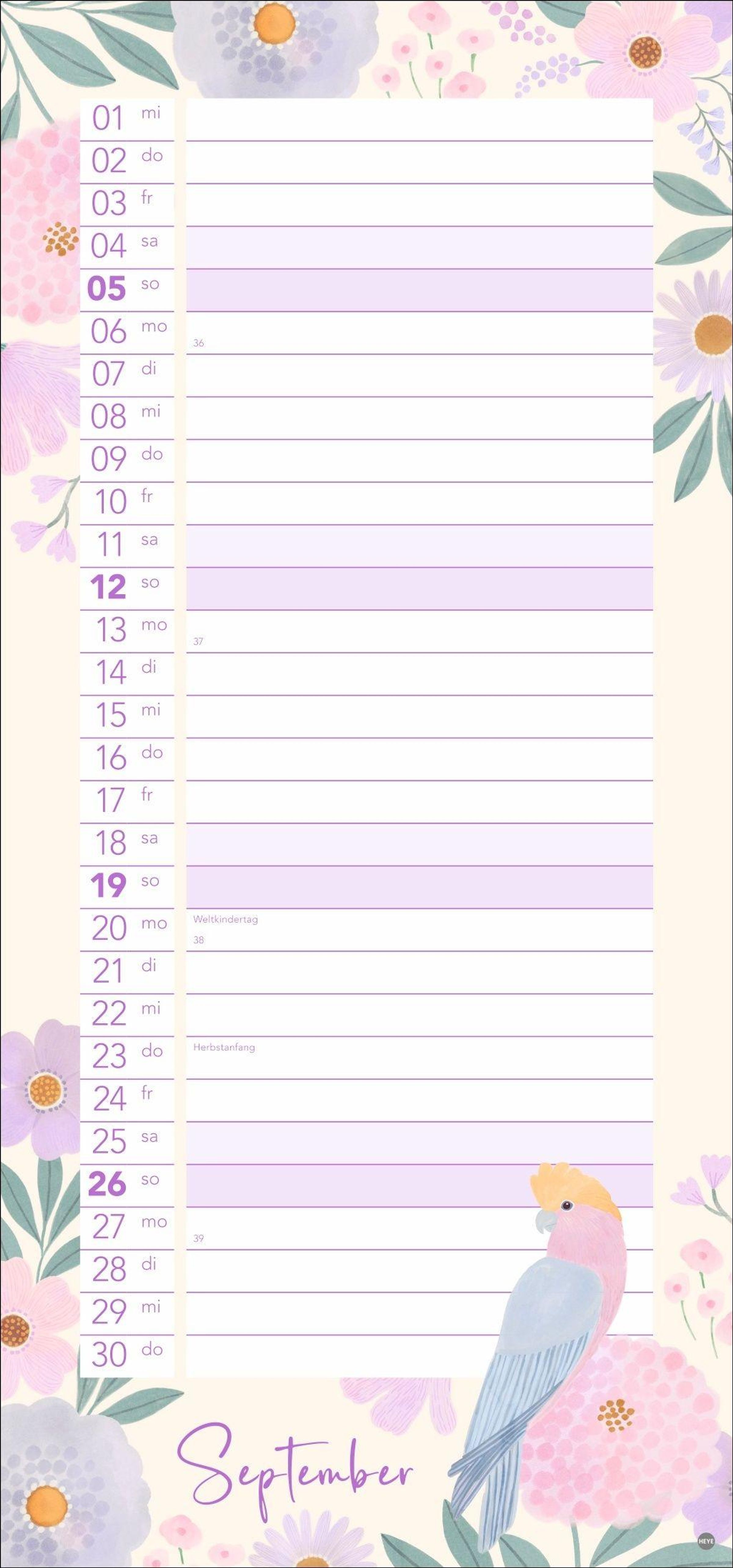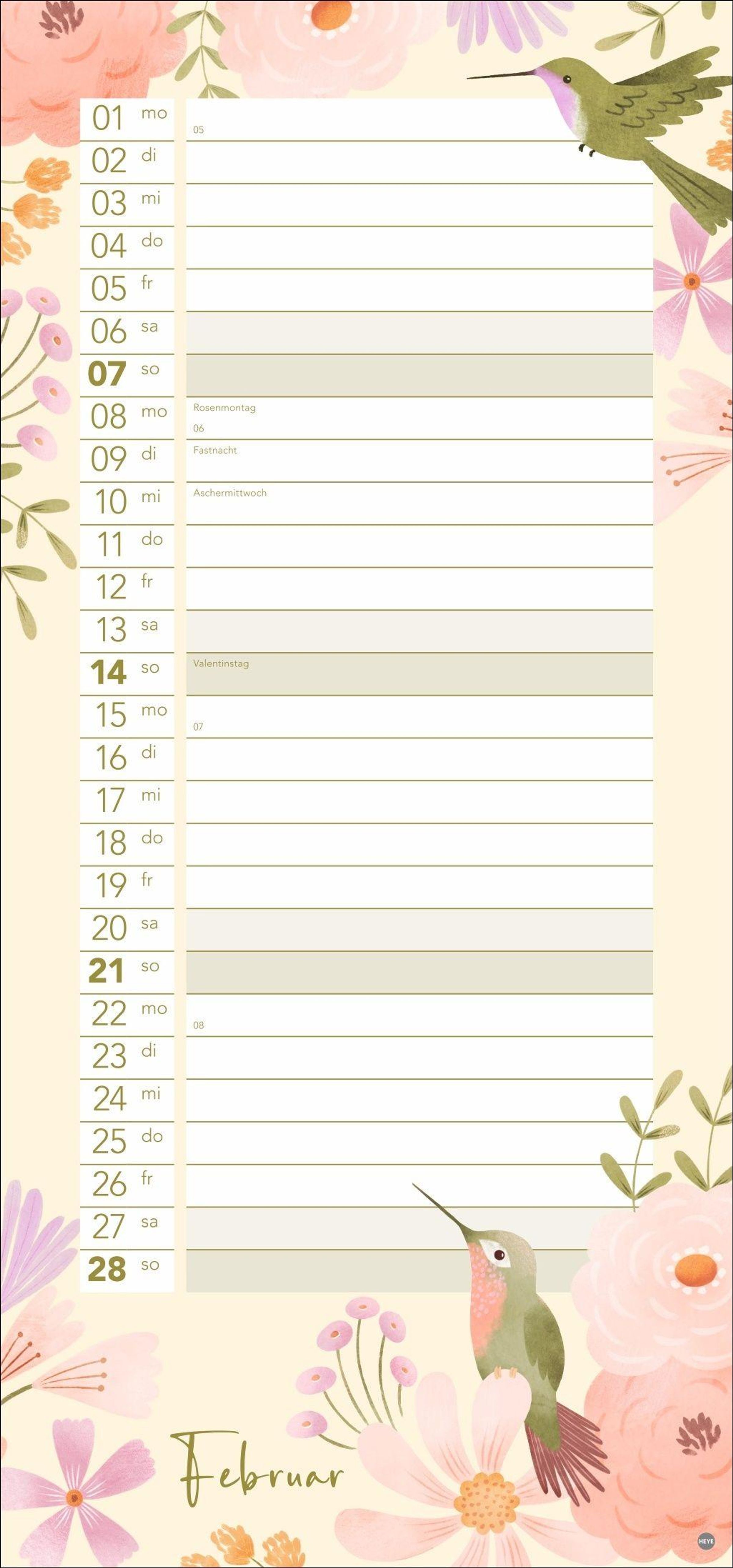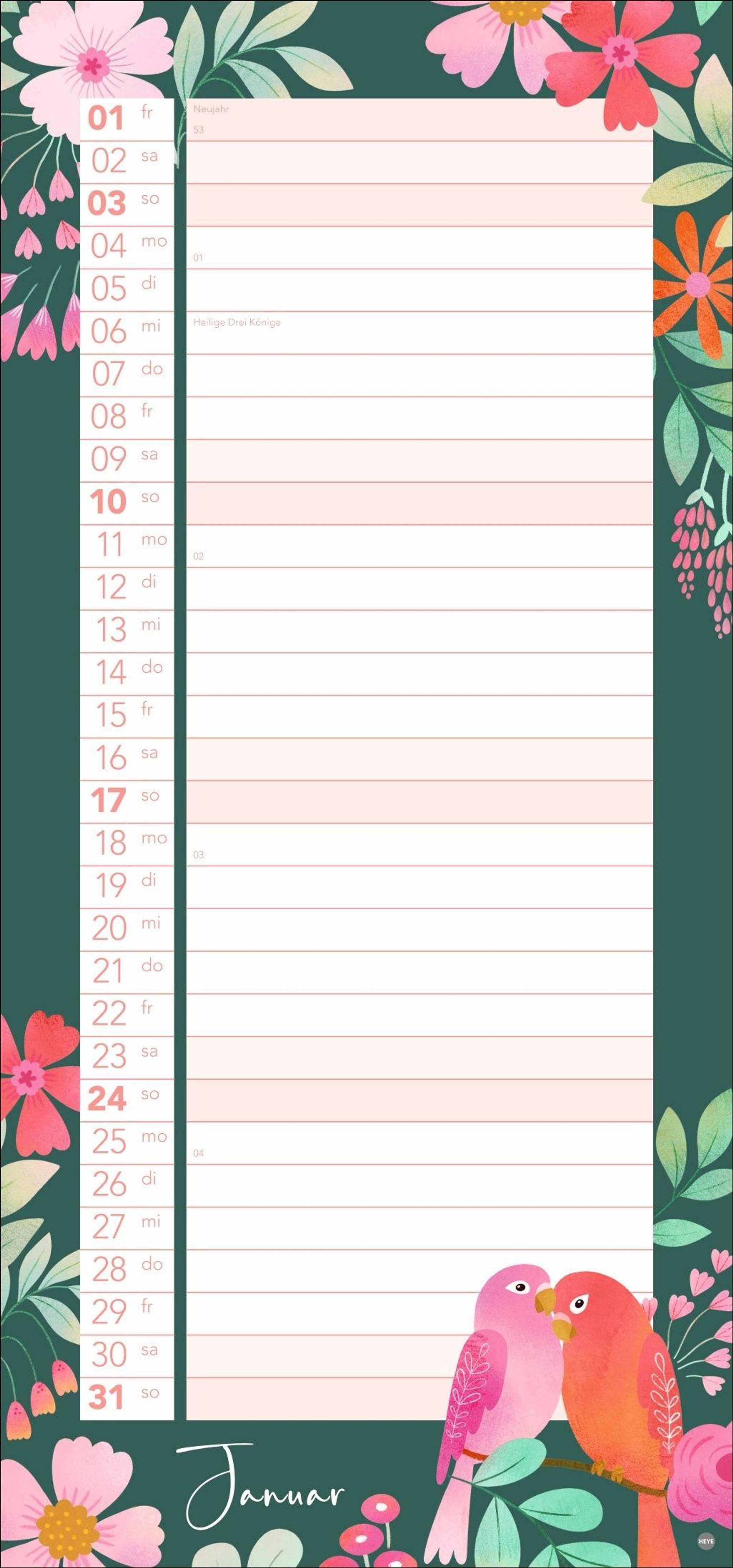 Bunte Vögel und Blumenmotive: Die Kalender-Illustrationen springen ins Auge, ohne vom Wesentlichen abzulenken