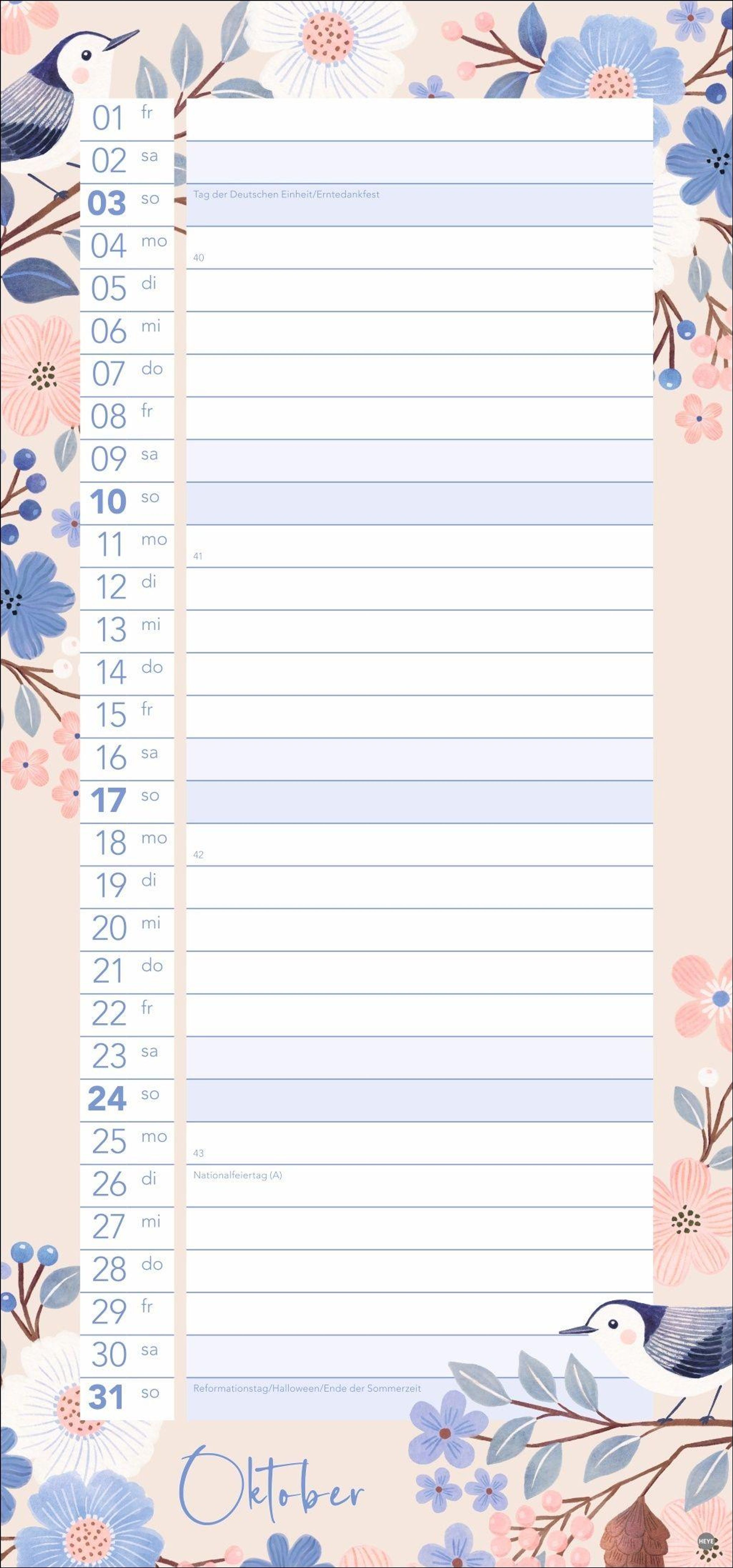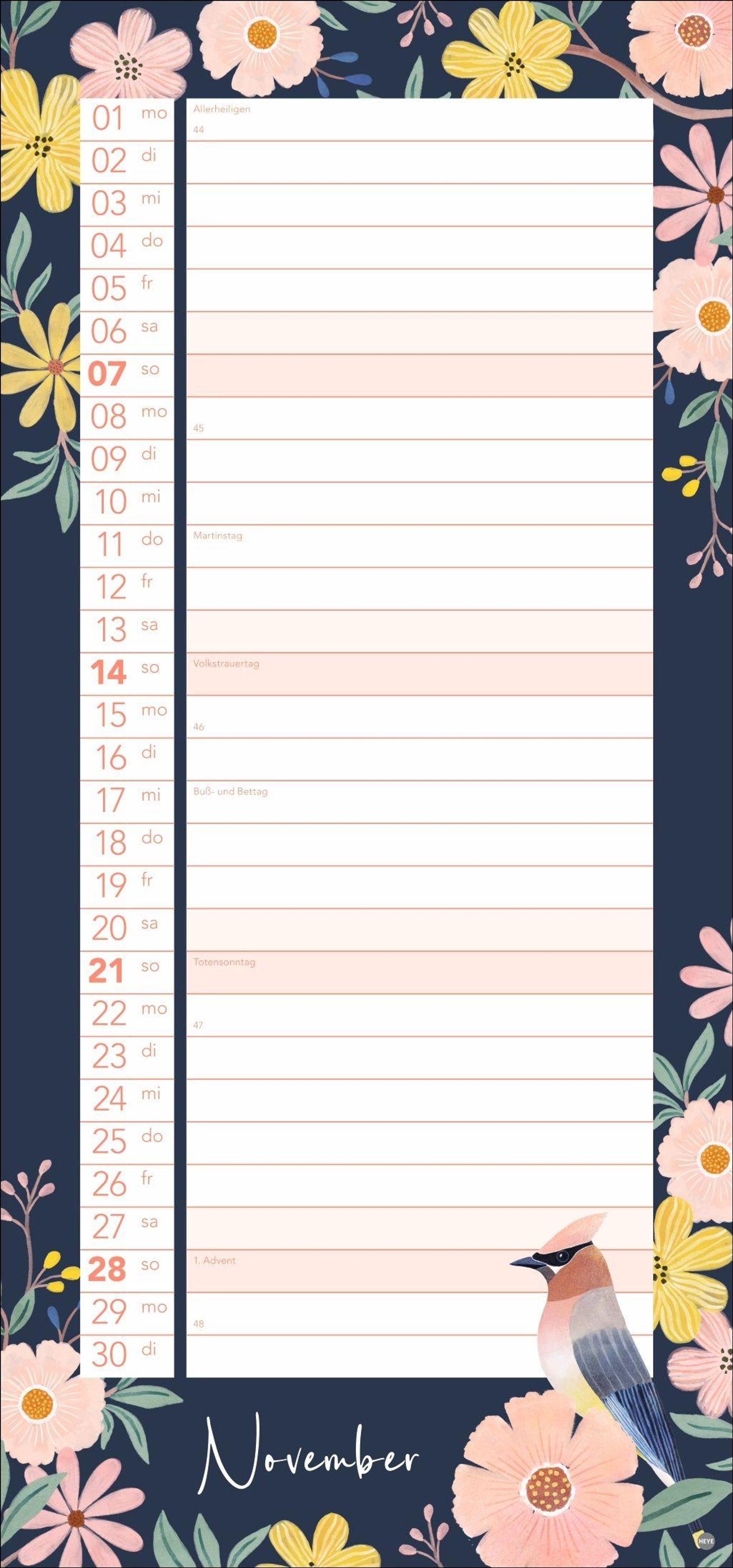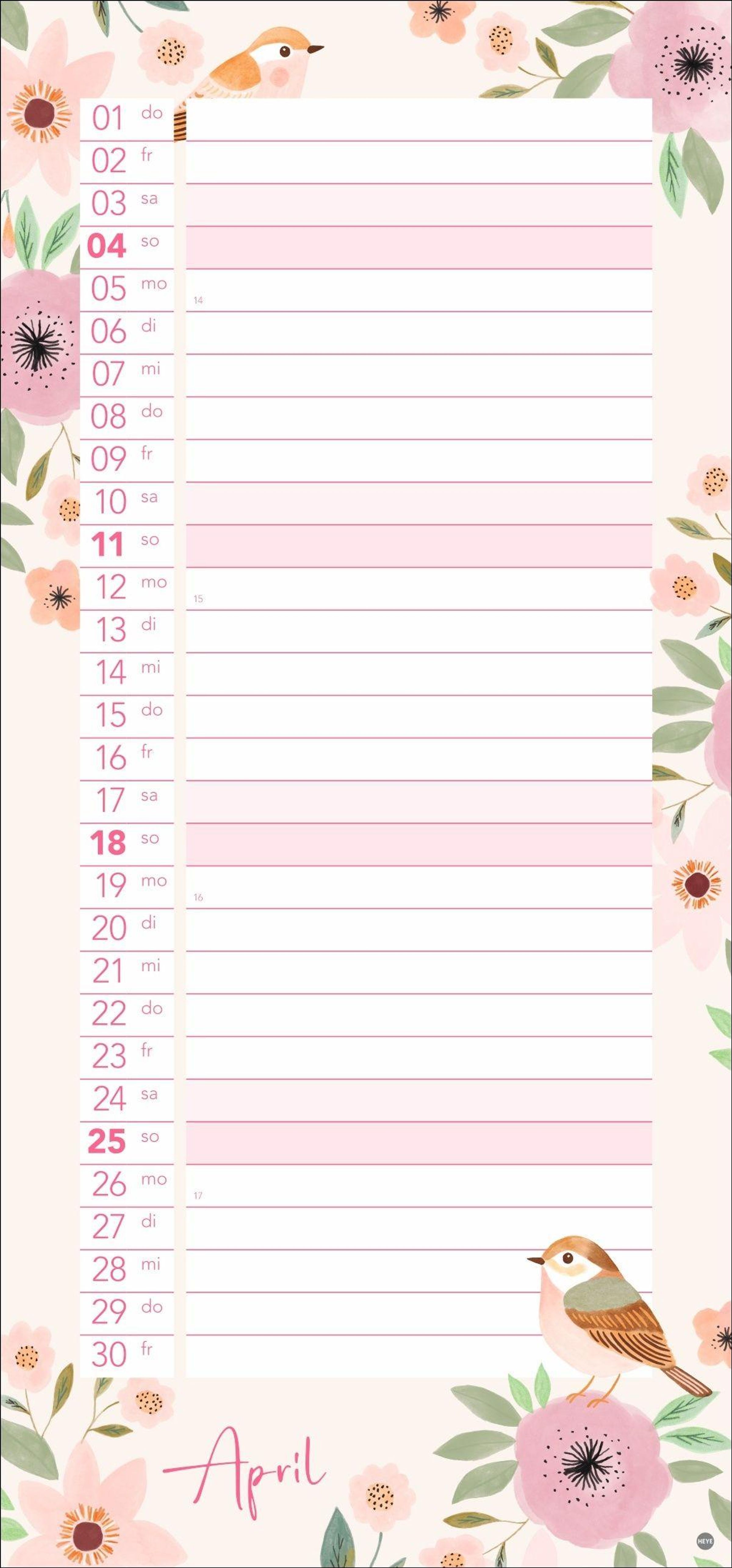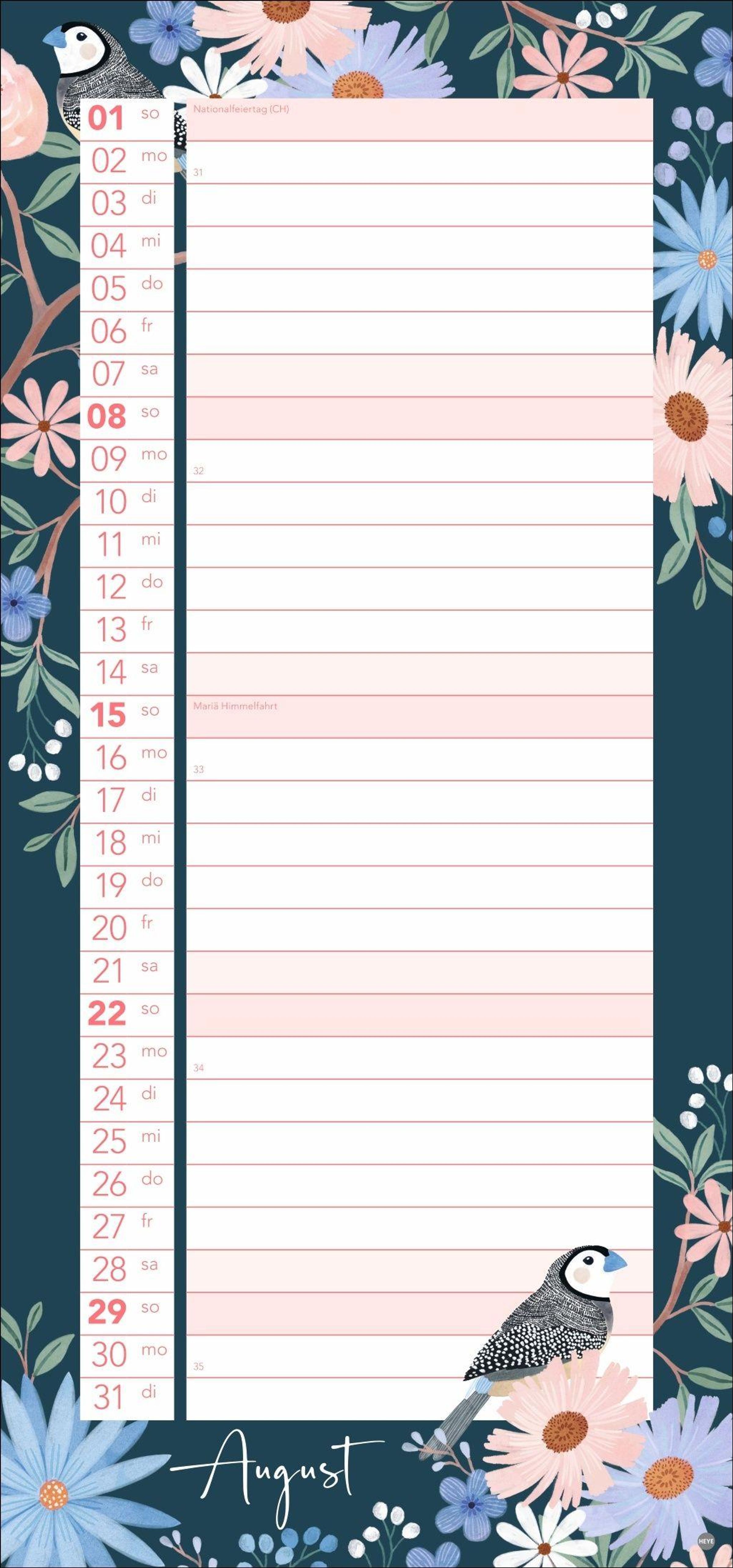 Bunte Vögel und Blumenmotive: Die Kalender-Illustrationen springen ins Auge, ohne vom Wesentlichen abzulenken