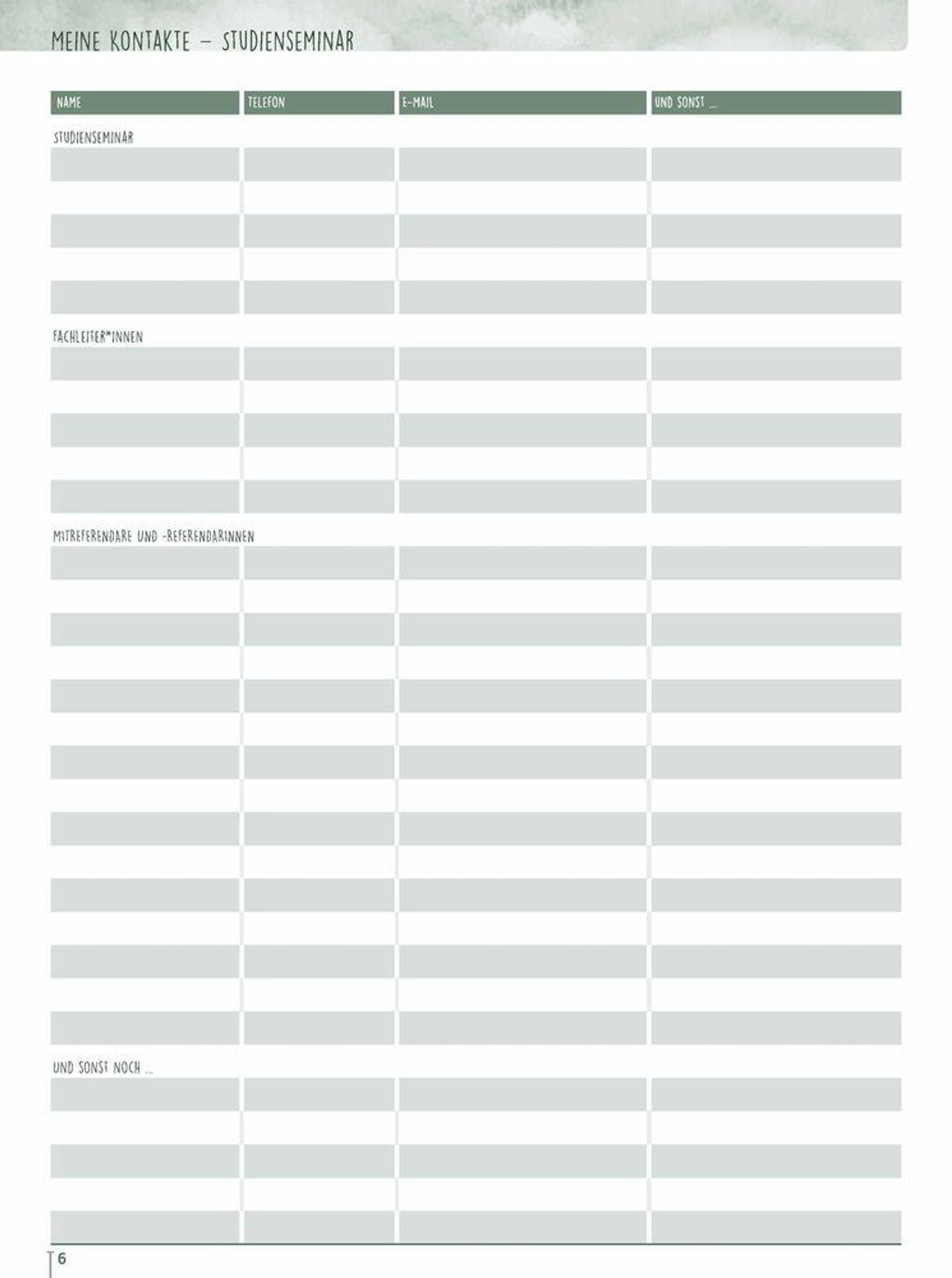 Mit unserem stylischen Lehrerkalender speziell für Referendare und Referendarinnen meistern Sie die Herausforderungen des Vorbereitungsdienstes mit links! Bei der Unterrichtsplanung bietet der Kalender fürs Referendariat viel Platz für jede Schulstunde und Raum für wichtige Notizen. Klassen- und Notenlisten, Stundenpläne sowie eine Monatsübersicht helfen Ihnen dabei, alles Wichtige im Blick zu behalten. Mit den Vorlagen zur Stundenreflexion gehen Sie gut organisiert in jede Lehrprobe und haben alle Besuche gesammelt in Ihrem Referendariatsplaner.