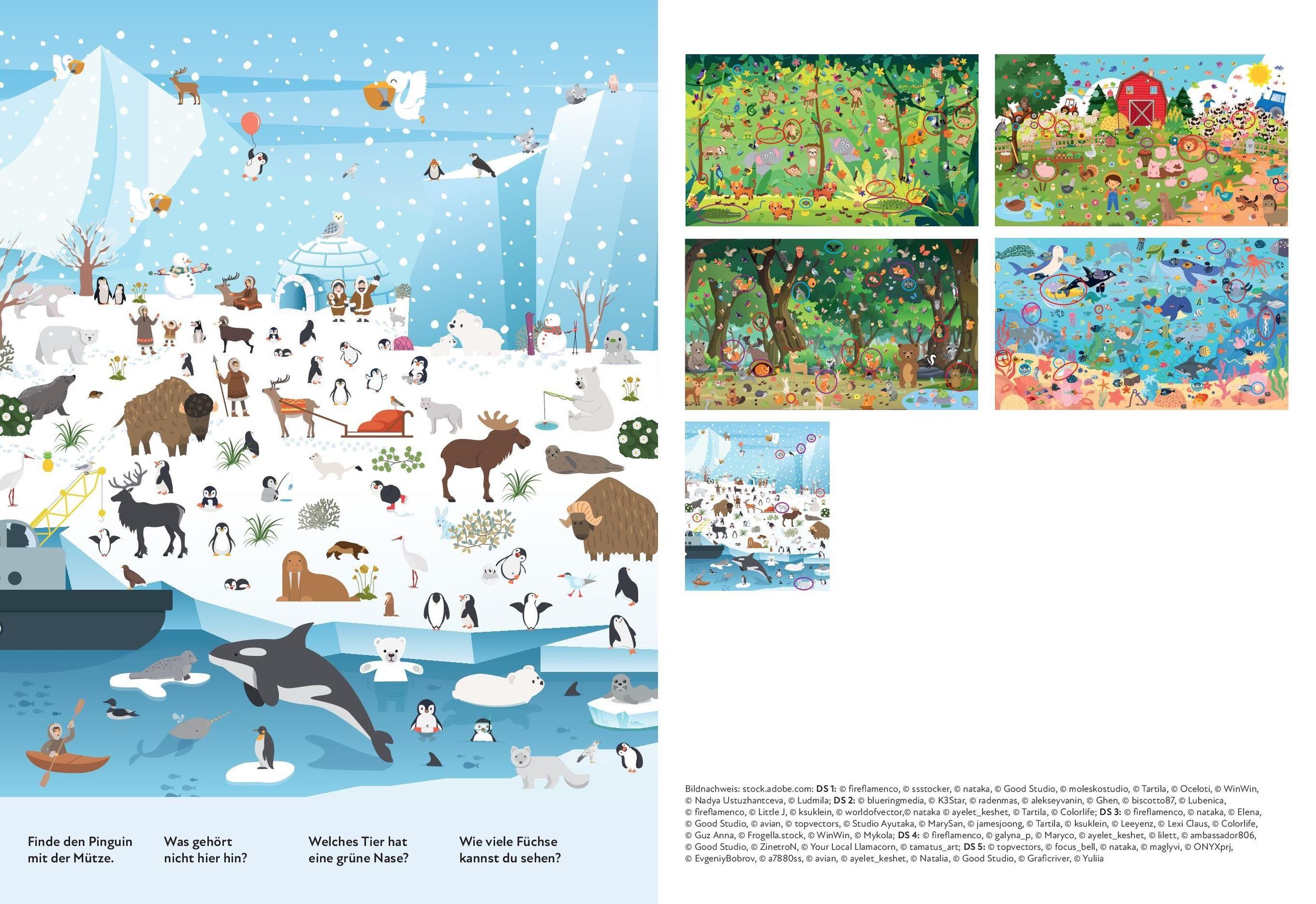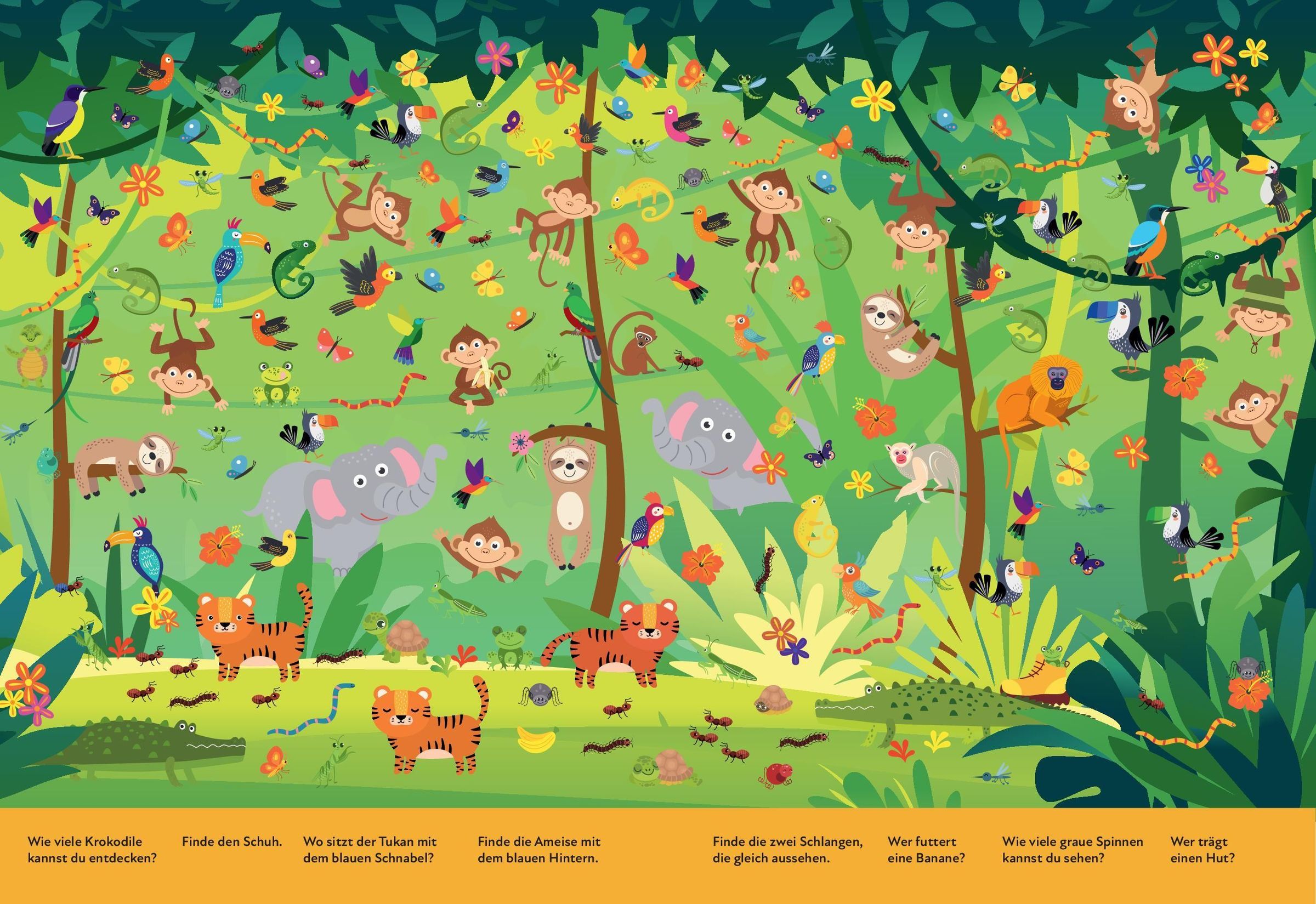 Ob im Dschungel, auf dem Bauernhof, im Wald oder unter Wasser -- auf den extragroßen Wimmelseiten gibt es jede Menge zu entdecken! Findest du den Affen mit dem Hut? Wie viele Krokodile kannst du zählen? Wo sitzt der Tukan mit dem blauen Schnabel? Löse die lustigen Such- und Zählaufgaben und denke dir anschließend weitere Suchrätsel aus.