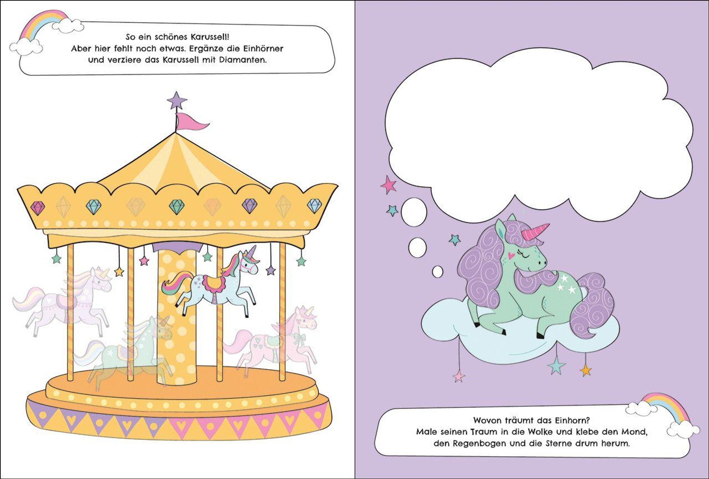 Willkommen in der Einhorn-Welt! Wer gewinnt das große Rennen? Und wovon träumt das kleine Einhorn? Nutze die bunten Sticker, um diese und viele weitere lustige Einhorn-Rätsel zu lösen. Das macht ganz viel Spaß und hilft garantiert gegen Langeweile!