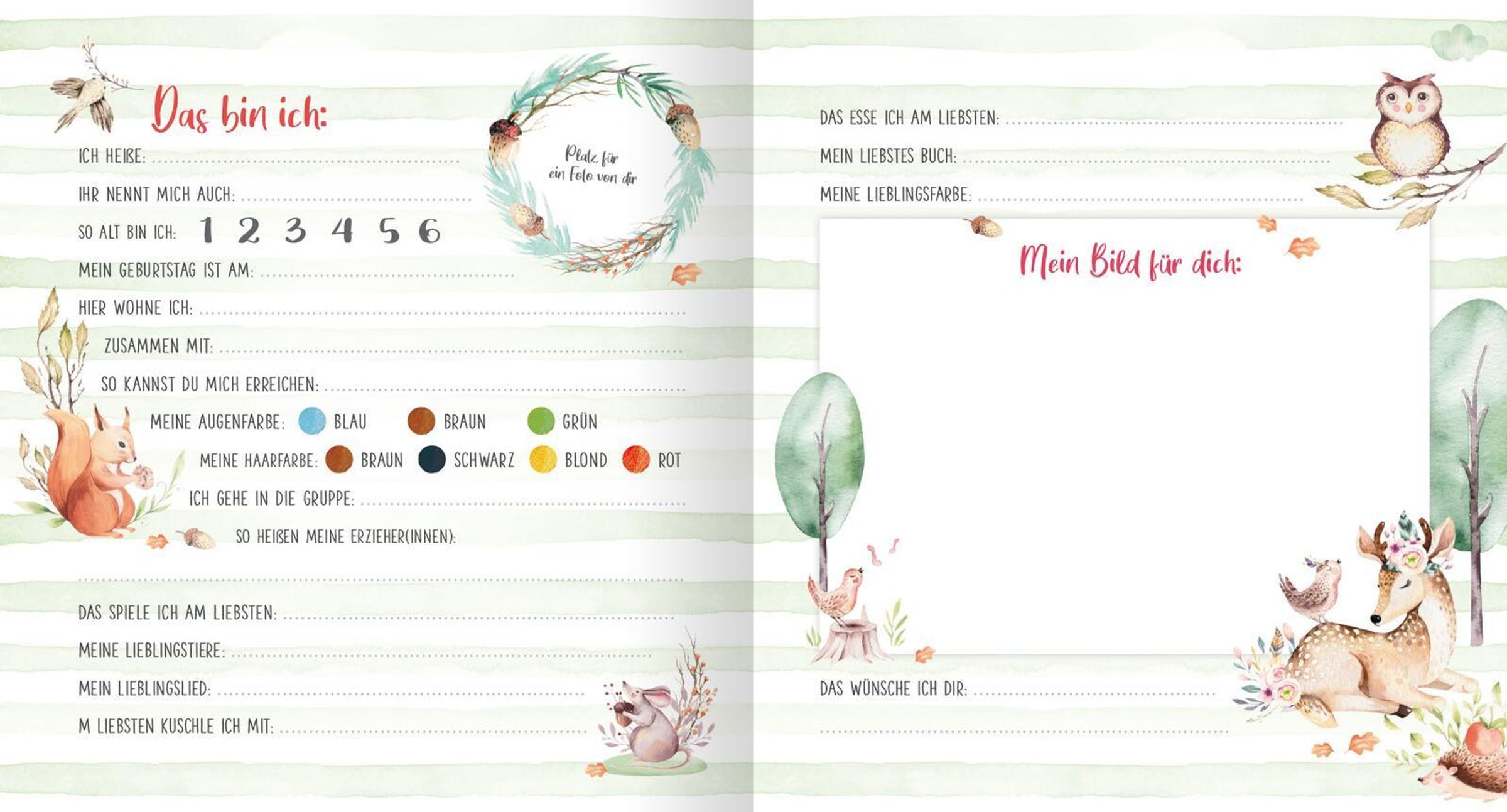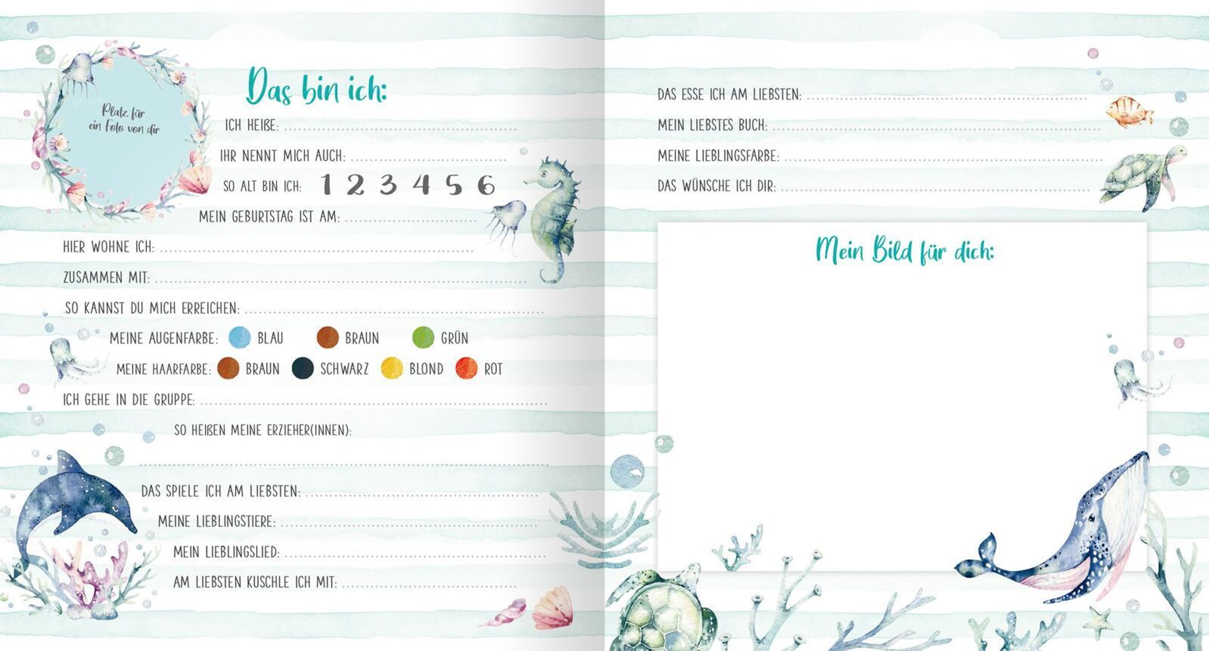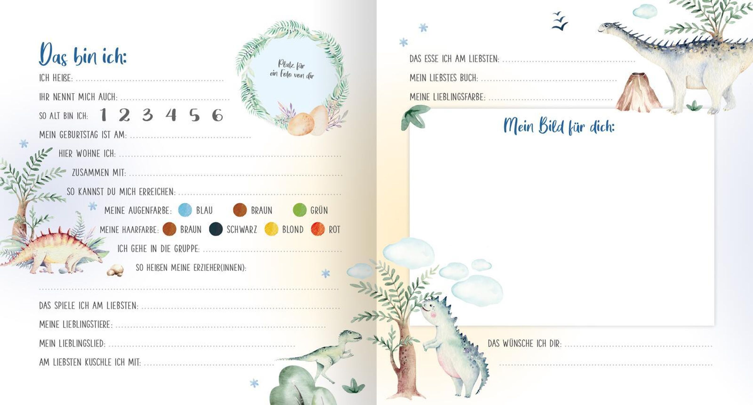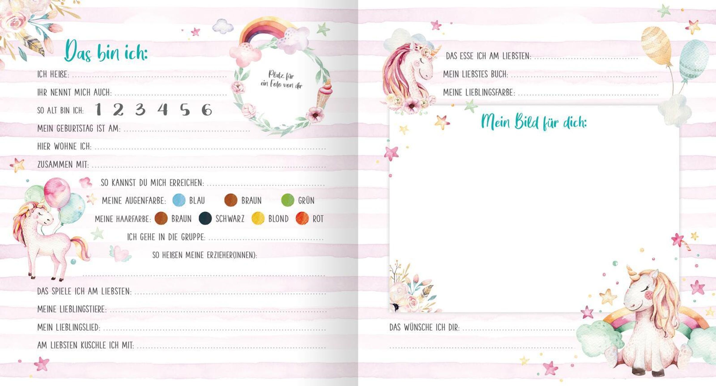 Bei diesem Freundschaftsbuch können sogar schon die Jüngsten mitmachen. Auf je einer Doppelseite kann jedes Kind einfache Fragen beantworten, die Augen- und Haarfarbe ankreuzen und ein buntes Bild malen. Das handliche Format passt in jede Kitatasche und dank des robusten und abwischbaren Materials hält das Album viele Kinderjahre lang.