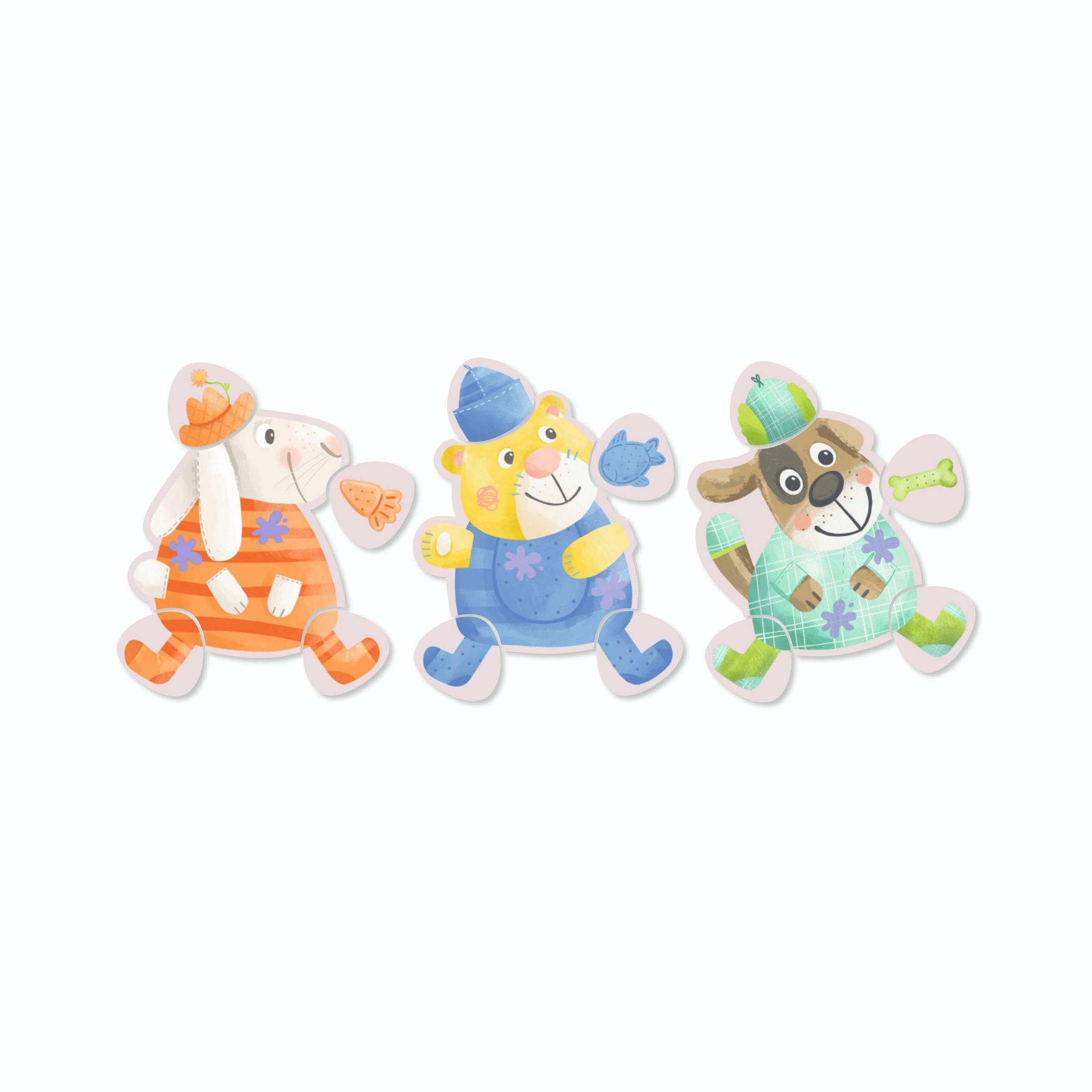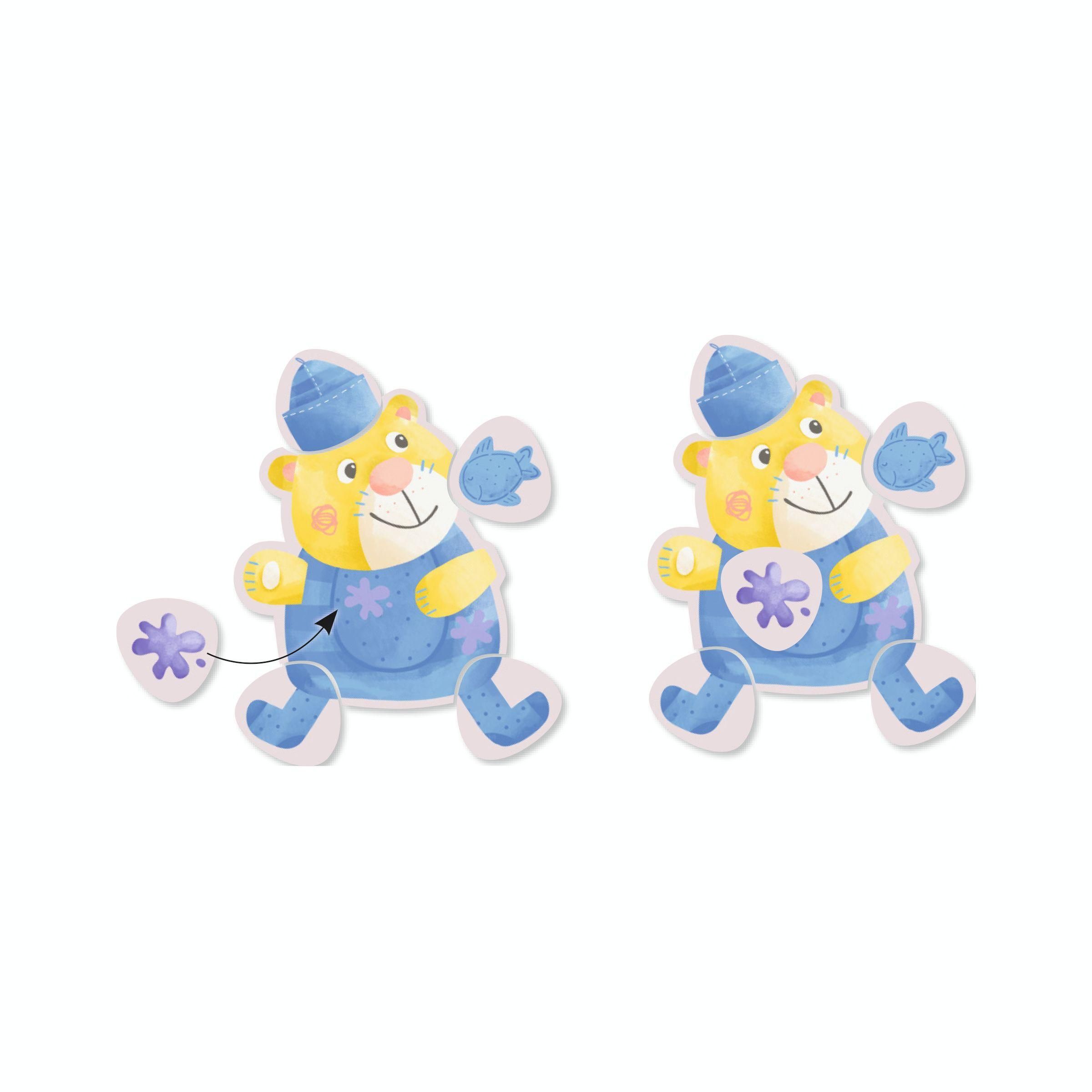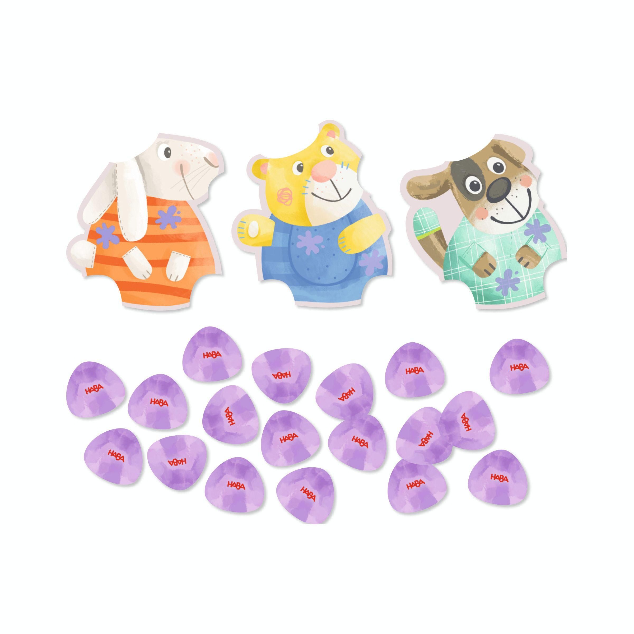 Die Kinder helfen den Kuscheltieren beim Anziehen und füttern sie mit einem Keks. Doch Vorsicht vor den Flecken! Wurden alle farblich passenden Dinge angelegt, bevor alle Flecken aufgedeckt sind, gewinnen sie gemeinsam.