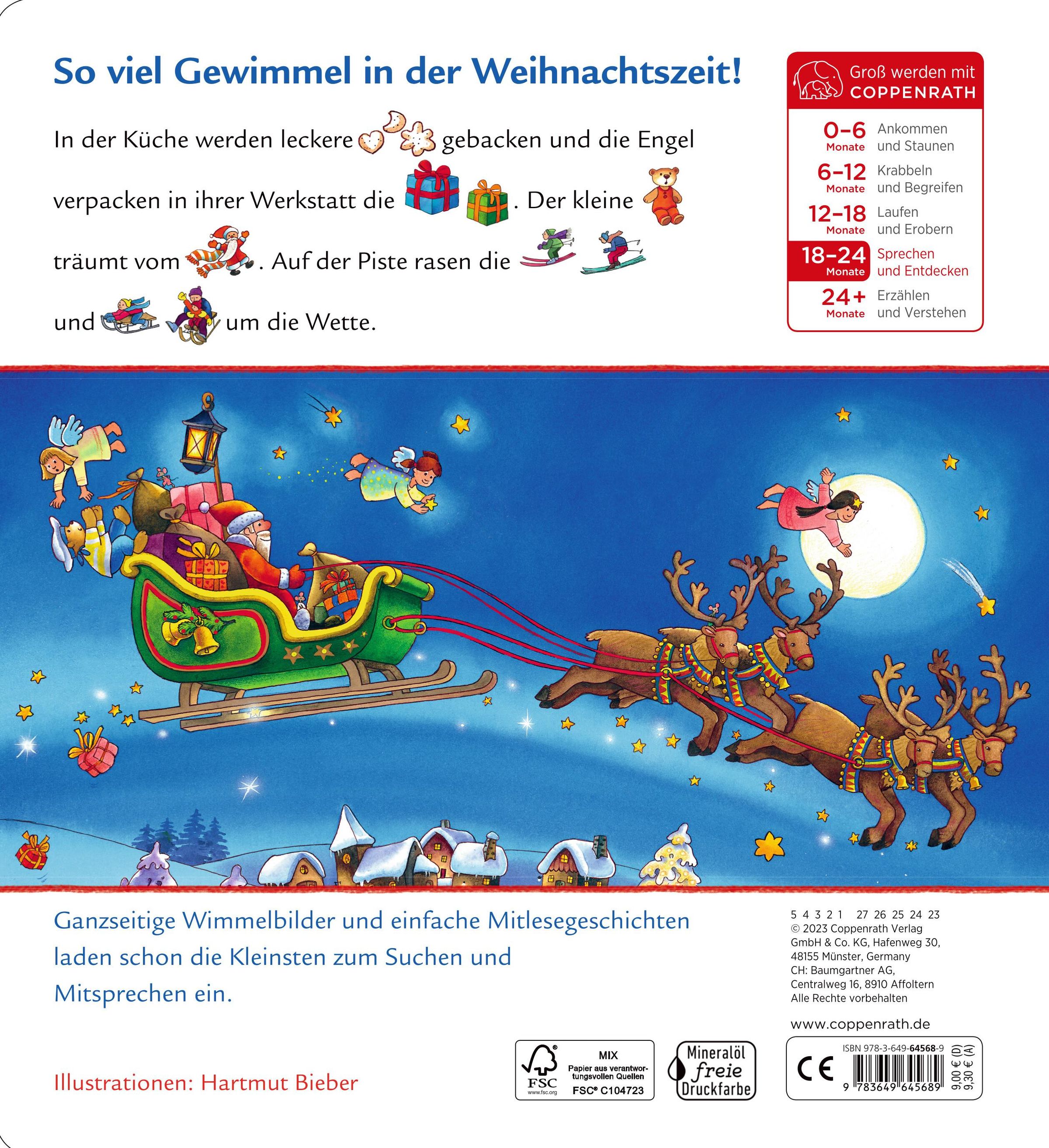 In der Küche werden leckere Plätzchen gebacken und die Engel verpacken in ihrer Werkstatt die Geschenke. Der kleine Bär träumt vom Weihnachtsmann. Auf der Piste rasen die Skifahrer und die Schlittenfahrer um die Wette. Ganzseitige Wimmelbilder und einfache Mitlesegeschichten laden schon die Kleinsten zum Suchen und Mitsprechen ein.