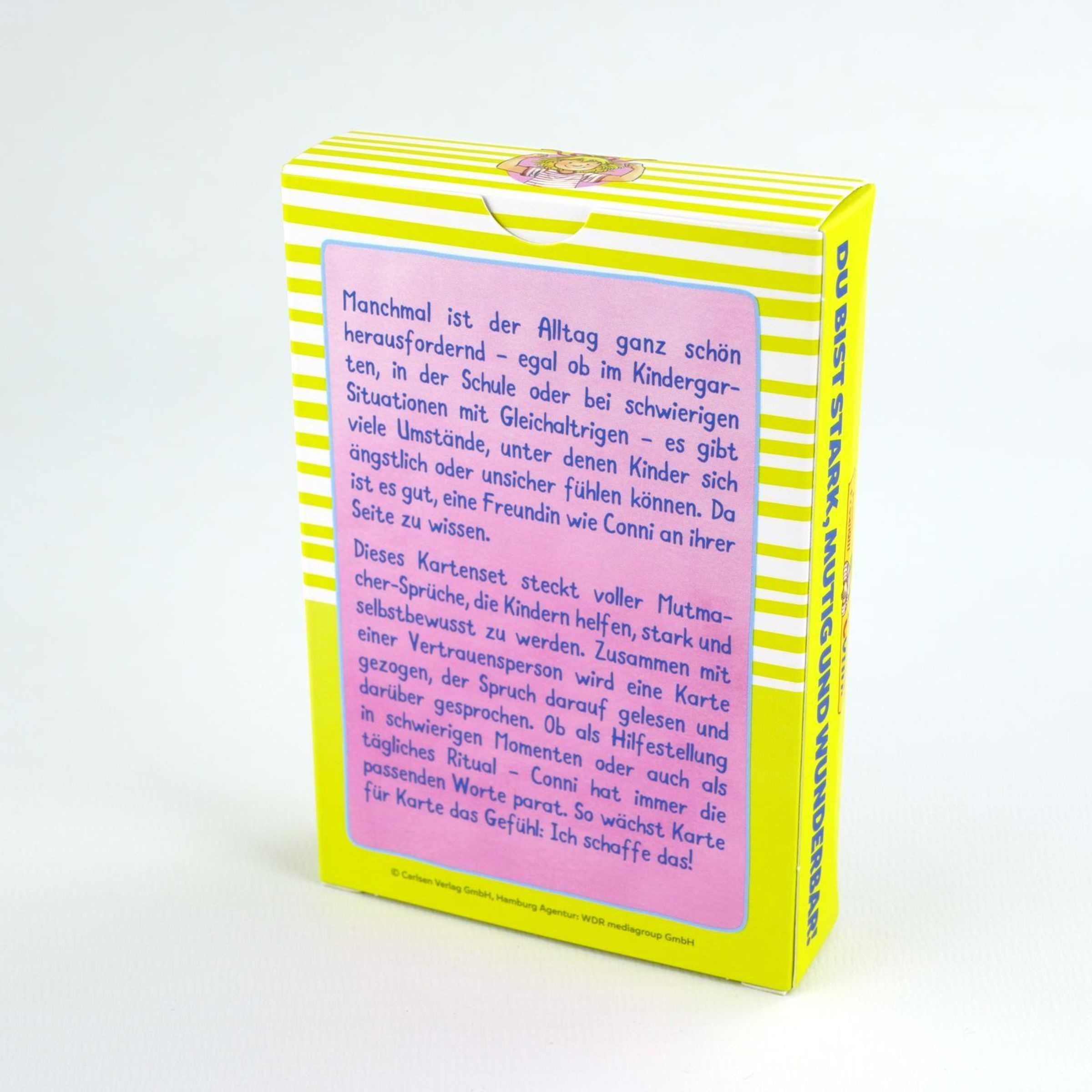 Herausforderungen in Schule oder Kindergarten, die Höhen und Tiefen des Alltags, schwierige Situationen mit Gleichaltrigen - es gibt viele Umstände, unter denen Kinder sich ängstlich oder unsicher fühlen können. Aber ihre Freundin Conni ist schon zur Stelle und bringt mit diesem Kartenset viele Mut machende Sprüche und Impulse mit, um Kindern ab 4 Jahren mehr Selbstvertrauen und Mut zu geben. Zusammen mit ihren Eltern können die Kinder eine Karte ziehen, den Spruch darauf lesen und darüber sprechen. Sie können als Hilfestellung in einer akuten Situation oder auch als tägliches Ritual verwendet werden. Mit jedem Impuls wachsen Kinder in ihrem Selbstbewusstsein und entdecken Karte für Karte ihre innere Stärke.