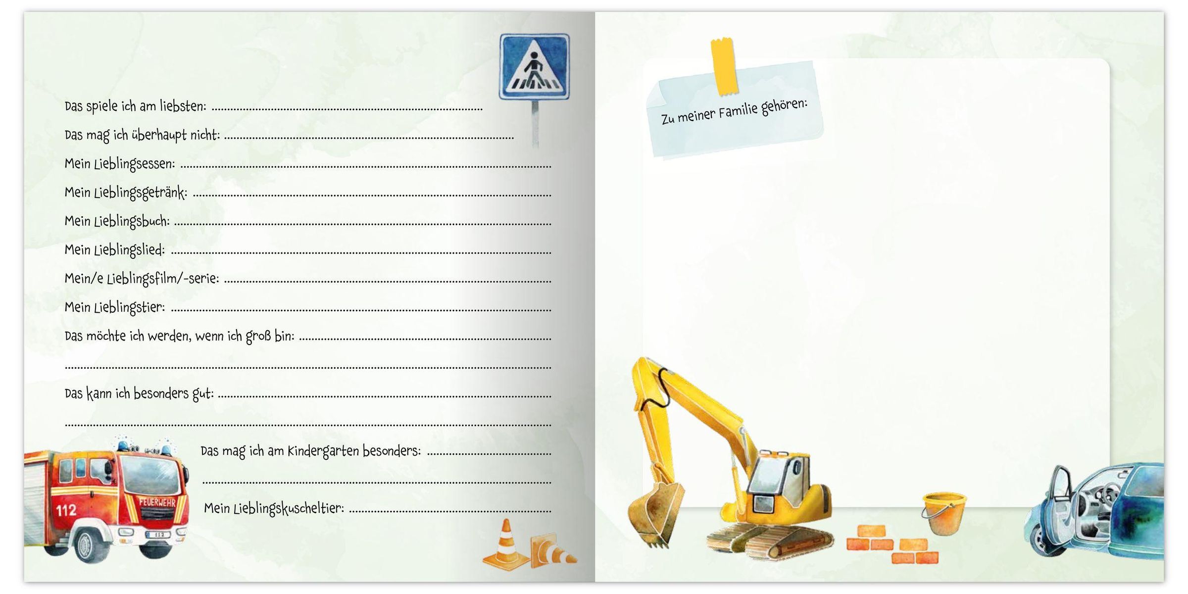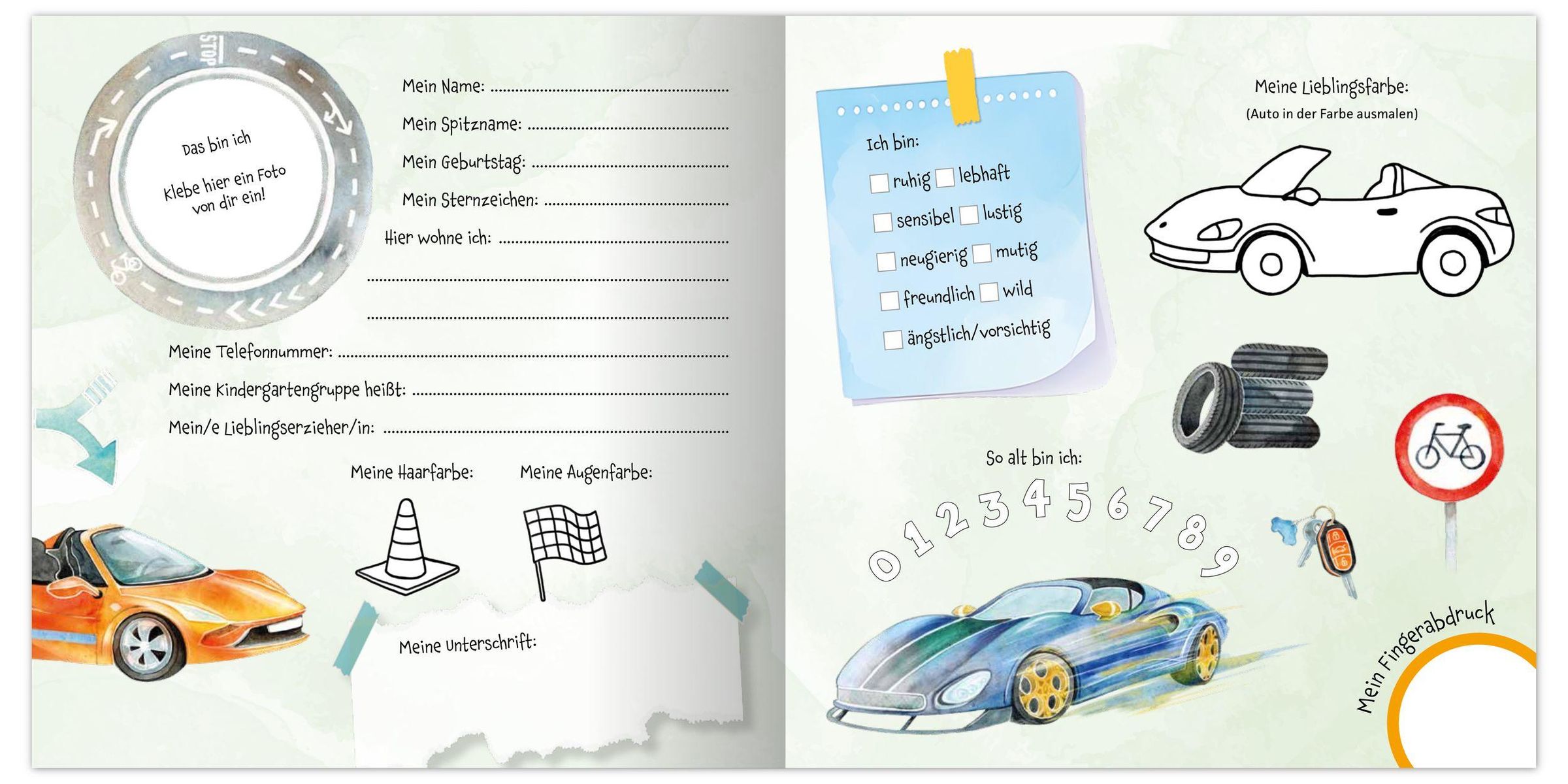 Dieses liebevoll gestaltete Freundebuch für kleine Auto- und Fahrzeug-Fans bietet viel Platz für persönliche Einträge: Hobbys, Lieblingsessen, Lieblingstiere und sogar kleine Ausmalbilder warten darauf, entdeckt zu werden. So können sich alle Kindergartenfreunde kreativ verewigen - mit Stiften, Stickern, Fotos oder Wasserfarben.