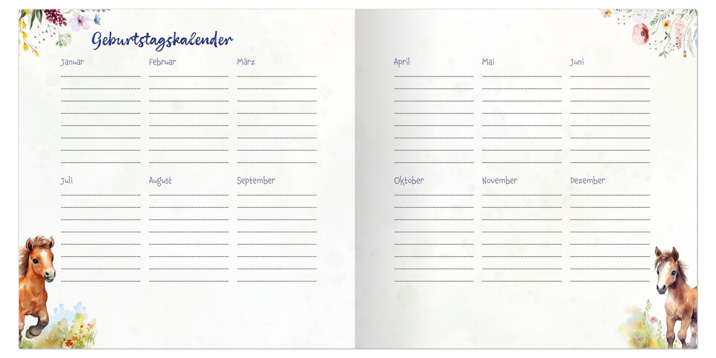 Dieses Freundebuch ist besonders schön für Kinder, die Pferde lieben: Auf jeder Seite galoppieren fröhliche Pferde und Ponys und begleiten die Einträge der Freunde.