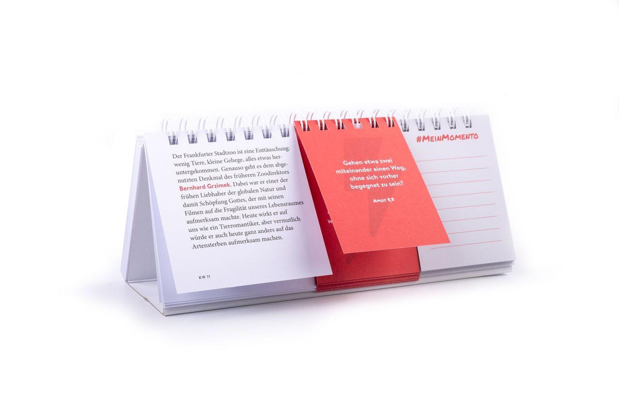 Zeit für einen Neuanfang: Der bisherige momento Kalender verabschiedet sich und wird abgelöst von einem ganz neuen Tischkalender - dekorativ und inspirierend für Schreibtisch, Fensterbank oder Nachttisch. #meinMomento - das heißt: Neue Ideen, neue Inhalte, neue Aufmachung. Aber immer noch ein Kalender, der Menschen im stressigen Alltag auf zeitgemäße Weise das Angebot macht, einen kurzen spirituellen Impuls mitzunehmen, der sie anspricht, an Gott erinnert und zum selber Denken herausfordert.